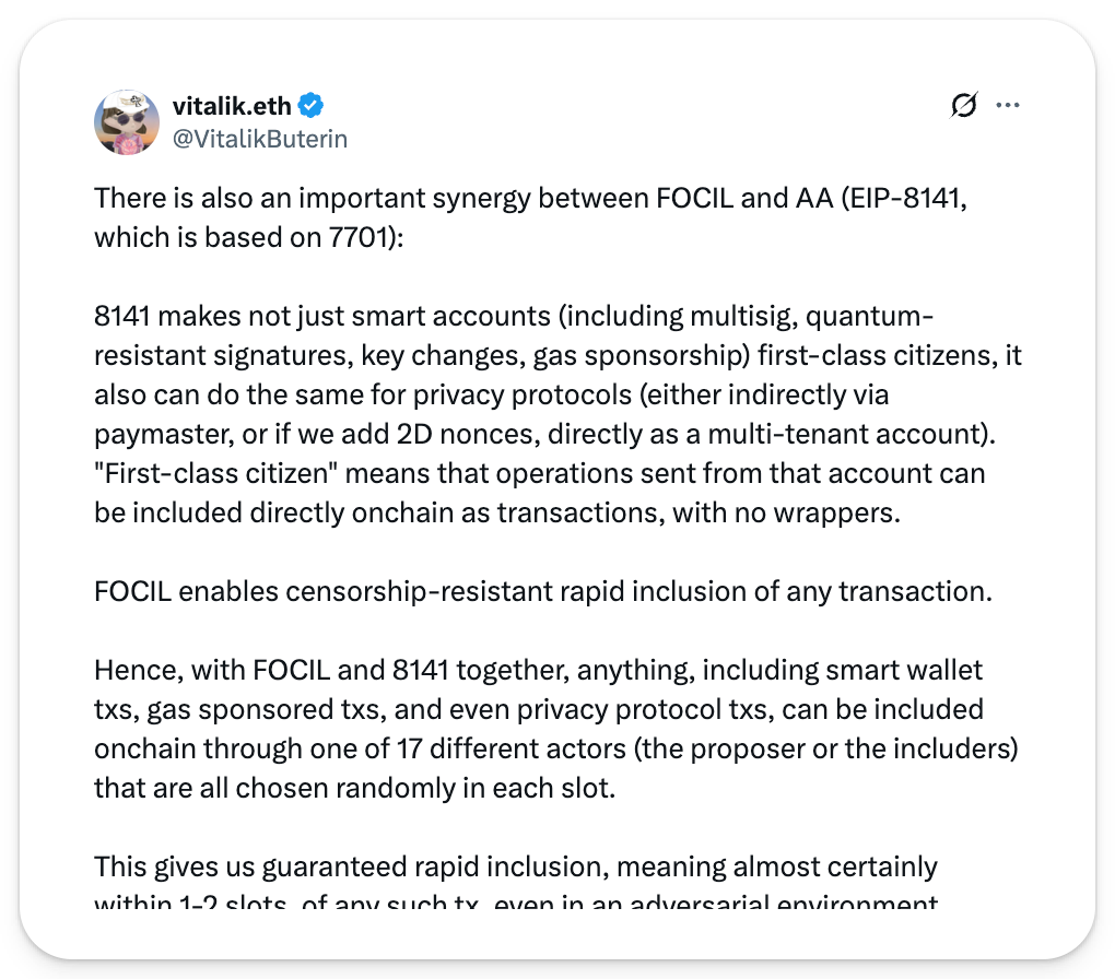 That's no small praise from someone who understands FOCIL as well as just about anyone, but if you're still catching up on what FOCIL means for Ethereum, then let's run through the basics. The Problem FOCIL SolvesIn Ethereum today, the right to build blocks has largely been auctioned off to specialized entities called builders, via "out-of-protocol" proposer-builder separation (PBS). Accordingly, many Ethereum validators typically don't build the blocks they propose. Instead, they accept pre-built blocks from external builders who compete to offer the highest fees. The result of this dynamic? A handful of sophisticated builders dominate block production. This model is economically efficient, but it introduces censorship risk: a builder that refuses to include certain transactions, whether for regulatory reasons or otherwise, can keep those transactions off the chain. And since a small number of builders win the vast majority of blocks, a coordinated refusal across some of them could meaningfully delay or deny inclusion for targeted users or apps. FOCIL is Ethereum's answer to that problem. How FOCIL WorksWhile the underlying details are quite technical, FOCIL's mechanism is fairly straightforward. For each Ethereum slot, a committee of 16 validators is pseudorandomly selected as "inclusion list (IL) committee members." These validators each independently scan the public mempool and assemble a short list of pending transactions they think should be in the next block. Each list is capped at 8 kilobytes. Every committee member broadcasts their list across the network early in the slot's formation. The proposer of the next block and Ethereum attesters then collect these lists. The proposer must construct a block that satisfies the transactions across all of the ILs it received. Conversely, attesters will only vote for a block that includes the IL-specified transactions. If a block skips valid IL transactions that could have fit, attesters won't attest to it and the block won't become canonical. This is what "fork-choice enforced" means. The inclusion requirement isn't a social norm or a gentleman's agreement. It's wired into the fork-choice rule itself. Under this paradigm, skipping IL transactions will be a protocol violation that gets your block ignored. Why FOCIL MattersThe out-of-protocol PBS reality today means a hostile builder or a set of colluding ones can suppress any transaction or class of transactions they want. FOCIL will be a shield against this kind of threat. An IL committee is drawn randomly from the full validator set each slot, so censoring a transaction will now require neutralizing a rotating group of 16 validators or hoping none of the 16 includes the targeted transaction in their IL. That's a very hard guarantee to break over any window of time. There's also an important trust-minimization thrust here. Right now, users have no protocol-level recourse if a builder refuses their transaction. In other words, inclusion depends on trusting builders to behave. In response, FOCIL will remove that dependency entirely. And FOCIL will do so without touching ordering, i.e. where in the block things land. Builders will retain their economic role but lose their veto power. The Synergies to ComeThe significance of FOCIL's arrival is even bigger when you consider where it fits in Ethereum's roadmap in the context of other upcoming features. For instance, Vitalik Buterin recently highlighted how FOCIL and the "Frame Transaction" EIP-8141 proposal would be synergistic. Specifically, Vitalik noted: "[W]ith FOCIL and 8141 together, anything, including smart wallet txs, gas sponsored txs, and even privacy protocol txs, can be included onchain through one of 17 different actors (the proposer or the includers) that are all chosen randomly in each slot.