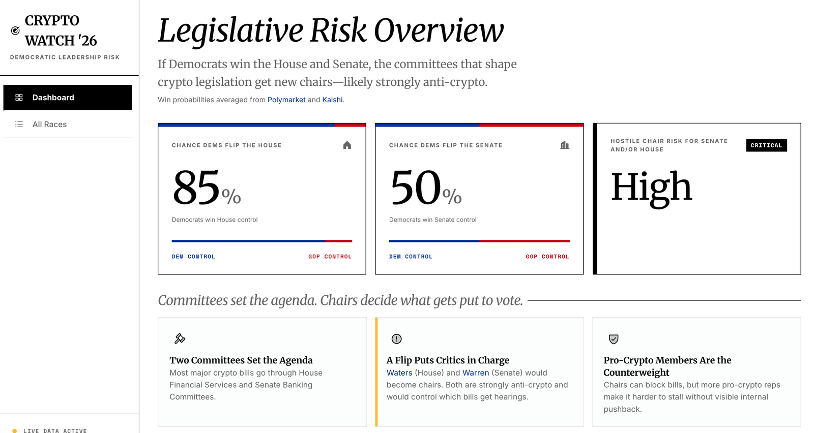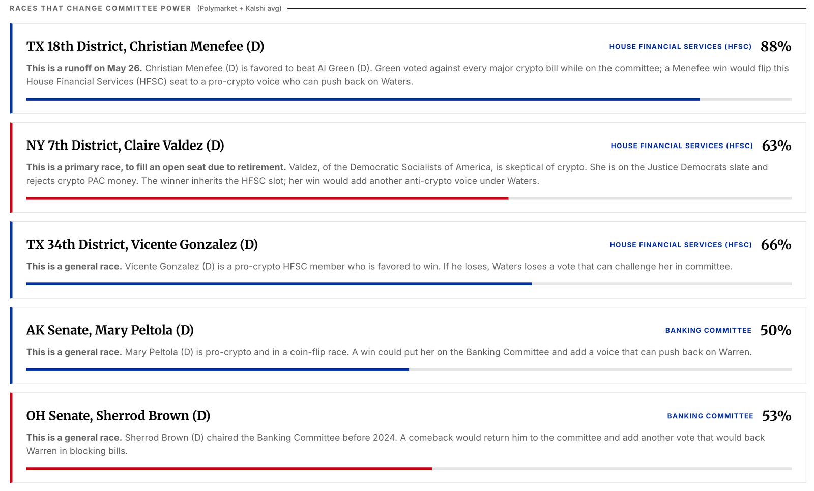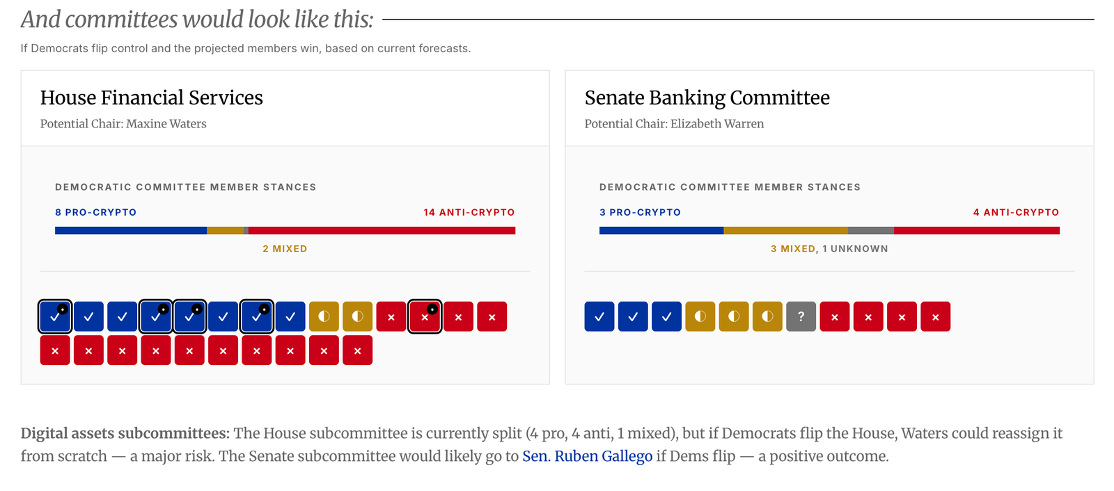 📸 Daily Market Snapshot: The war in Iran's ever-shifting vibes took a big bite out of stock markets Wednesday and sucked momentum away from ETH and BTC. | Prices as of 6pm ET | 24hr | 7d | | Crypto $2.44T | ↘ 4.5% | ↗ 2.0% | | BTC $71,288 | ↘ 4.5% | ↗ 0.8% | | ETH $2,204 | ↘ 5.7% | ↗ 6.3% | . . . ANALYSIS Mapping Out Crypto's Midterms Fate Just how bad are these midterm elections looking for the crypto industry? With increasing likelihood of a Democratic sweep across the House and Senate in the midterm elections, I wanted to take a closer look at what the existing polls are signaling for the crypto industry's future. So, to find answers, I turned to both prediction markets and resources like Stand with Crypto (SWC) – a database for candidate positions on our industry. Putting these together paired well with building a dashboard, so once I had the data, I turned to Cursor to build out the frontend, Claude Code to stitch the logic, and Vercel for final deployment. While I’m still filling in gaps in the data, I've now built out a database tracking most races where Democratic candidates are leading mapped to their crypto stance and committee implications. This has helped form an initial picture of what the policy landscape may look like in a few months – workable on the surface, but hosting some deep structural issues on closer examination. The Surprising PartFirst off, there's more Democratic support for crypto than you might expect, at least on some bills. In the House, 101 Democrats (roughly 48% of the caucus) voted for the GENIUS Act. In the Senate, 18 Democrats (40%) voted to advance it to passage. That's a real coalition. But it's bill-specific, and it evaporates when it comes to the committees: the places where legislation effectively begins. This is a problem. Where Leverage Comes FromCrypto legislation never goes straight to the floor. Stablecoins, market structure, SEC authority: all of it must pass through committee first. House Financial Services (HFSC) and Senate Banking are the two rooms where crypto bills live or die (market-structure bills also require input from the Agriculture Committees for the CFTC side). Chairs decide what gets hearings, what reaches markup, and what quietly expires in procedural limbo. A chair who opposes a bill doesn't need a vote to block it, they can simply choose not to schedule it. Recent Republican chairs have demonstrated how this authority can be used to move legislation forward. Senate Banking Chairman Tim Scott advanced the GENIUS Act out of committee and helped guide it to Senate passage. Former House Financial Services Chairman Patrick McHenry championed FIT21, the first major crypto market-structure bill to clear the House. Current House Financial Services Chairman French Hill has continued that momentum, advancing related market-structure efforts like the CLARITY Act through the House (though it remains stalled in the Senate) and holding ongoing hearings on digital assets and capital markets modernization. Now, let’s consider what happens if Democrats sweep. The majority party controls every committee chair in Congress. No exceptions. If Democrats flip the House, they will chair every House committee. If they flip the Senate, they will chair every Senate committee. Within the majority party, chairs are typically chosen by seniority. As you may know, both have voted against every major crypto bill they've encountered. Warren led objections to the GENIUS Act during markup, on the grounds of it posing “threats to our national security." Waters called it, “a full-scale crypto con.” And here's the key dynamic for the House: when party control flips, subcommittees fully reset. The majority gains influence over freshman assignments and overall ratios. Waters would have significant influence in assigning representatives to HFSC seats and subcommittees: including who leads Digital Assets. Sure, she can't pick every single member solo (leadership and caucus have input), but she'd easily steer it toward her preferred anti-crypto voices. The existing Democratic bloc on HFSC already skews hostile: Brad Sherman, Stephen Lynch, Emanuel Cleaver, Sylvia Garcia. Pro-crypto members like Jim Himes, Bill Foster, Ritchie Torres, Josh Gottheimer, and Vicente Gonzalez can resist, but under a Waters chairmanship, they don't control the calendar. Senate Banking looks slightly better. Warren as chair, but with a mix of pro-crypto (Mark Warner, Ruben Gallego, Angela Alsobrooks), anti- (Tina Smith), and mixed members. One narrow upside: if Democrats flip the Senate, Sen. Gallego, who has a pretty good profile on SWC, would likely take the Digital Assets subcommittee gavel. Warren would still control the full committee agenda, but Gallego could create some space for pro-crypto voices in the subcommittee process. The Races That Actually MatterThe pro-crypto Democrats who exist mostly don't sit on House Financial Services or Senate Banking. They can vote for bills that reach the floor. They can pressure leadership (though most are unlikely to go to bat for crypto given how partisan the issue has become). But they can't force a committee chair to move legislation. A handful of contests meaningfully affect committee composition: The Midterms Bottom LineThe House picture is grim. An 85% chance of a Democratic flip likely means Waters chairing HFSC, with the power to reset subcommittee assignments and control the calendar. The bright spots are narrow: Menefee potentially flipping Green's seat, Gonzalez holding his. These give some pushback, but they don't change who holds the gavel. The Senate is the remaining territory, and it got worse last night. Juliana Stratton beat Raja Krishnamoorthi in the Illinois primary. Based on Stand with Crypto, and the fact that Fairshake spent $7 million against her, it’s safe to say Stratton is firmly anti-crypto. What's frustrating is the broader picture. Pro-crypto Democrats exist. ~47% of Democrats across bo