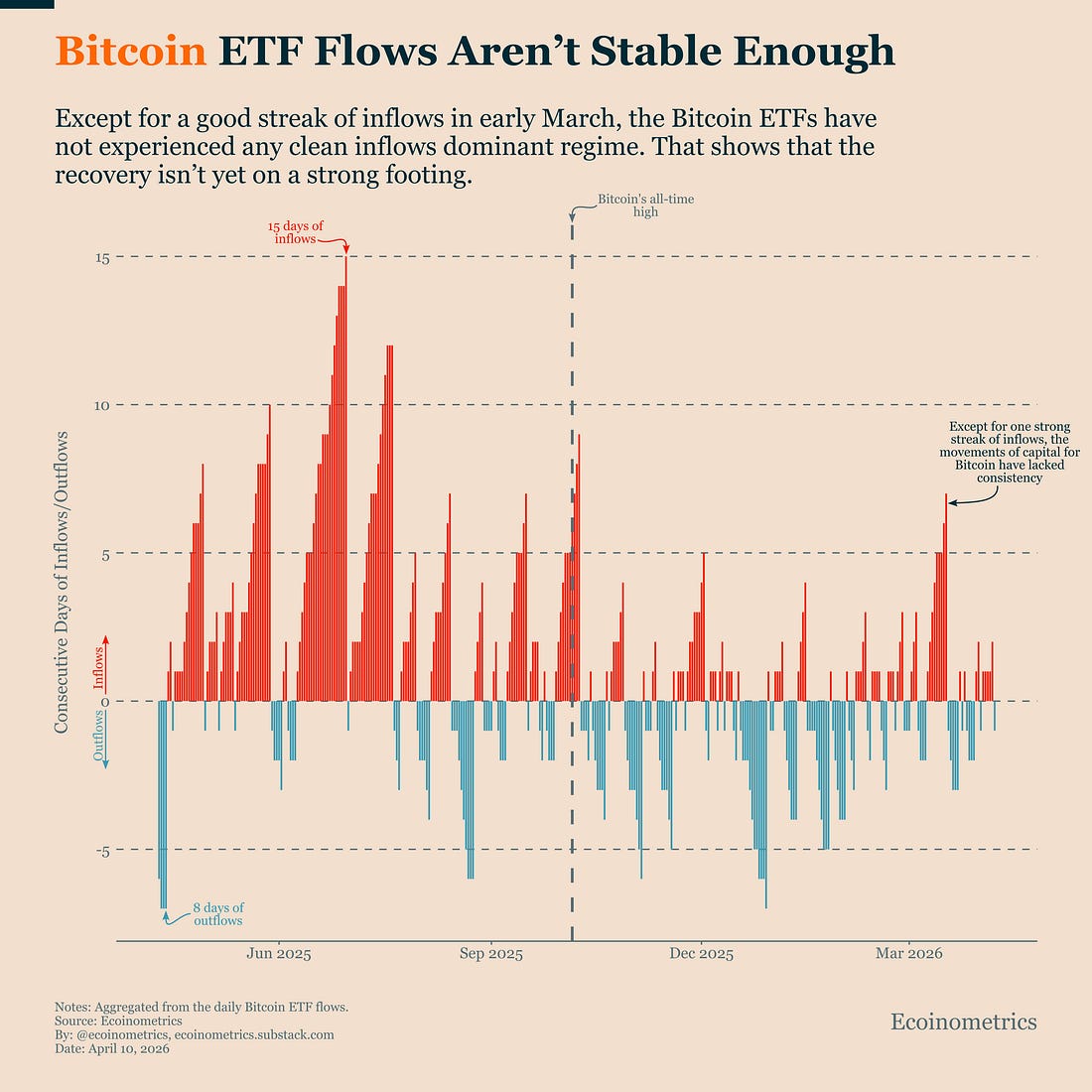 Get these professional-grade insights delivered to your inbox: Bitcoin Demand Still Lacks PersistenceSince Bitcoin peaked in October, the structure of ETF flows has changed in a meaningful way. Checkout the chart below, instead of just tracking inflows and outflows, it tracks streaks i.e. how long demand persists in one direction. There is a pretty obvious before and after: