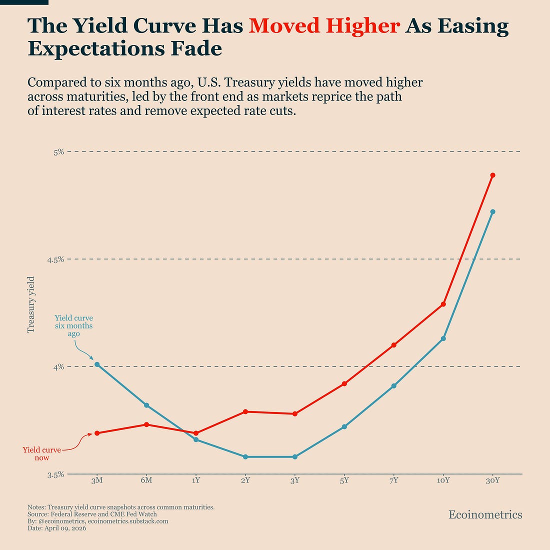 There was a brief attempt at rebuilding momentum in early March, with a stronger streak of inflows. But that move faded quickly, and the market has slipped back into a mixed regime. This failed attempt at rebuilding momentum is part of a broader pattern we’ve been seeing across the market, where investors are stepping back and reducing risk rather than adding exposure. At this point, inflows and outflows are roughly balanced. That’s enough to stabilize price, but not enough to drive a recovery. Which is exactly why you want to look beneath the price action. The headlines over the past few days have been dominated by geopolitical events and the resulting volatility. But those moves don’t tell you much about underlying demand. The chart below does. There is still no persistence in Bitcoin demand. Until that changes, the market is not in a recovery regime. It’s in a holding pattern. That doesn’t rule out that a bottom is forming. But it does mean the risk-reward is not strong enough yet to justify aggressive positioning. Capital Is Stepping BackOver the past six months, the macro backdrop has shifted in a way that is easy to miss if you only look at price. Markets are increasingly adjusting to the idea that interest rates will stay elevated for longer. Inflation is not fully under control, and the bar for meaningful rate cuts remains high. You would normally expect that kind of environment, especially combined with geopolitical tensions, to support gold. But that’s not what is happening. As the chart shows, gold ETF flows have broken down sharply after a strong run. The safe-haven bid that pushed gold higher is no longer building. At the same time, Bitcoin has not meaningfully absorbed that capital. Its flows have stabilized, but there is no clear surge of demand. And more importantly, the Bitcoin demand that is still there is not broadly distributed across the market. It has become increasingly concentrated in a single player acting as the marginal source of support, which has important implications for how stable this setup really is. We broke that down in more detail earlier this week. So there is no clean rotation from risk-off to risk-on, from gold to Bitcoin. Investors seem to be in a holding pattern. One reason for that might be that short-term yields are high and stable, which means holding cash becomes a real alternative. Investors don’t need to reach for gold or Bitcoin to protect capital or generate returns in uncertain times. That changes the competitive landscape. Bitcoin is no longer just competing with gold for flows. It is competing with risk-free yield. And that’s a much harder environment to break out of. Even if geopolitical tensions fade, that doesn’t immediately solve the problem. The constraint is not just fear. It’s the level of rates driven by expectations for the U.S. monetary policy. Until the inflation picture improves enough to shift expectations on rates, this remains a structural headwind for Bitcoin. The Market Is No Longer Expecting Relief From the FedTo understand why demand remains weak, you have to look at what changed in the bond market. The chart below compares the yield curve today to where it stood six months ago. The shift is clear: rates have moved higher across the curve. Six months ago, markets were still pricing a gradual easing cycle. Rate cuts were expected, even if delayed. That assumption is now fading. Today, the yield curve reflects a different reality. The market is no longer counting on the Fed to step in and ease conditions any time soon. That changes the allocation calculus. When rate cuts are expected, liquidity is projected to improve. Investors position ahead of that shift. That’s what supports sustained inflows into risk assets. But when those expectations are removed, that support disappears. What we are seeing now is not just tighter conditions, it’s the removal of the easing narrative. That shift is already feeding through into investor behaviour, with a clear pullback in risk-taking across markets. That helps explain what we saw earlier. Flows into Bitcoin are not persistent. Capital is not rotating out of gold into crypto. Investors are not chasing alternatives. Because the macro backdrop is not expected to improve. As long as the bond market holds this view, Bitcoin is operating without a liquidity tailwind. And without that tailwind, sustained upside becomes much harder to build. Tactical TakeawayThe current setup does not justify aggressive positioning in Bitcoin. Demand has stabilized, but it has not rebuilt. Capital is not rotating into crypto, and the bond market is not signalling any near-term improvement in liquidity. That combination leaves Bitcoin without a strong tailwind. In this environment, the right approach is to stay measured. Maintain exposure if it fits your long-term allocation, but avoid increasing risk based on short-term price moves or headline-driven rallies. What would change that view is straightforward. We would need to see a clear shift in flows, sustained inflows into Bitcoin ETFs over multiple weeks, not just isolated spikes. At the same time, the bond market would need to move back toward pricing in rate cuts, signalling a loosening of financial conditions. Until those conditions are in place, the market remains in a holding pattern. That’s it for today. Thanks for reading. Cheers, Nick P.S. Every week, our team conducts extensive research analyzing market data, tracking emerging trends, and creating professional-grade charts and analysis. Our mission: Deliver actionable macro and Bitcoin insights that help institutional investors and financial advisors make better-informed decisions. Ready for institutional-grade research that puts you ahead of the market? Click below to access our premium insights. You're currently a free subscriber to Ecoinometrics. For the full experience, upgrade your subscription.