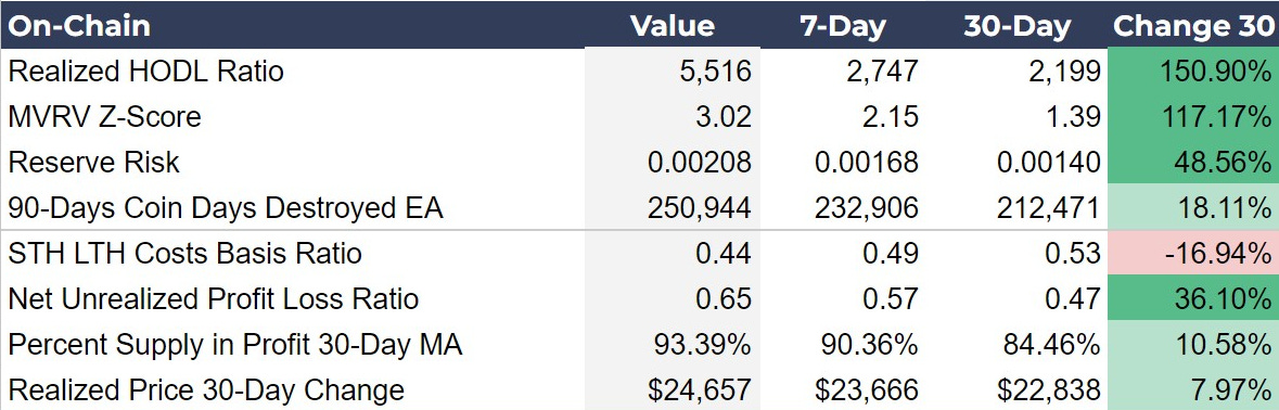 Bitcoin Market Weekly Analysis - Mar 5 2024Deciphering Bitcoin's Bull Run: A Deep Dive into On-Chain and Derivative MarketsCongrats everyone on the new ATH! Let’s see what we can learn from our Market Metrics Dashboard about this move and near term price trajectory. The analysis of Bitcoin's on-chain metrics, price metrics, macroeconomic environment, and derivatives market reveals a comprehensive view of bitcoin’s current landscape. On-chain data shows strong holding by long-term investors, suggesting confidence in Bitcoin's value. However, there are several metrics that indicate volatility might be near. Macroeconomic indicators highlight a generally favorable environment for Bitcoin. Derivatives markets present bullish sentiment with increased hedging for downside risk. On-Chain Metrics: A Strategic AnalysisLong-term holders' strong retention rates, signaled by the high Realized HODL Ratio, reflect a bullish sentiment towards Bitcoin's future. Conversely, the elevated MVRV Z-Score hints at potential overvaluation risks, urging investor caution. Minor increases in selling pressure are noted through Coin Days Destroyed, yet this does not overshadow the long-term holder's confidence, as shown by the low Reserve Risk. Furthermore, the dip in the STH LTH Costs Basis Ratio suggests reduced selling motivation among short-term holders, contributing to potential market stability. Key Insights