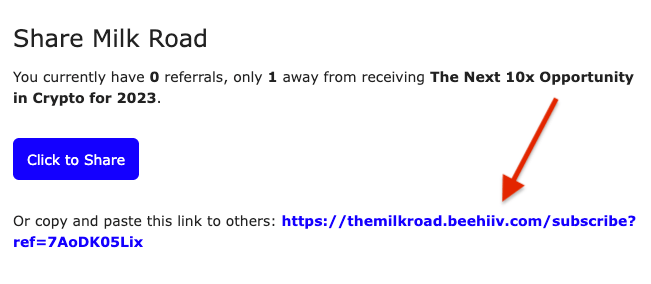 | Look, I know we just met. I don't even know your fav color yet. | But we gotta let you in on a little secret… you can get free Milk Road swag. Even if it's just your first day here. BIG news, I know. | So how does it work? Send the referral link that's at the bottom of every Milk Road email to your family, friends, plumber, exorcist, etc. | This guy 👇 | | Just one referral gets you our inside scoop on crypto in 2023. | If you use that link to get 5 people to sign up, you get stickers. Yes, STICKERS | If you get 20 people, you get quite possibly the coolest T-shirt on the block. | | 40 sign-ups get you a sweet Milk Road hat. Gotta block out them h8ers and the sun. | And 100 get you the most coveted, cozy, & cool of the bunch… The Sweatshirt.© | Wanna see what it looks like? Go check out more on the Milk Road website. Go ahead, we'll wait here. |