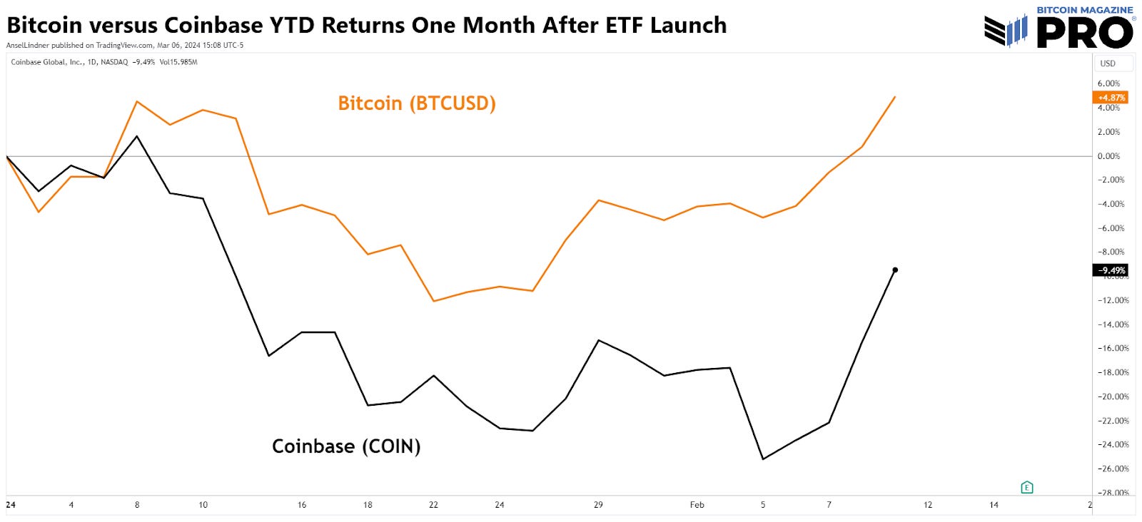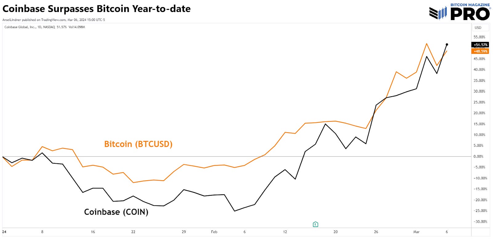 The Evolution of Bitcoin Investments: Bitcoin Equities are the New AltcoinsUnpacking the Impact of Bitcoin-Related Equities on the Bitcoin Investment LandscapeIn this analysis, we examine the evolving relationship between Bitcoin and the emergence of related equities as a new aspect of its adoption and growth trajectory. By comparing the performance of companies like Coinbase (COIN) and MicroStrategy (MSTR) with Bitcoin's market behavior, we identify this trend as a significant evolutionary step in Bitcoin's journey towards global adoption. This development highlights a shift in investment paradigms within the Bitcoin ecosystem, illustrating a maturation process that extends beyond its initial conception. Coinbase COIN Catches BitcoinIn a previous post, we highlighted that Coinbase (COIN) significantly outperformed Bitcoin in 2023, up 410% to bitcoin’s 150%. I specifically anticipated this result would swap in 2024, especially in the first quarter. Now, as we are coming up on the end of Q1, let's revisit COIN's trajectory to assess how it has fared against Bitcoin since that initial discussion. That forecast was accurate for the first month after the ETF launch, Bitcoin was up 4.87% YTD at that point, while Coinbase was down -9.49%. However, since then, COIN has been on a massive run, catching and now surpassing the Bitcoin spot performance YTD, which is quite the task given bitcoin is itself up considerably. Coinbase’s rally is not done, but it remains to be seen if it can continue to outperform Bitcoin. This week, COIN broke through major resistance (below), and has a clear path up to IPO price. The only resistance to speak of is the 61.8 retracement fibonacci and golden pocket, which covers the range of $240-250. IF it can break through that level, too, it might be off to the races. However, there are limits on COIN’s price that spot bitcoin does not have. ... Keep reading with a 7-day free trialSubscribe to Bitcoin Magazine Pro™ to keep reading this post and get 7 days of free access to the full post archives. A subscription gets you: