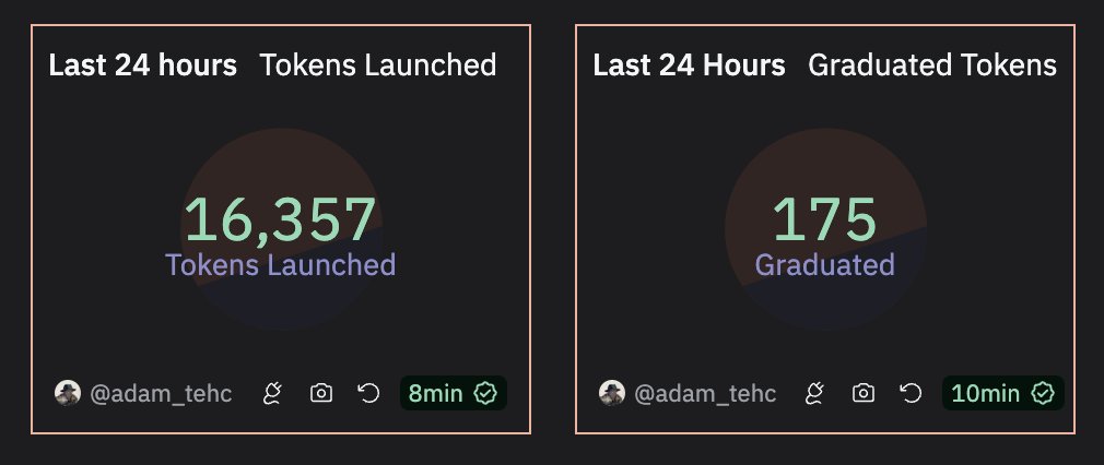 The @pumpdotfun trenches is a slaughterhouse. In the last 24 hours... 16,357 tokens launched. 175 made it to Raydium. 19 remain above the 69k market cap. From launch to profitable graduation that's 0.12%. x.com/i/web/status/1… |  | | 11:17 PM • Aug 10, 2024 | | | | 2.83K Likes 503 Retweets | 320 Replies |