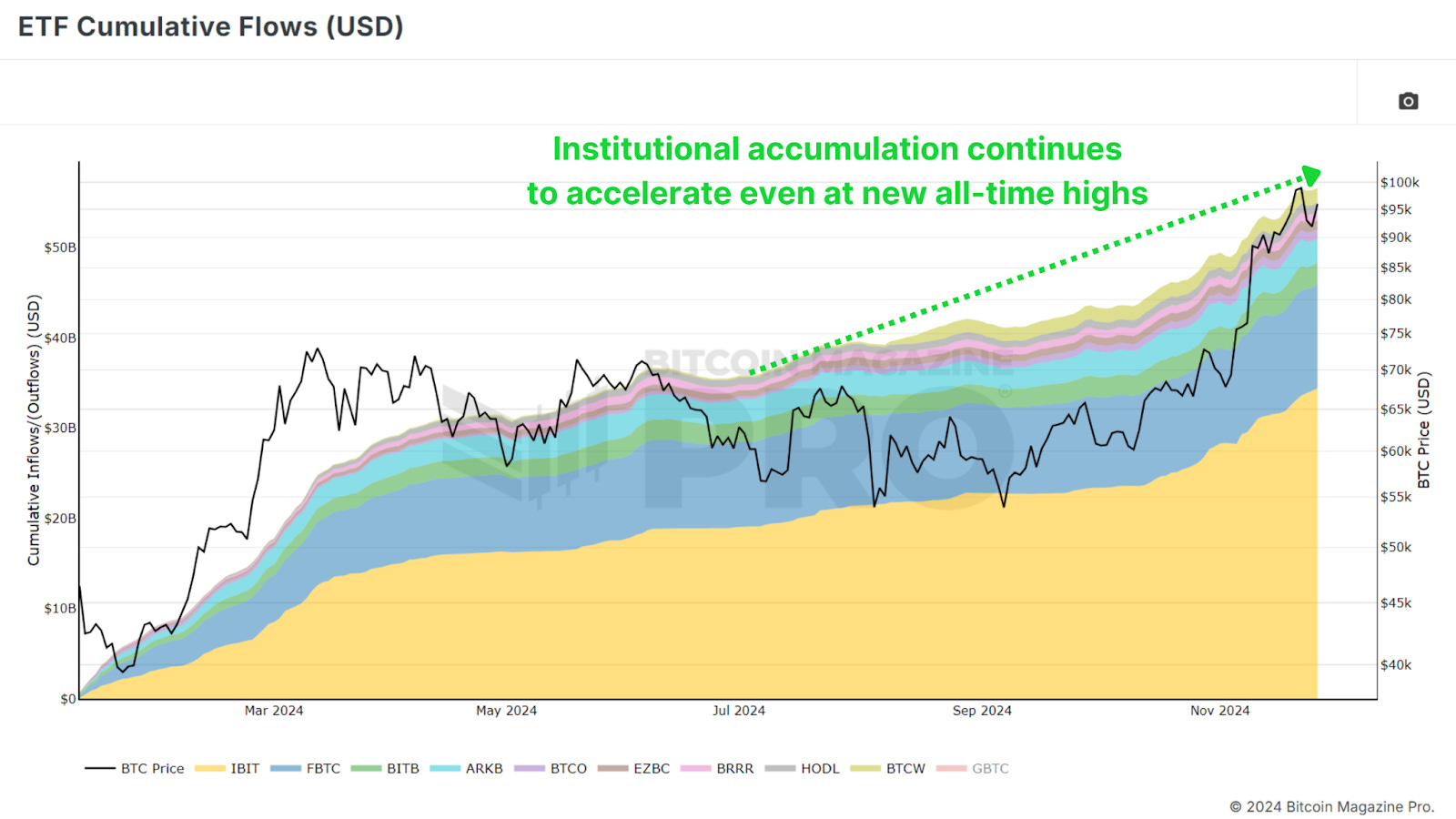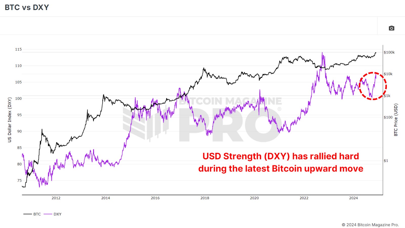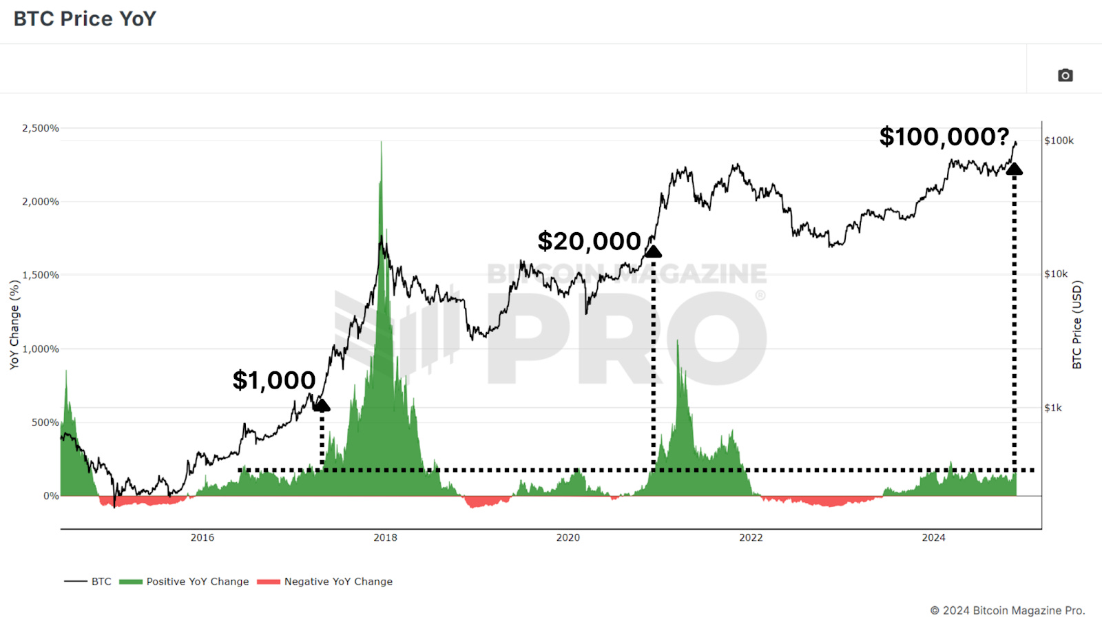 Biggest Bitcoin Price Increase Ever - What Happens Next?From Historic Gains to Future Growth: What Bitcoin's November Breakthrough Means for InvestorsBitcoin is closing out one of its most remarkable months in history, surging over $30,000 in November and marking a renewed bullish sentiment in the market. As we look ahead to December and beyond, investors are eager to understand whether Bitcoin's momentum can sustain itself into 2025. With macroeconomic conditions, historical trends, and on-chain data aligning in Bitcoin’s favor, let’s analyze what’s happening and what it could mean for the future. November’s Record-Breaking PerformanceNovember 2024 wasn’t just any month for Bitcoin; it was historic. Bitcoin's price rose from around $67,000 to nearly $100,000, an approximate 50% peak-to-trough increase, making it the best-performing month ever in terms of dollar increase. This rally rewarded long-term holders who endured months of consolidation after Bitcoin's all-time high of $74,000 earlier in the year. Figure 1: Bitcoin has rallied over $30,000 in November. Historically, Q4 is Bitcoin’s strongest quarter, and November has often been a standout month. December, which has also performed well in past bull cycles, presents a promising outlook. But as with any rally, some short-term cooling might be expected. Figure 2: Q4 has historically been Bitcoin’s best-performing period. The Role of the Dollar and Global LiquidityInterestingly, Bitcoin’s rise occurred against the backdrop of a strengthening U.S. Dollar Strength Index (DXY), a scenario that typically sees Bitcoin underperforming. Historically, Bitcoin and the DXY have maintained an inverse relationship: when the dollar strengthens, Bitcoin weakens, and vice versa. Figure 3: Bitcoin rallied even as the strength of USD increased. Similarly, the Global M2 money supply, another key metric, has shown a slight contraction recently. Bitcoin has historically correlated positively with global liquidity; thus, its current performance defies expectations. If liquidity conditions improve in the coming months, this could act as a powerful tailwind for Bitcoin’s price. Figure 4: Global M2 YoY chart showing liquidity contraction. Parallels to Past Bull CyclesBitcoin’s current trajectory is strikingly similar to past bull markets, particularly the 2016–2017 cycle. That cycle began with gradual price increases before breaking key resistance levels and entering an exponential growth phase. In 2017, Bitcoin’s price broke out from a key technical level of around $1,000, leading to a parabolic rally that peaked at $20,000, a 20x increase. Similarly, the 2020-2021 cycle saw Bitcoin rise from $20,000 to nearly $70,000 after breaking above the crucial YoY Performance threshold. Figure 5: Current BTC performance showing parallels to price prior to breaking previous major resistance levels. If Bitcoin can break out decisively from this historic level and above the key $100,000 resistance, we may witness a repeat of these explosive price movements as BTC enters its exponential phase of bullish price action. Institutional Adoption and AccumulationA key factor underpinning Bitcoin’s strength is the continued accumulation by institutions. Bitcoin ETFs are adding billions of dollars worth of BTC to their holdings, and corporations like MicroStrategy have doubled down on their Bitcoin strategy, now holding close to 400,000 BTC. Even with BTC rallying to new all-time highs, ‘smart money’ is scrambling to accumulate as much as possible to ensure they’re not left behind. Figure 6: Institutions are not waiting for a retracement to accumulate BTC. This institutional demand indicates growing confidence in Bitcoin as a long-term store of value, even in volatile market conditions. Such accumulation also tightens the available supply, creating upward pressure on prices as demand increases. ConclusionWhile December has historically been a strong month for Bitcoin, short-term volatility could temper gains as the market digests November’s sharp rally. Although given the aggressive accumulation we’re witnessing from institutional participants anything is possible. Longer-term, however, the outlook remains exceptionally bullish. The obvious level to watch is $100,000 as the next major milestone, which, if breached, could pave the way for a much larger rally in 2025. Bitcoin is entering one of its most exciting phases yet, with the stars seemingly aligning across macroeconomic, technical, and on-chain metrics. For a more in-depth look into this topic, check out a recent YouTube video here: The BIGGEST Bitcoin Month EVER - So What Happens Next? Matt Lead Analyst Bitcoin Magazine Pro. 🎁 Black Friday: Our Biggest Ever SaleThe BEST saving of the year is here. Get 40% Off all our annual plans.