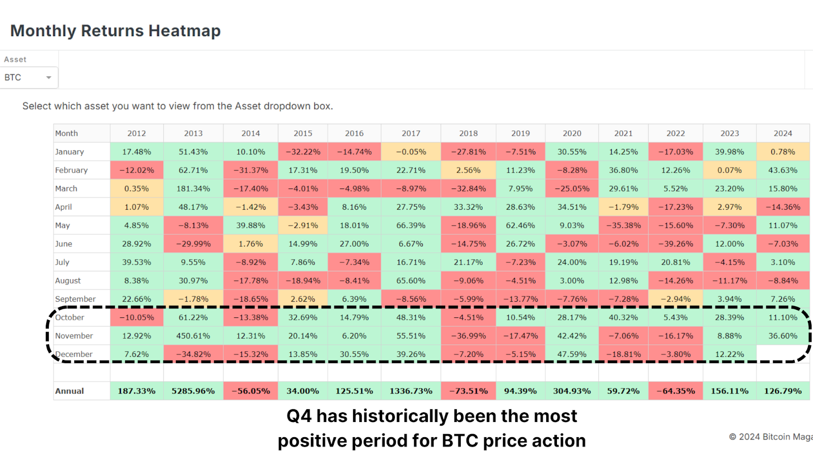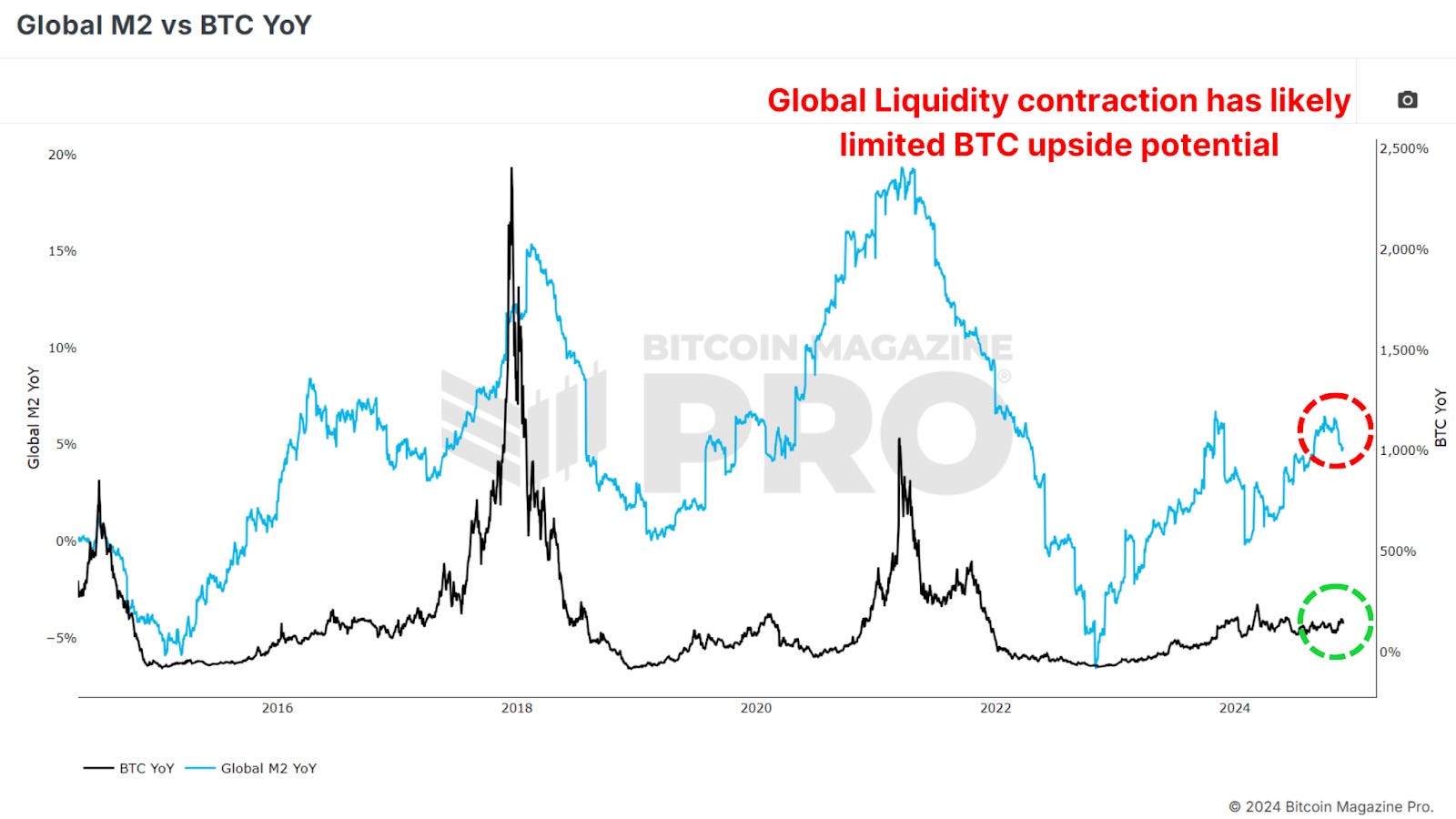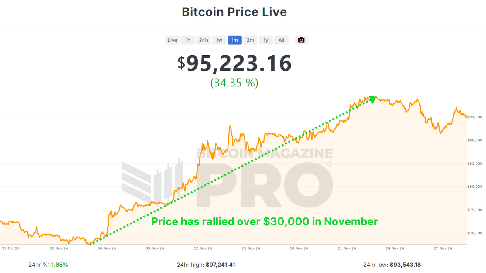 Biggest Bitcoin Price Increase Ever - What Happens Next?From Historic Gains to Future Growth: What Bitcoin's November Breakthrough Means for InvestorsBitcoin is closing out one of its most remarkable months in history, surging over $30,000 in November and marking a renewed bullish sentiment in the market. As we look ahead to December and beyond, investors are eager to understand whether Bitcoin's momentum can sustain itself into 2025. With macroeconomic conditions, historical trends, and on-chain data aligning in Bitcoin’s favor, let’s analyze what’s happening and what it could mean for the future. November’s Record-Breaking PerformanceNovember 2024 wasn’t just any month for Bitcoin; it was historic. Bitcoin's price rose from around $67,000 to nearly $100,000, an approximate 50% peak-to-trough increase, making it the best-performing month ever in terms of dollar increase. This rally rewarded long-term holders who endured months of consolidation after Bitcoin's all-time high of $74,000 earlier in the year. Figure 1: Bitcoin has rallied over $30,000 in November. Historically, Q4 is Bitcoin’s strongest quarter, and November has often been a standout month. December, which has also performed well in past bull cycles, presents a promising outlook. But as with any rally, some short-term cooling might be expected. Figure 2: Q4 has historically been Bitcoin’s best-performing period. The Role of the Dollar and Global LiquidityInterestingly, Bitcoin’s rise occurred against the backdrop of a strengthening U.S. Dollar Strength Index (DXY), a scenario that typically sees Bitcoin underperforming. Historically, Bitcoin and the DXY have maintained an inverse relationship: when the dollar strengthens, Bitcoin weakens, and vice versa. Figure 3: Bitcoin rallied even as the strength of USD increased. Similarly, the Global M2 money supply, another key metric, has shown a slight contraction recently. Bitcoin has historically correlated positively with global liquidity; thus, its current performance defies expectations. If liquidity conditions improve in the coming months, this could act as a powerful tailwind for Bitcoin’s price. Figure 4: Global M2 YoY chart showing liquidity contraction. Parallels to Past Bull CyclesBitcoin’s current trajectory is strikingly similar to past bull markets, particularly the 2016–2017 cycle. That cycle began with gradual price increases before breaking key resistance levels and entering an exponential growth phase. In 2017, Bitcoin’s price broke out from a key technical level of around $1,000, leading to a parabolic rally that peaked at $20,000, a 20x increase. Similarly, the 2020-2021 cycle saw Bitcoin rise from $20,000 to nearly $70,000 after breaking above the crucial YoY Performance threshold. Figure 5: Current BTC performance showing parallels to price prior to breaking previous major resistance levels. If Bitcoin can break out decisively from this historic level and above the key $100,000 resistance, we may witness a repeat of these explosive price movements as BTC enters its exponential phase of bullish price action. Institutional Adoption and AccumulationA key factor underpinning Bitcoin’s strength is the continued accumulation by institutions. Bitcoin ETFs are adding billions of dollars worth of BTC to their holdings, and corporations like MicroStrategy have doubled down on their Bitcoin strategy, now holding close to 400,000 BTC. Even with BTC rallying to new all-time highs, ‘smart money’ is scrambling to accumulate as much as possible to ensure they’re not left behind. Figure 6: Institutions are not waiting for a retracement to accumulate BTC. This institutional demand indicates growing confidence in Bitcoin as a long-term store of value, even in volatile market conditions. Such accumulation also tightens the available supply, creating upward pressure on prices as demand increases. ConclusionWhile December has historically been a strong month for Bitcoin, short-term volatility could temper gains as the market digests November’s sharp rally. Although given the aggressive accumulation we’re witnessing from institutional participants anything is possible. Longer-term, however, the outlook remains exceptionally bullish. The obvious level to watch is $100,000 as the next major milestone, which, if breached, could pave the way for a much larger rally in 2025. Bitcoin is entering one of its most exciting phases yet, with the stars seemingly aligning across macroeconomic, technical, and on-chain metrics. For a more in-depth look into this topic, check out a recent YouTube video here: The BIGGEST Bitcoin Month EVER - So What Happens Next? Matt Lead Analyst Bitcoin Magazine Pro. 🎁 Black Friday: Our Biggest Ever SaleThe BEST saving of the year is here. Get 40% Off all our annual plans.