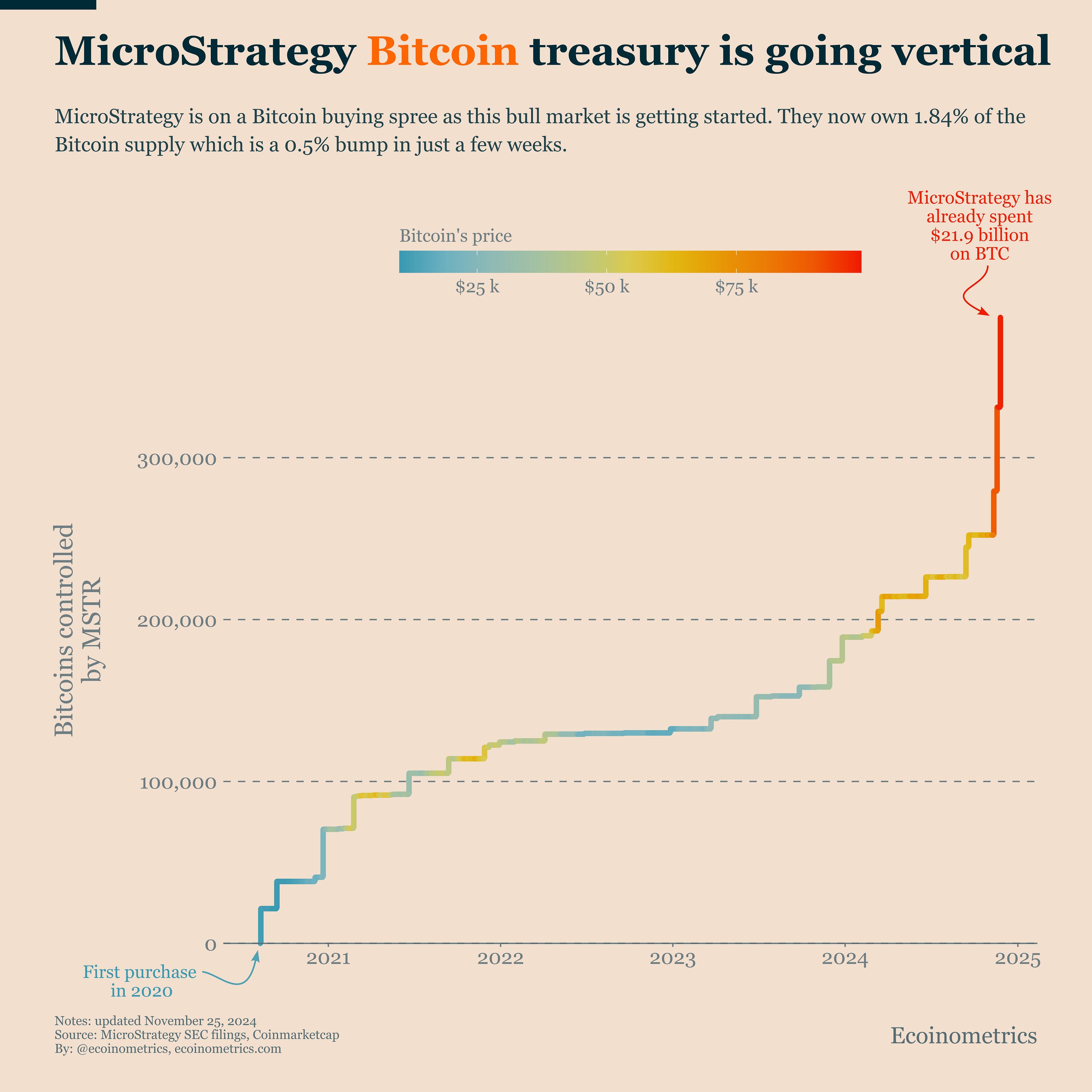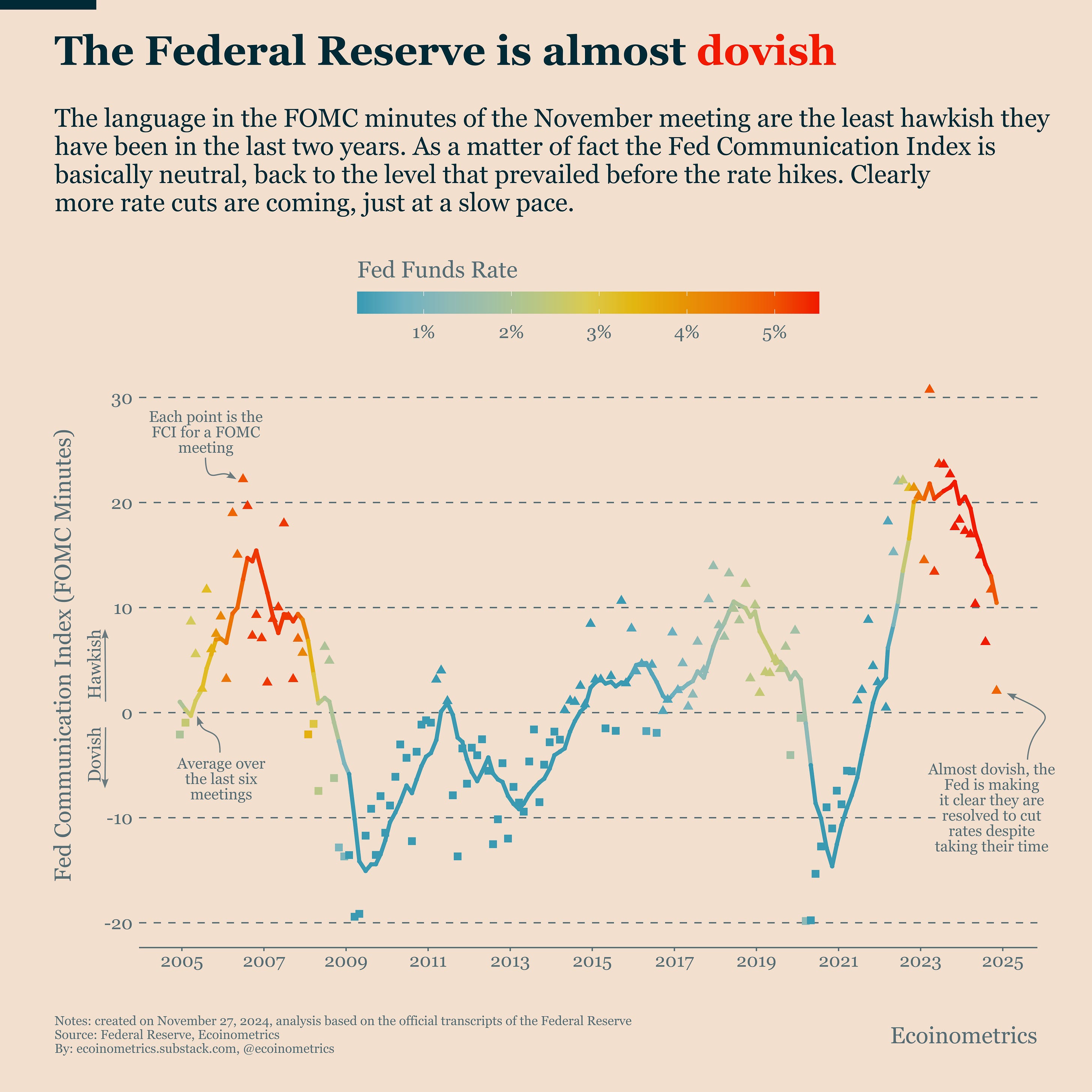The overall momentum remains strong. But it's logical that after a major Q4 allocation shift from institutional investors, we'd see some deceleration. Once this reallocation phase ends, we'll need either a new quarter or significant FOMO to restart the trend. This week's slowdown could simply be due to Thanksgiving. Let's see if next week brings a return to the trend or if this marks the end of Q4's momentum. MicroStrategy Is Going VerticalI've been talking a lot about MicroStrategy this fall, and for good reason - they keep pushing their Bitcoin acquisition strategy to new heights. They now hold 1.84% of the total Bitcoin supply, adding +0.5% in just a few weeks. The chart below shows their holdings going vertical just as Bitcoin approaches $100k. This aggressive buying makes perfect sense if MSTR believes we're at the start of a bull run. Yes, they traditionally use DCA (dollar-cost averaging). DCA works best in bear or sideways markets when you can't predict the bottom, or when you need to spread out your purchases due to limited resources. But if you believe prices are heading up and you can raise cash without excessive leverage, front-loading your position will maximize long-term performance. That's why MSTR has deployed so much capital in such a short time this year. If their timing is right, they're positioned for substantial gains. Is the Federal Reserve Turning Dovish?An interesting dynamic is playing out. The November FOMC press conference sounded hawkish according to our Fed Communication Index (FCI, see chart). Chair Powell hinter they would pause rate cuts if inflation became problematic. But this week's FOMC meeting minutes emphasize a different story. The tone was neutral based on the FCI. In fact, the FCI trend is heading straight towards dovish territory. Rate cuts may come slowly, but the minutes make it clear: this is the path forward, regardless of pace. So the Fed seems to be hedging its message. The facts are clear: The US economy is growing well, the labor market remains strong, and core inflation is stubborn. This limits the Fed's options. Yet markets aren't flinching. Bitcoin, gold, and other risk assets appear unfazed. Investors have already priced in that rates will eventually drop. Beyond the bond market, where these shifts really matter, this is a non-issue as long as the Fed maintains its current direction. For now, that's exactly what they're signalling. That’s it for today. I hope you enjoyed this. We’ll be back next week with more charts. Cheers, Nick P.S. We spend the entire week, countless hours really, doing research, exploring data, surveying emerging trends, looking at charts and making infographics. Our objective? Deliver to you the most important insights in macroeconomics, Bitcoin and digital assets. Armed with those insights you can make better investment decisions. Are you a serious investor? Do you want to get the big picture to get on the big trades? Then click on the button below. Invite your friends and earn rewardsIf you enjoy Ecoinometrics, share it with your friends and earn rewards when they subscribe. |