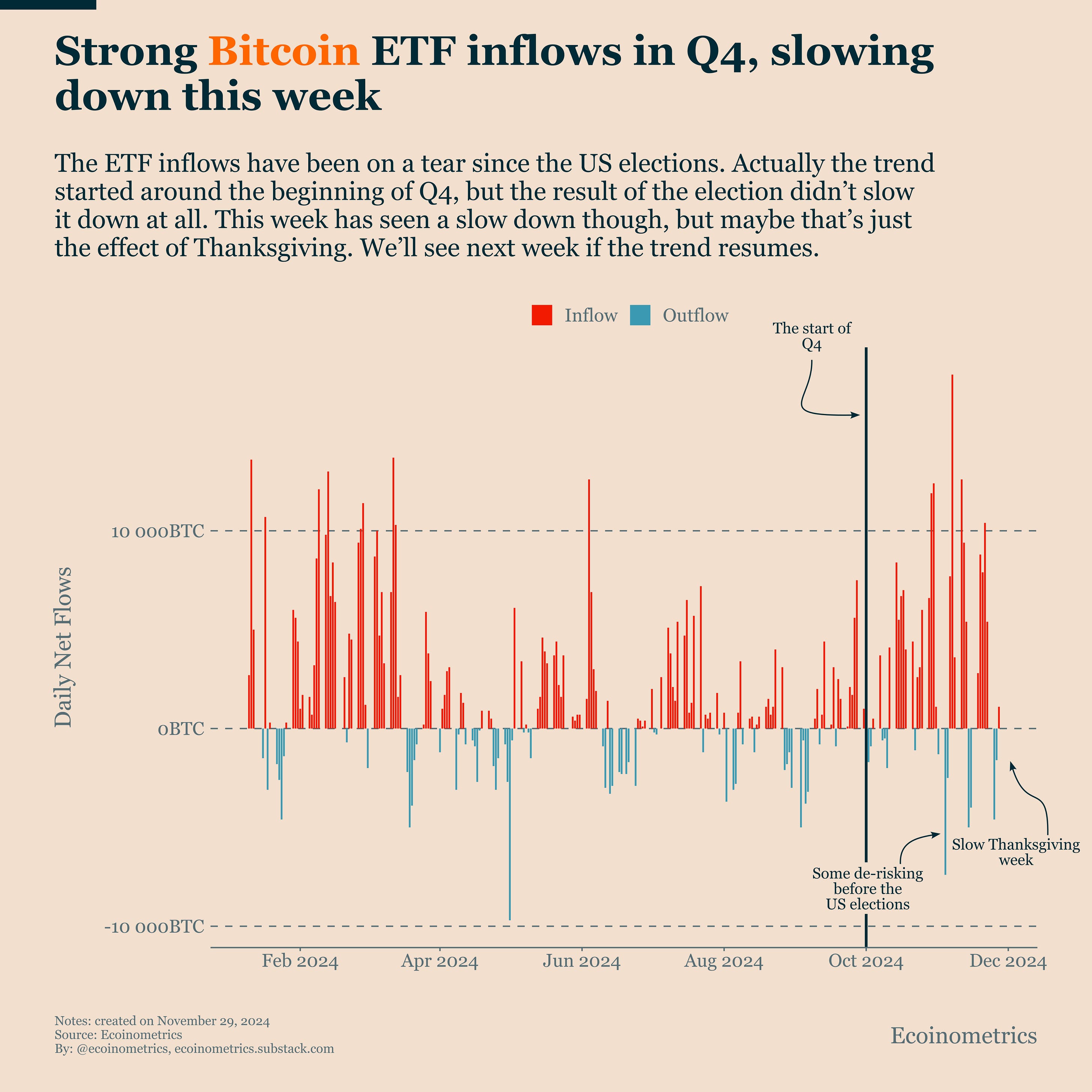 Each topic comes with a small explanation and one big chart. So let’s dive in. In case you missed it, here are the other topics we covered this week: If you aren’t subscribed yet, hit the subscribe button, to receive this email every week directly in your inbox: Strong Bitcoin ETF inflows In Q4Bitcoin is stalling just below $100,000, and ETF inflows have slowed down this week. Coincidence? Nope. That's why we track these flows in the Bitcoin Market Monitor. The correlation between net ETF flows and price action is strong. Whether you think ETF flows drive price or price drives flows, this is a valuable metric for gauging momentum. Here's what the data tells us: