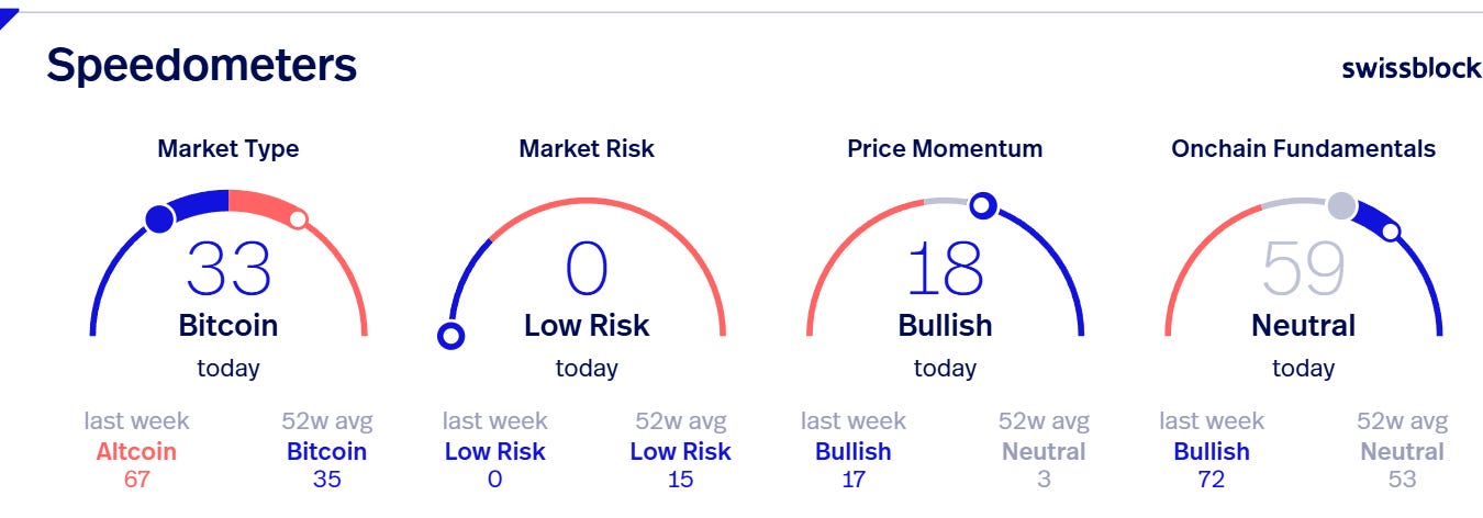 Speedometers indicating the current state of BTC. The full dot represents the current reading and the white dot represents one week ago.