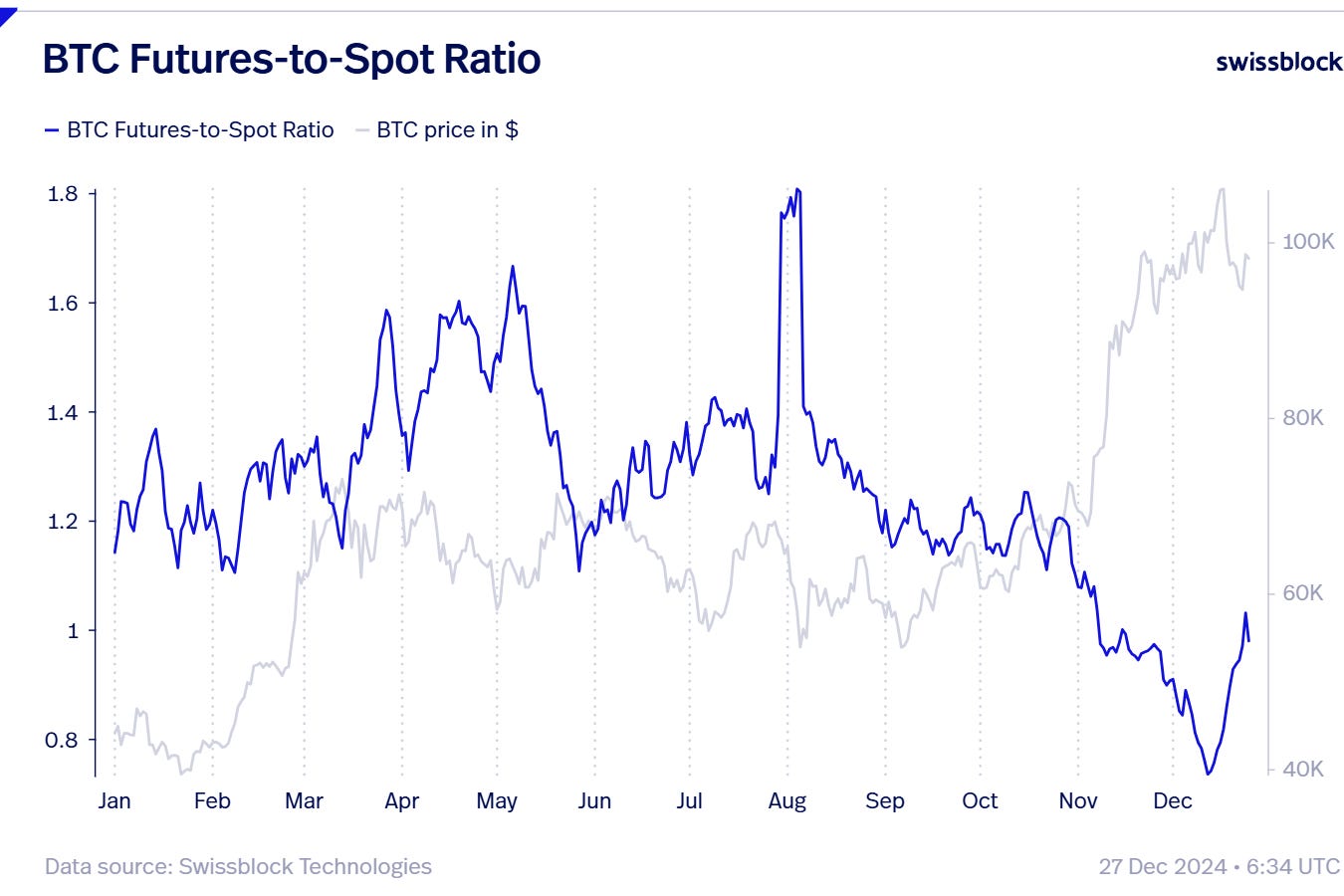 Due to the low volume, we see that the futures-to-spot ratio has bounced slightly from its yearly lows, indicating that futures positions have dominated over spot positions since this week.