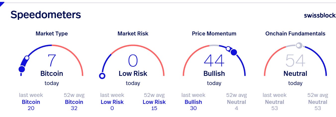 Speedometers indicating the current state of BTC. The full dot represents the current reading and the white dot represents one week ago.