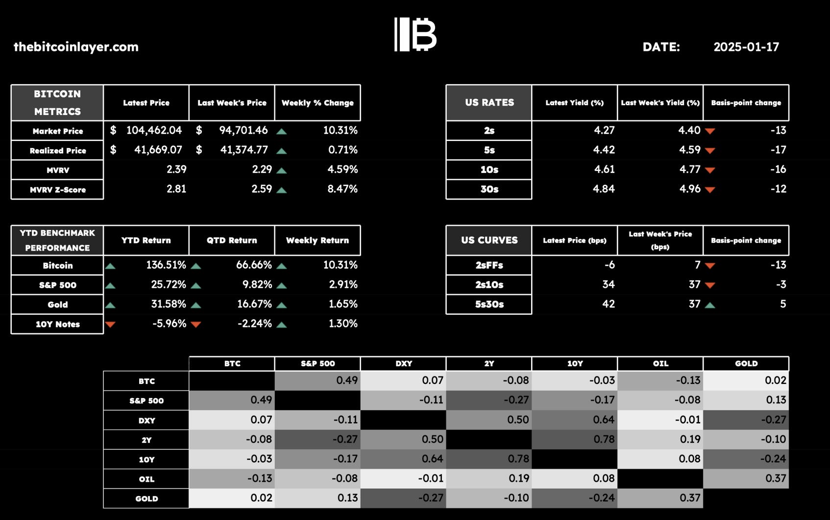 Good morning Readers! Bitcoin finished the week with a bang, hovering around $105,000 as of this writing. With only hours away until the Inauguration and everybody fixated on the suite of executive orders (and pardons), we must admit that we join others on the edge of their seat. Our new position is that the mainstreaming of bitcoin happened somewhat overnight—our friend Parker Lewis always told us it would happen gradually, then suddenly. In that mainstreaming event, which admittedly is heavily contributed to by the shifting political scene, bitcoin’s dips are strongly defended and underlying on-chain support fortified. Today, we’ll dissect the setup, as well as read into the stock market’s Fed-dependence: down on strong employment, and up on cooling CPI. Here’s what the schedule looks like:
