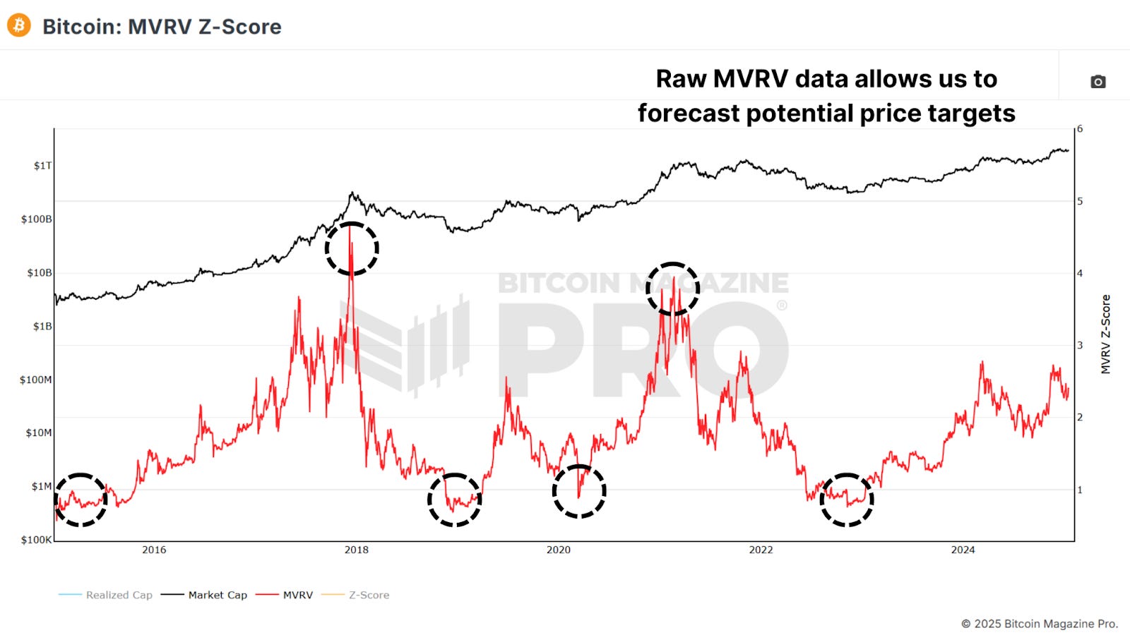 Can We Improve The Best Bitcoin Metric?We’ve enhanced the MVRV Z-Score to better reflect Bitcoin’s evolving market dynamics and reduced volatility.The Bitcoin MVRV Z-Score has historically been one of the most effective tools for identifying market cycle tops and bottoms in Bitcoin. Today, we're excited to share an enhancement to this metric that makes it even more insightful for today's dynamic market conditions. What Is the Bitcoin MVRV Z-Score?The MVRV Z-Score is derived by analyzing the ratio between Bitcoin’s realized cap (the average acquisition cost of all Bitcoin in circulation) and its market cap (current network valuation). By standardizing this ratio using Bitcoin's price volatility (measured as the standard deviation), the Z-Score highlights periods of overvaluation or undervaluation relative to historical norms. Figure 1: MVRV Z-Score effectiveness may be reduced due to diminishing volatility. Peaks in the red zone signal overvaluation, suggesting optimal profit-taking opportunities. Bottoms in the green zone indicate undervaluation, often marking strong accumulation opportunities. Historically, this metric has been remarkably accurate in pinpointing major market cycle extremes. While powerful, the traditional MVRV Z-Score has its limitations. In past cycles, the Z-Score reached values of 9–10 during market tops. However, in the last cycle, the score only reached around 7. This may be due to the rounded double-peak cycle instead of the sharp blow-off top we usually experience. Regardless, there’s the necessity to factor in the evolving market dynamics, with increasing institutional involvement and changing investor behavior. The Enhanced MVRV Z-ScoreThe MVRV Z-Score standardizes the raw MVRV data using Bitcoin’s entire price history, which includes the extreme volatility of its early years. As Bitcoin matures, these early data points may distort its relevance to current market conditions. To address these challenges, we’ve developed the MVRV Z-Score 2YR Rolling. Instead of using Bitcoin's entire price history, this version calculates volatility based only on the previous two years of data. Figure 2: MVRV Z-Score 2YR Rolling accounts for reduced market volatility. This approach better accounts for Bitcoin’s growing market cap and shifting dynamics and ensures the metric adapts to more recent trends, offering greater accuracy for contemporary market analysis. It still excels at identifying market cycle tops and bottoms but adapts to modern conditions. In the last cycle, this version captured a higher peak value than the traditional Z-Score, aligning more closely with 2017's price action. On the downside, it continues to identify strong accumulation zones with high precision. Raw MVRV RatioAnother complementary approach involves analyzing the MVRV ratio without standardizing for volatility. By doing so, we can see the previous cycle’s MVRV ratio peaked at 3.96, compared to 4.72 in the cycle before that. These values suggest less deviation, potentially offering a more stable framework for projecting future price targets. Figure 3: MVRV data can help to forecast potential price targets. Assuming a realized price of $60,000 (factoring in the current projected increase over the next six months) and an MVRV ratio of 3.96, a potential peak price could be close to $240,000. If diminishing returns reduce the ratio to 3.0, the peak price might still reach $180,000. ConclusionWhile the MVRV Z-Score is still one of the most effective tools for timing market cycle peaks and bottoms, we need to be prepared for this metric potentially not reaching similar highs as prior cycles. By adapting this data to better factor in the changing market dynamics of Bitcoin, we can account for reduced volatility as BTC grows. For a more in-depth look into this topic, check out a recent YouTube video here: Matt Lead Analyst Bitcoin Magazine Pro. Bitcoin Magazine ProFor more detailed Bitcoin analysis and to access advanced features like live charts, personalized indicator alerts, and in-depth industry reports, check out Bitcoin Magazine Pro. Make Smarter Decisions About Bitcoin. Join millions of investors who get clarity about Bitcoin using data analytics you can't get anywhere else. We don't just provide data for data's sake, we provide the metrics and tools that really matter. So you get to supercharge your insights, not your workload. Take the next step in your Bitcoin investing journey: