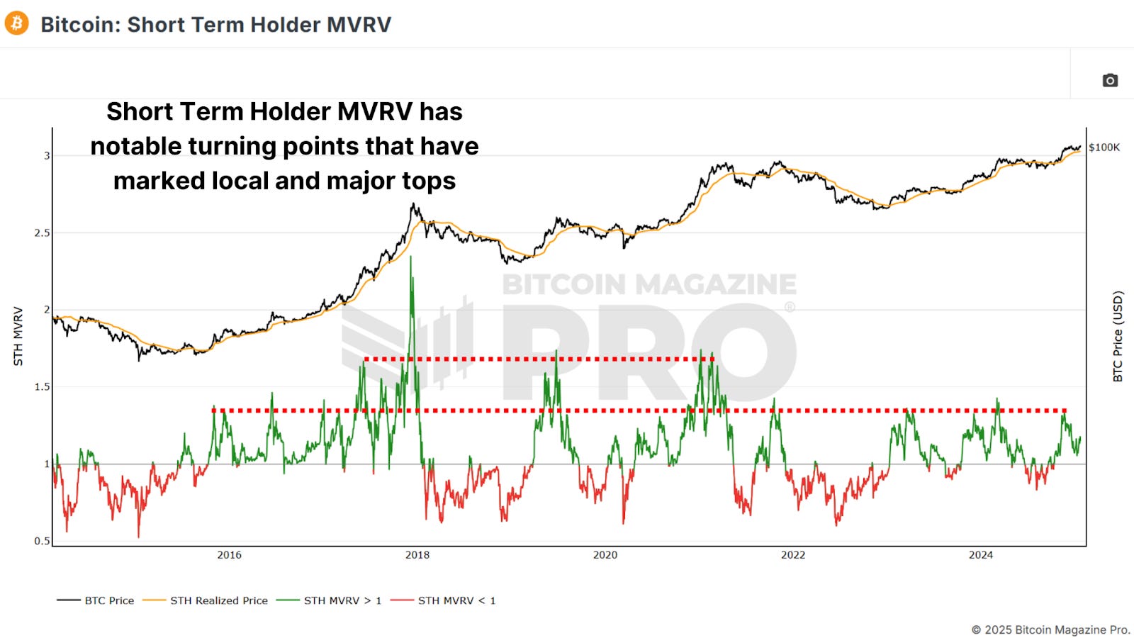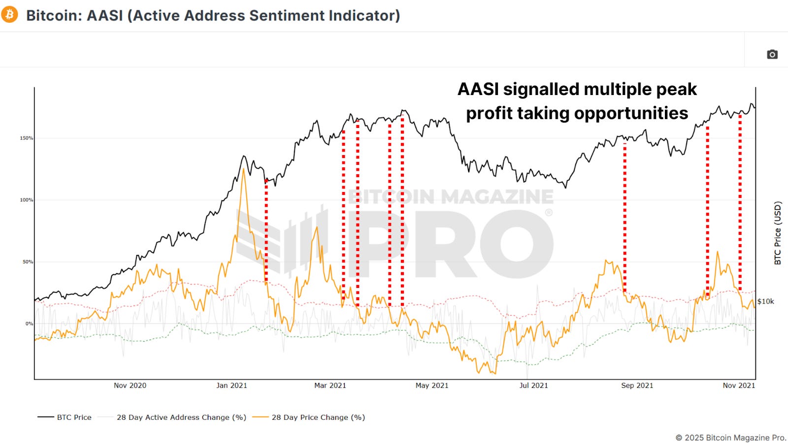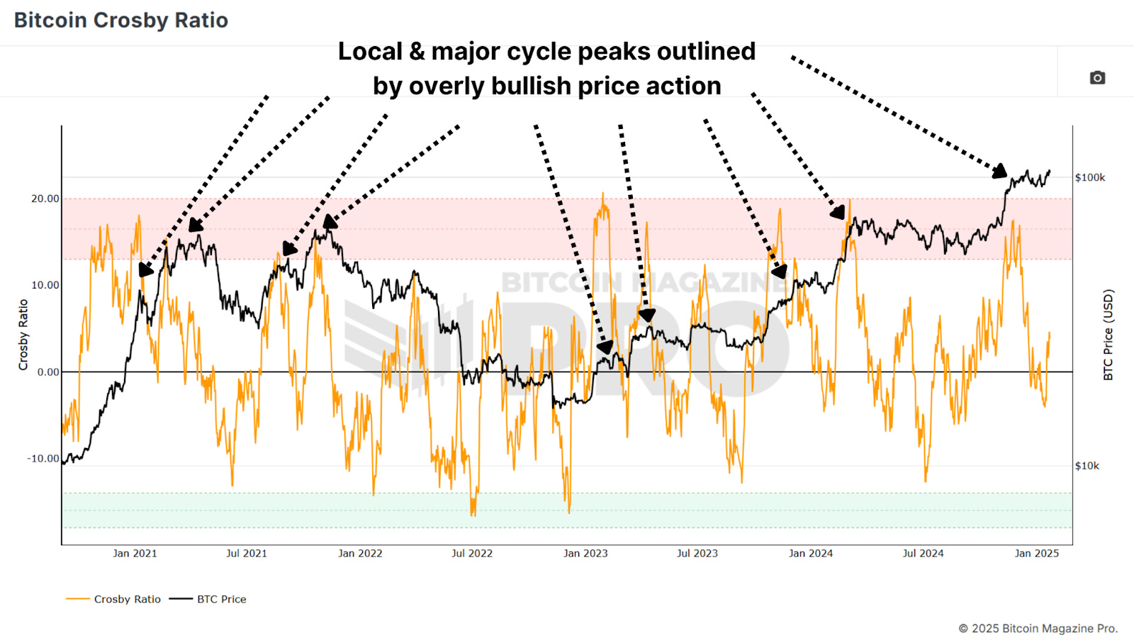 How to Take Profits at Bitcoin Cycle PeaksLearn how on-chain metrics and sentiment tools can help you time Bitcoin cycle peaks effectively.Discussing when and how to sell Bitcoin can be controversial, but if you’re planning to take profits this cycle, it’s essential to do it strategically. While holding Bitcoin indefinitely is an option for some, many investors aim to capture gains, cover living expenses, or reinvest at lower prices. Historical trends show that Bitcoin often experiences drawdowns of 70-80%, providing opportunities to reaccumulate at reduced valuations. Why Selling Isn’t Always TabooWhile some, like Michael Saylor, advocate never selling Bitcoin, this stance doesn’t always suit individual investors. For those not managing billions, taking partial profits can offer flexibility and peace of mind. If Bitcoin peaks at, say, $250,000 and faces a fairly conservative 60% correction, it would revisit $100,000, creating a chance to reenter at lower levels than we’ve already seen. Figure 1: There’s a good chance you’ll be able to scale back in at lower prices than today. The goal isn’t to sell everything but to strategically scale out of positions, maximizing returns and managing risks. Achieving this requires pragmatic, data-driven decisions, not emotional reactions. But again, if you never want to sell, then don’t! Do whatever works best for you. Key Timing ToolsThis Active Address Sentiment Indicator (AASI) compares changes in network activity to Bitcoin’s price movement. It measures deviations between price (orange line) and network activity, shown by green and red deviation bands. Figure 2: AASI has historically worked well as a top timing indicator. For example, during the 2021 bull run, signals emerged when the price change exceeded the red band. Sell signals appeared at $40,000, $52,000, $58,000, and $63,000. Each provided an opportunity to scale out as the market overheated. The Fear and Greed Index is a simple yet effective sentiment tool that quantifies market euphoria or panic. Values above 90 suggest extreme greed, often preceding corrections, such as in 2021, when Bitcoin rallied from $3,000 to $14,000, the index hit 95, signaling a local peak. Figure 3: Fear & Greed is simple but has historically been effective. The Short-Term Holder MVRV measures the average unrealized profit or loss of new market participants by comparing their cost basis to current prices. Around 33% profit levels often mark reversals and local intracycle peaks, and when unrealized profits exceed around 66%, markets are often overheated and may be close to major cycle peaks. Figure 4: Short Term Holder MVRV has predictable turning points. The Bitcoin Funding Rates reflect the premiums traders pay to maintain leverage positions in futures markets. Extremely high funding rates suggest excessive bullishness, often preceding corrections. Like most metrics, we can see that counter-trading an overly euphoric majority usually provides an edge. Figure 5: Incredibly high funding rates cannot be sustained and often mark turning points. The Crosby Ratio is a momentum-based indicator that highlights overheated conditions. When the ratio enters the red zone on the daily chart, or even lower timeframes if you use our TradingView version of the indicator, market turning points have typically occurred. When these signals occur in confluence with other top-marking metrics, it solidifies the probability of a larger-scale prediction. Figure 6: Crosby Ratio outlines overextended upside price action. ConclusionTiming the exact top is virtually impossible, and no single metric or strategy is foolproof. Combine multiple indicators for confluence and avoid selling your entire position at once. Instead, scale out in increments as key indicators signal overheated conditions, and consider setting trailing stops tied to key levels or a percentage of price movement to capture additional gains if price rallies even higher. For a more in-depth look into this topic, check out a recent YouTube video here: Matt Lead Analyst Bitcoin Magazine Pro. Bitcoin Magazine ProFor more detailed Bitcoin analysis and to access advanced features like live charts, personalized indicator alerts, and in-depth industry reports, check out Bitcoin Magazine Pro. Make Smarter Decisions About Bitcoin. Join millions of investors who get clarity about Bitcoin using data analytics you can't get anywhere else. We don't just provide data for data's sake, we provide the metrics and tools that really matter. So you get to supercharge your insights, not your workload. Take the next step in your Bitcoin investing journey: