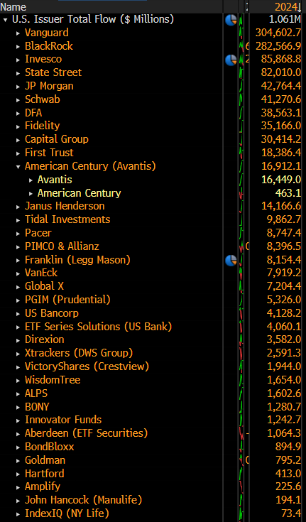 US ETF issuers by 2024 flows.. Vanguard on top for 5th straight year. BlackRock no slouch tho, more than doubled last yr haul. The Big Two = 55% of all cash intake. Invesco, Fidelity, CapGp, Janus, Tidal had amazing years, smashed old records. | |  | | | 4:20 PM • Jan 6, 2025 | | | | | | 79 Likes 6 Retweets | 7 Replies |