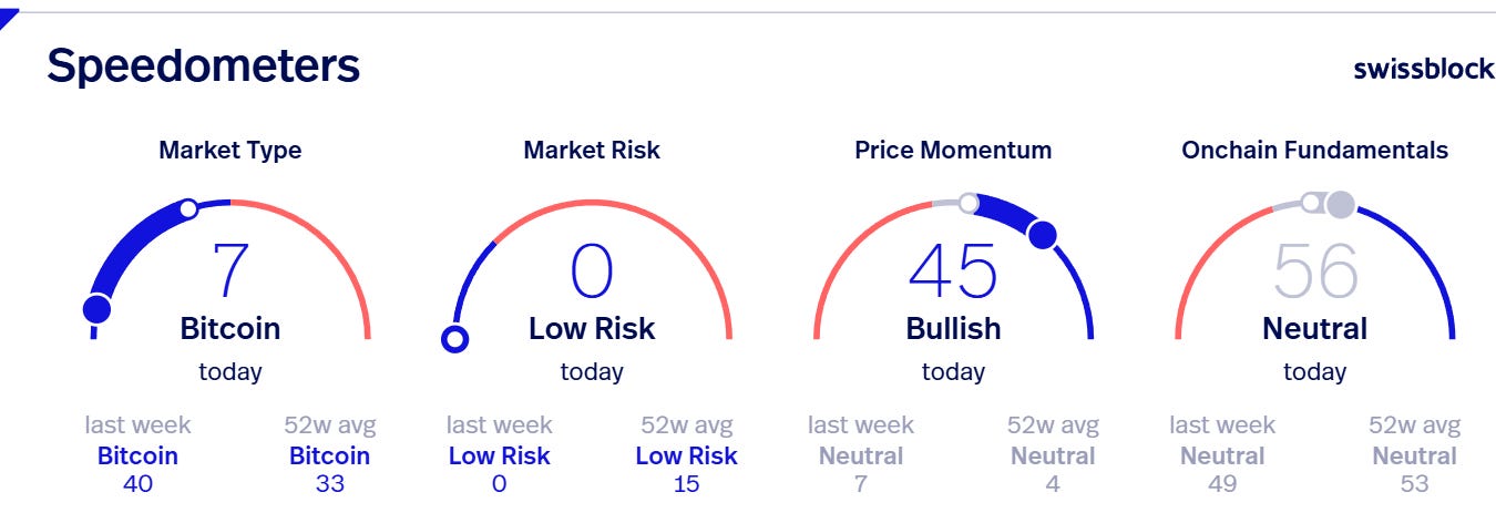 Speedometers indicating the current state of BTC. The full dot represents the current reading and the white dot represents one week ago.