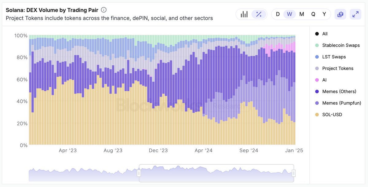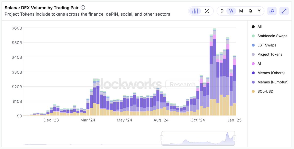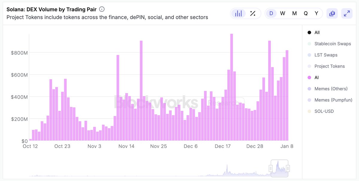 Our Solana DEX dashboard now includes an AI sector: Q4 – $26b volume (5.5% of volume) December – $11.5b volume (6% of volume) Last week – $4b volume (10% of volume) Free at solana . blockworksresearch . com | |    | | | 7:57 PM • Jan 9, 2025 | | | | | | 4 Likes 0 Retweets | 1 Reply |