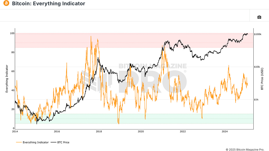 Introducing the Bitcoin Everything IndicatorA Single Metric to Rule Them All – The Bitcoin Everything Indicator combines multiple key metrics into one comprehensive tool for better investment decisions.Wouldn’t it be great if we had one all-encompassing metric to guide our Bitcoin investing decisions? That’s precisely what has been created, the Bitcoin Everything Indicator. Recently added to Bitcoin Magazine Pro, this indicator aims to consolidate multiple metrics into a single framework, making Bitcoin analysis and investment decision-making more streamlined. Why We Need a Comprehensive IndicatorInvestors and analysts typically rely on various metrics, such as on-chain data, technical analysis, and derivative charts. However, focusing too much on one aspect can lead to an incomplete understanding of Bitcoin’s price movements. The Bitcoin Everything Indicator attempts to solve this by integrating key components into one clear metric. Figure 1: The new Bitcoin Everything Indicator. The Core Components of the Bitcoin Everything IndicatorBitcoin's price action is deeply influenced by global liquidity cycles, making macroeconomic conditions a fundamental pillar of this indicator. The correlation between Bitcoin and broader financial markets, especially in terms of Global M2 money supply, is clear. When liquidity expands, Bitcoin typically appreciates. Figure 2: Global Liquidity cycles have had a major influence on BTC price action. Fundamental factors like Bitcoin’s halving cycles and miner strength play an essential role in its valuation. While halvings decrease new Bitcoin supply, their impact on price appreciation has diminished as over 94% of Bitcoin’s total supply is already in circulation. However, miner profitability remains crucial. The Puell Multiple, which measures miner revenue relative to historical averages, provides insights into market cycles. Historically, when miner profitability is strong, Bitcoin tends to be in a favorable position. Figure 3: BTC miner profitability has been an accurate gauge of network health. On-chain indicators help assess Bitcoin's supply and demand dynamics. The MVRV Z-Score, for example, compares Bitcoin’s market cap to its realized cap (average purchase price of all coins). This metric identifies accumulation and distribution zones, highlighting when Bitcoin is overvalued or undervalued. Figure 4: The MVRV Z-Score has historically been one of the most accurate cycle metrics. Another critical on-chain metric is the Spent Output Profit Ratio (SOPR), which examines the profitability of coins being spent. When Bitcoin holders realize massive profits, it often signals a market peak, whereas high losses indicate a market bottom. Figure 5: SOPR gives insight into real-time realized investor profits and losses. The Bitcoin Crosby Ratio is a technical metric that assesses Bitcoin’s overextended or discounted conditions purely based on price action. This ensures that market sentiment and momentum are also accounted for in the Bitcoin Everything Indicator. Figure 6: The Crosby Ratio has technically identified peaks and bottoms for BTC. Network usage can offer vital clues about Bitcoin’s strength. The Active Address Sentiment Indicator measures the percentage change in active addresses over 28 days. A rise in active addresses generally confirms a bullish trend, while stagnation or decline may signal price weakness. Figure 7: AASI monitors underlying network utilization. How the Bitcoin Everything Indicator WorksBy blending these various metrics, the Bitcoin Everything Indicator ensures that no single factor is given undue weight. Unlike models that rely too heavily on specific signals, such as the MVRV Z-Score or the Pi Cycle Top, this indicator distributes influence equally across multiple categories. This prevents overfitting and allows the model to adapt to changing market conditions. Figure 8: The most influential factors impacting the price of bitcoin. Historical Performance vs. Buy-and-Hold StrategyOne of the most striking findings is that the Bitcoin Everything Indicator has outperformed a simple buy-and-hold strategy since Bitcoin was valued at under $6. Using a strategy of accumulating Bitcoin during oversold conditions and gradually selling in overbought zones, investors using this model would have significantly increased their portfolio's performance with lower drawdowns. Figure 9: Investing using this metric has outperformed buy & hold since 2011. For instance, this model maintains a 20% drawdown compared to the 60-90% declines typically seen in Bitcoin’s history. This suggests that a well-balanced, data-driven approach can help investors make more informed decisions with reduced downside risk. ConclusionThe Bitcoin Everything Indicator simplifies investing by merging the most critical aspects influencing Bitcoin’s price action into a single metric. It has historically outperformed buy-and-hold strategies while mitigating risk, making it a valuable tool for both retail and institutional investors. For a more in-depth look into this topic, check out a recent YouTube video here: Matt Lead Analyst Bitcoin Magazine Pro. Bitcoin Magazine ProFor more detailed Bitcoin analysis and to access advanced features like live charts, personalized indicator alerts, and in-depth industry reports, check out Bitcoin Magazine Pro. Make Smarter Decisions About Bitcoin. Join millions of investors who get clarity about Bitcoin using data analytics you can't get anywhere else. We don't just provide data for data's sake, we provide the metrics and tools that really matter. So you get to supercharge your insights, not your workload. Take the next step in your Bitcoin investing journey: