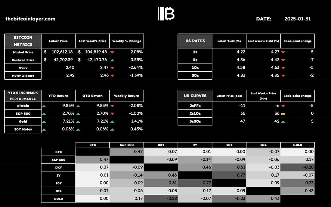 Good morning Readers! With January a wrap, we had to peek at the monthly candles. Bitcoin and the S&P 500 both look strong, so we start there and back into the narratives. This week’s market action did not disappoint, featuring a tech route, AI reexamination, a Fed meeting, tariffs on China, Mexico, and Canada, tariffs proposed for Europe (!!), and a head-spinning number of topics to analyze. In today’s TBL Weekly, we will cover:
