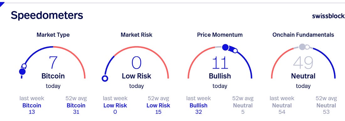 Speedometers indicating the current state of BTC. The full dot represents the current reading and the white dot represents one week ago.