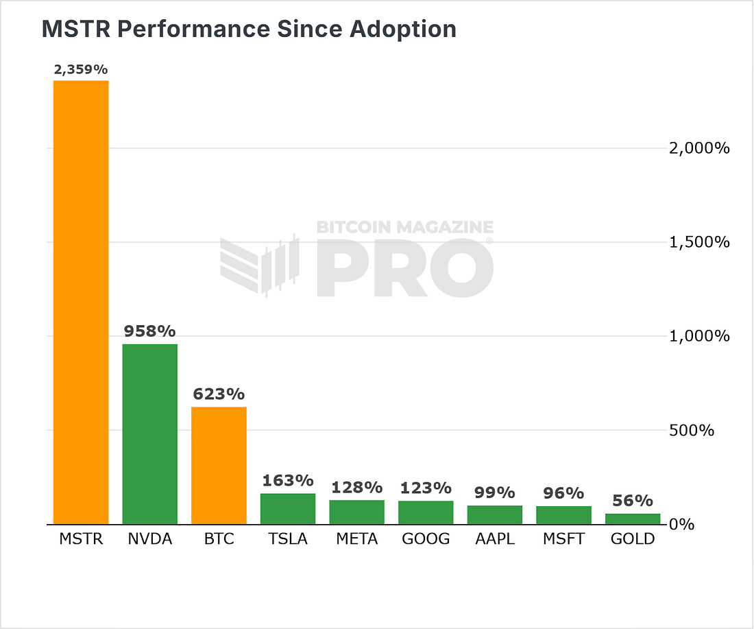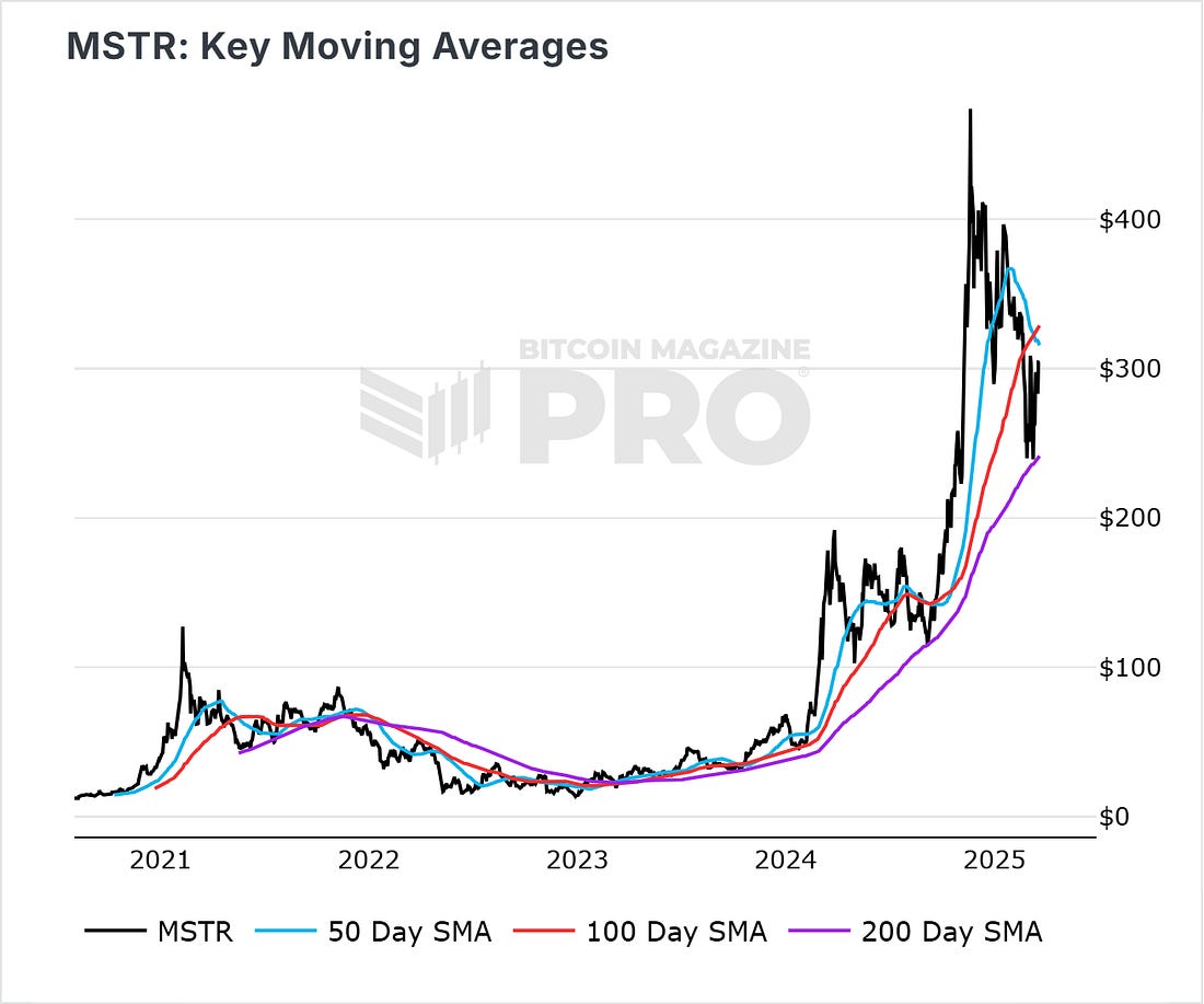 Strategy, led by Michael Saylor, announced plans to raise approximately $711 million through a Series A Perpetual Strife Preferred Stock (STRF) offering. Proceeds will primarily fund additional Bitcoin purchases, pushing the company’s holdings beyond 500,000 BTC. It currently holds 499,226 BTC. Figure 4: (Micro)Strategy Holdings, Stock performance, Price, and % of supply. Strong investor interest prompted an increase in the offering from 5 million to 8.5 million shares, priced at $85 each. The preferred shares carry a 10% annual cumulative dividend based on a $100 per share value. The shares carry a $100 liquidation preference, adjusted daily based on market factors. Strategy can redeem all shares if outstanding shares fall below 25% of the initial issue or in certain tax events. Shareholders may also request repurchase if a significant corporate change occurs. This offering is part of Strategy’s 21/21 plan—a $42 billion initiative split evenly between equity and debt—to aggressively grow its Bitcoin reserves. The company, which now holds around 246,000 BTC, has already made significant progress toward that target. Funded by convertible notes and other instruments, Strategy’s Bitcoin holdings currently represent 2.38% of the total supply, reinforcing its position as the leading institutional holder of bitcoin. As a result of its Bitcoin Treasury strategy, the company has continued to significantly outperform other major stocks, as well as Bitcoin since it’s adoption of the strategy: Figure 5: $MSTR stock outperformance since the company's adoption of Bitcoin. You can view our new dashboard on (Micro)Strategy showing key charts and data that (Micro)Strategy uses to report on their KPI performance. Check it out here. Live Chart Review: $MSTR Key Moving AveragesFigure 5: MSTR Key Moving Averages What it is $MSTR share price with key moving averages overlaid: