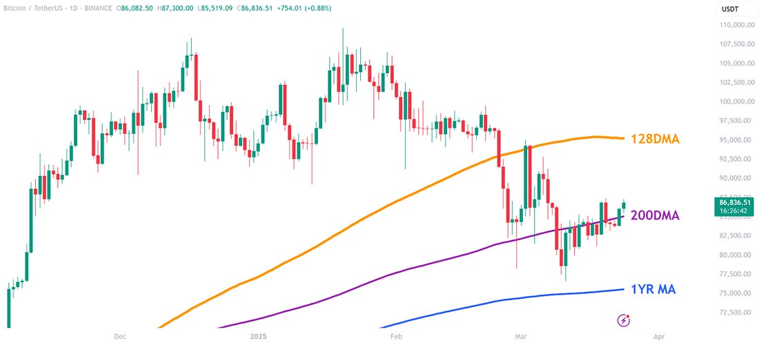 BTC Reclaims 200-Day Moving Average as Saylor’s Strategy Eyes $711M Bitcoin BuyTrump advisor backs gold-to-BTC swap, Pakistan eyes mining, and Metaplanet adds $12.6M in BTC.News HeadlinesPrice Action$BTC has now successfully closed back above its 200-day moving average. It had spent the past two weeks trying to recover from the crash earlier in the month, and has now reclaimed this critical level. The next target is the 128-day-moving average - a key moving average that typically acts as a support level in bull markets. We expect a significant return to confidence once $BTC can reclaim the 128-day moving average. That moving average is currently at $95,000. Figure 1: Bitcoin has now reclaimed its 200-day moving average. $BTC has significant ground to make up though as it remains -14.19% down over the past three months. Figure 2: $BTC has trended down over the past three months. But with evidence that traders have become pessimistic, as shown by the negative funding rates (red bars) on the chart below, we may have reached a local bottom in $BTC price. This has undoubtedly been the case previously this cycle when negative funding rates have appeared and also in prior bull market cycles. Figure 3: Bitcoin Funding Rates turning negative marking local lows. The Big Story: Strategy raises $711M as Saylor Hints at new bitcoin buy Key Highlights: