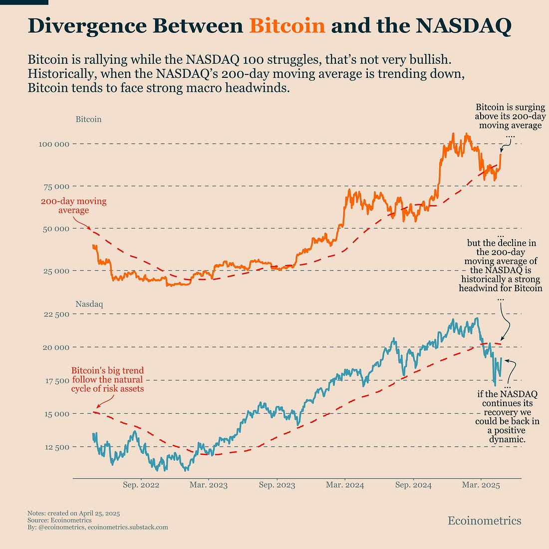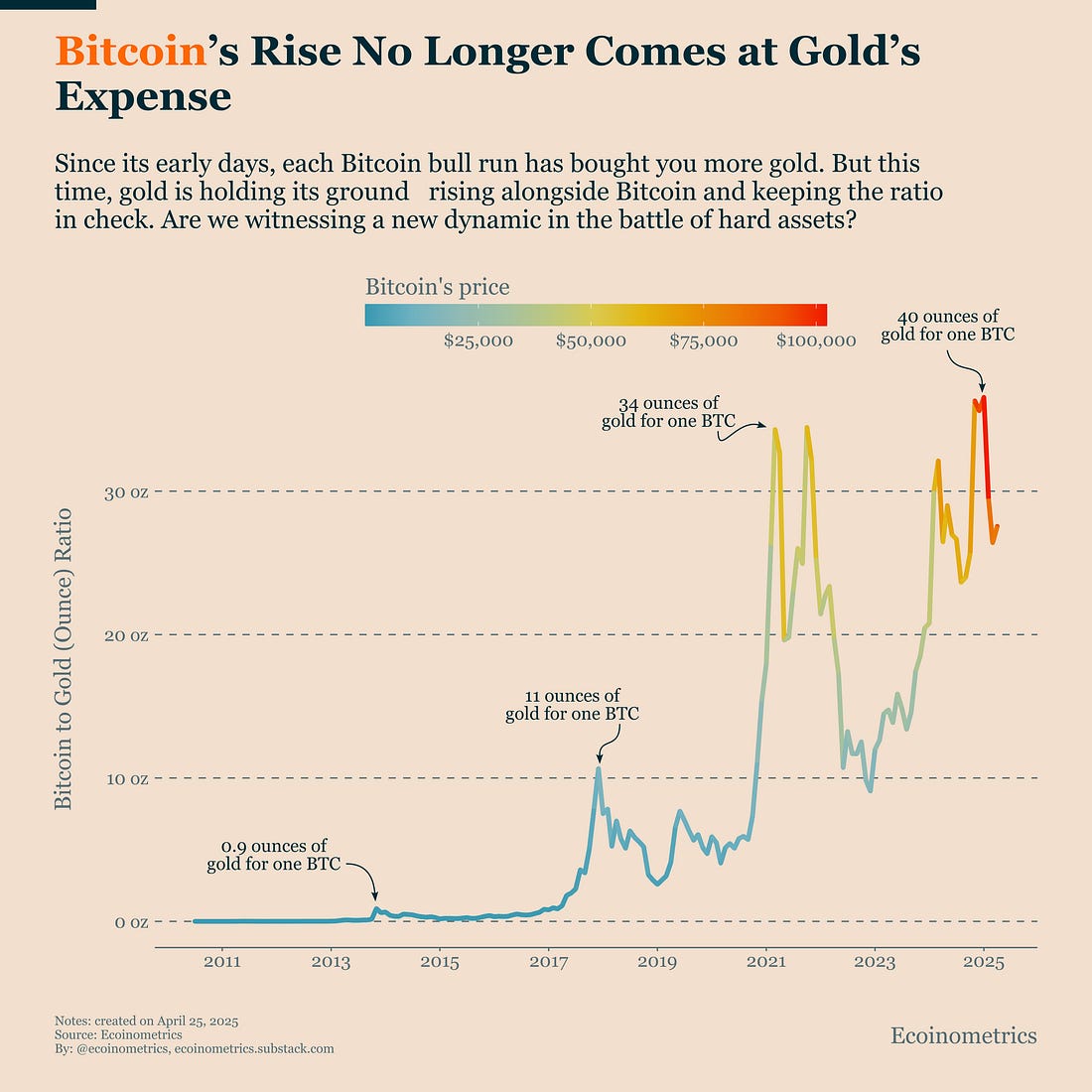 The good news? This week’s softening in trade war rhetoric is also lifting tech stocks. The NASDAQ remains below its 200-DMA, but if the narrative shift holds and no new negative catalysts appear, we could see a quick reversal. For now, we stay cautiously optimistic. Gold Isn’t Backing Down This TimeBitcoin has been gaining steadily against gold over the past decade. In every bull cycle, one Bitcoin has been able to buy significantly more gold than in the previous one. Except this time. Back in 2021, one BTC could buy 34 ounces of gold. At the peak of the current cycle, that number only climbed to 40 ounces. That’s a smaller relative gain than what we’ve seen before, definitely not another 3-10x leap. But this isn’t because Bitcoin has stalled. It’s because gold has been on a strong, consistent uptrend of its own, posting new all-time highs repeatedly. Gold’s strength over the past two years is largely driven by persistent geopolitical risk, rising debt levels, and central bank buying especially from emerging markets looking to de-dollarize. What’s clear is that Bitcoin and gold are now moving on different tracks, reflecting their diverging roles in the current macro environment. Since Trump re-entered the spotlight, markets have rediscovered a need for traditional safe havens. That’s been a major tailwind for gold. You can see it in how gold is trading relative to the dollar and to Bitcoin. Bitcoin, by contrast, still has one foot in the risk asset camp. It’s seen both as a long-term hedge against monetary debasement and as a high-beta growth asset which means it’s still exposed to macro headwinds. Bitcoin continues to face pressure from restrictive monetary policy, tightening liquidity, and regulatory uncertainty. Until those fade or reverse, Bitcoin’s risk-on profile will keep it from behaving like a classic safe haven. That's it for today. Thanks for reading. Cheers, Nick P.S. Every week, our team conducts extensive research analyzing market data, tracking emerging trends, and creating professional-grade charts and analysis. Our mission: Deliver actionable macro and Bitcoin insights that help institutional investors and financial advisors make better-informed decisions. Ready for institutional-grade research that puts you ahead of the market? Click below to access our premium insights. You're currently a free subscriber to Ecoinometrics. For the full experience, upgrade your subscription. |