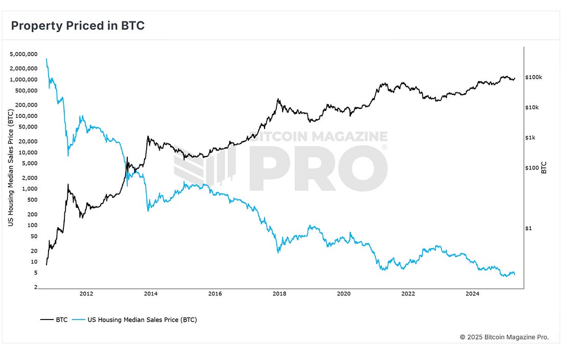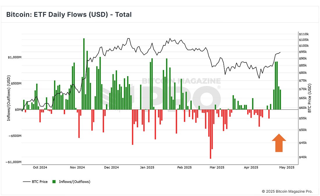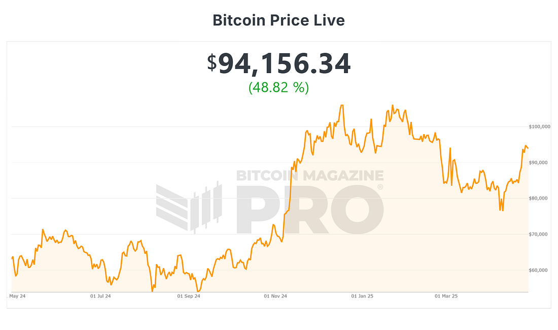 News Headlines Price Action Bitcoin has continued to rally up from the 1-year moving average which we have cited frequently in this newsletter as THE key support level for Bitcoin bull markets. So far so good, that key support level held and BTC bounced hard off it at the start of the month. Not only has BTC since rallied up from that key moving average, over the past week it has also confidently broken above the 200-day moving average. Figure 1: BTC smashed through the 200-day moving average. It is now back in the Q4 2024 - Q1 2025 price range that followed the Bitcoin spot ETF launches. Resistance at the top of the range is $106,000. That will be the next major upside target for BTC. Zooming out, BTC is now up almost 50% over the past 12 months, currently up +48.82%. Figure 2: BTC price action over the past year. The Big Story: From “Digital Curiosity” to Top-Five Heavyweight In the span of 15 years, Bitcoin has moved from an academic oddity to brushing shoulders with century-old giants. When BTC punched through $94K on 23 April last week, Companies MarketCap data showed BTC edging past Alphabet and the total above-ground value of silver, grabbing the #5 slot for largest asset globally. The ascent was powered by a wave of risk-on sentiment after U.S.- China tariff rhetoric cooled and by a weaker dollar index, which fell to two-month lows. While Amazon’s share price rebound has since nudged Bitcoin back to #7 on the leaderboard, the gap is narrow - less than $140B separates BTC from reclaiming fifth spot. Figure 3: Bitcoin ranking 7th in global assets. That volatility underscores how quickly the standings can flip in a market where 1–5% daily moves in these mega-caps are now common. High ETF Demand Bitcoins performance last week was supported by very strong inflows into the spot Bitcoin ETFs. Figure 4: Bitcoin Spot ETF Flows. After weeks of negative outflows, last week saw major inflows as confidence roared back into the market. Just two daily trading sessions saw more than 19,200 BTC of inflows into the ETFs. With all the global macro uncertainty, Bitcoin’s “digital gold” narrative continues to be extremely appealing to institutional investors. Whether Bitcoin can cement a permanent spot in the top five assets list will hinge on sustained institutional flows, macro stability and the pace at which traditional investors embrace Bitcoin in a world awash with fiat liquidity. For now, the message is clear: Bitcoin has earned its seat at the global-asset table, and every bout of volatility is being watched by the largest pool of capital it has ever had. Live Chart Review: Property Priced in BTC Figure 6: US Median House Priced in BTC. What is this chart showing? U.S. Median House Prices valued in Bitcoin over time. Calculated by dividing the U.S. Median House Price by the price of Bitcoin. The result (blue line) shows how many bitcoin are needed at a given moment in time to purchase a house based on the U.S. Median House Price. Latest data Currently only 4.4 BTC is needed to purchase the median house price in the U.S. which stands at $416,900. This is close to an all time low for the number of bitcoin needed. It may not be long before less than 4 BTC is needed. Keep tracking that blue line! Speak again soon, The Bitcoin Magazine Pro Team. Bitcoin Magazine ProFor more detailed Bitcoin analysis and to access advanced features like live charts, personalized indicator alerts, and in-depth industry reports, check out Bitcoin Magazine Pro. Make Smarter Decisions About Bitcoin. Join millions of investors who get clarity about Bitcoin using data analytics you can't get anywhere else. We don't just provide data for data's sake, we provide the metrics and tools that really matter. So you get to supercharge your insights, not your workload. Take the next step in your Bitcoin investing journey: