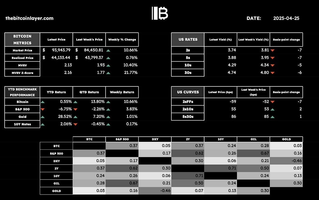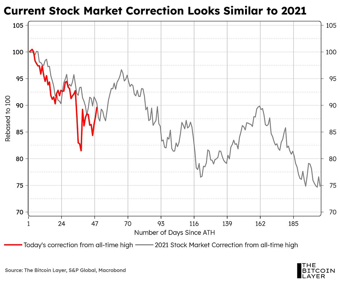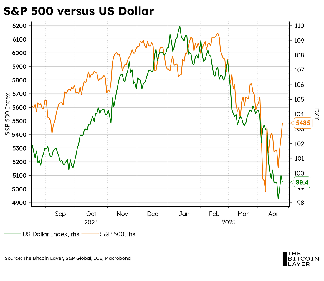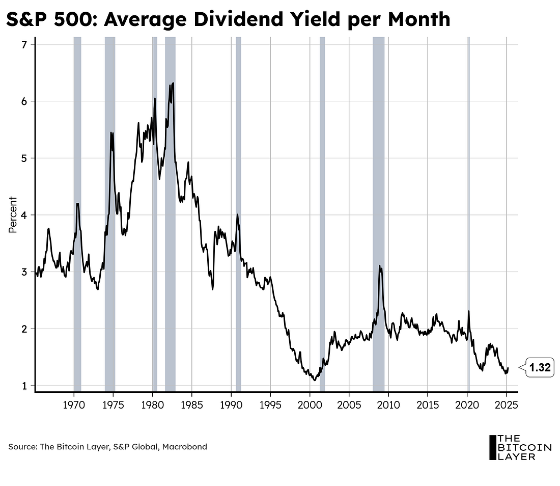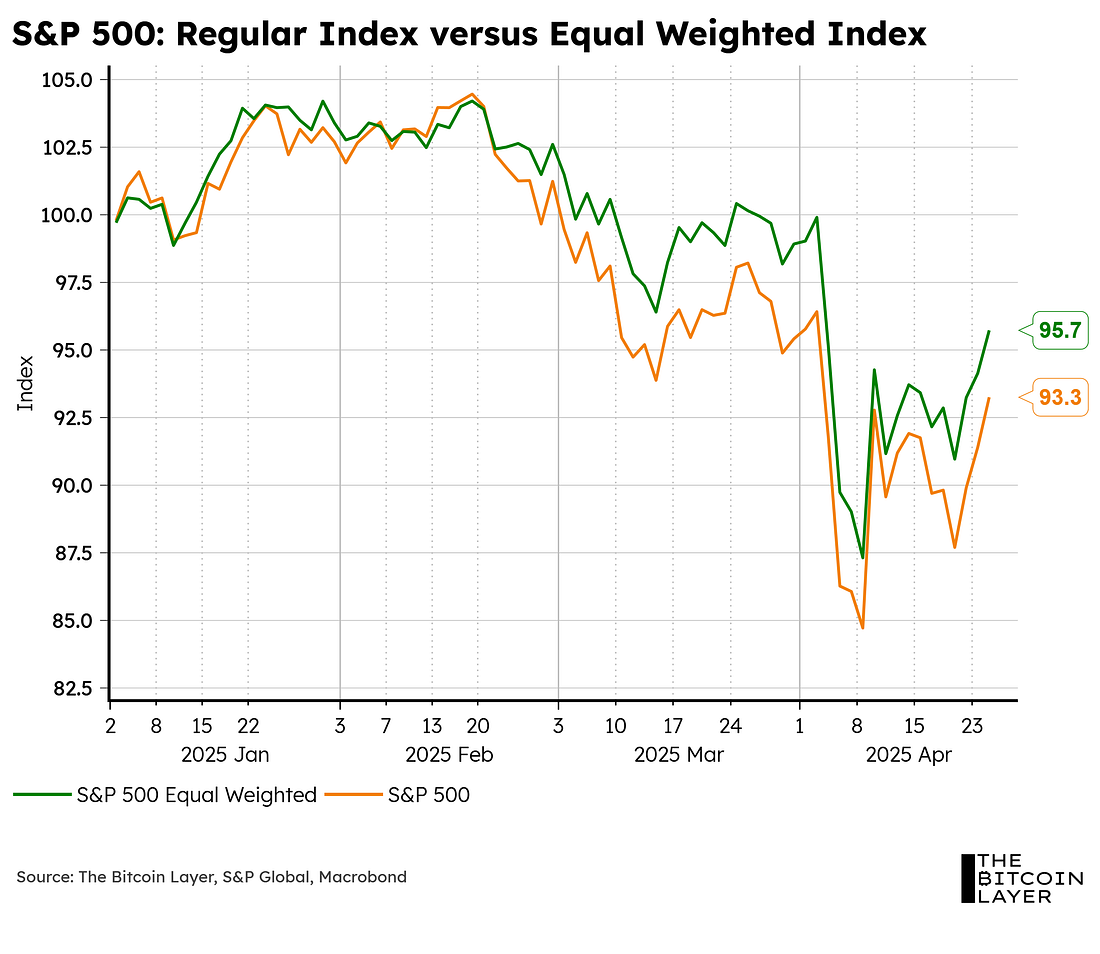 Dear Readers, As we close out the week, some tariff-turmoil relief has been felt across markets as more countries come to the table to negotiate with the US on their Liberation Day tariffs. These levies initially seemed to isolate America from the rest of the world and its closest allies, especially with the overall global reordering strategy still thin on details. However, Treasury Secretary Scott Bessent put it best in his speech at the IIF this week and clarified: “America first does not mean America alone.” Given the specific policy guidance that the Trump administration has taken, as well as some good earnings numbers from Mag-7 companies, the S&P 500 reverted back to a 2021-like path: One thing worth noting here is just how much impact Mag-7 companies have had on the current correction. It is the very performance of these Mag-7 companies that exacerbated the latest market sell-off. When looking at an equally-weighted S&P 500 index, you can see the overall market of stocks outperforming these giants through the turmoil. In fact, the latest dollar sell-off moved almost in tandem with the Mag-7 sell-off; this during a time when US Treasuries were also selling off and gold surged to all-time highs, signaling an escape from American capital markets: This sell-off makes sense as, historically speaking, low dividend yields are associated with economic peaks, and today we stand at one of the lowest levels in history. Low dividend yields are a function of expensive valuations: Some analysts out there are taking the current rebound in stocks as a sign that the worst is behind us. Can this be the case? Can the roaring 2020s continue on? Let’s take a deeper dive into some behavioral finance. Welcome to TBL Weekly #138. Looking for the perfect video to push the smartest person you know from zero to one on bitcoin? Bitcoin, Not Crypto is a three-part master class from Parker Lewis and Dhruv Bansal that cuts through the noise—covering why 21 million was the key technical simplification that made bitcoin possible, why blockchains don’t create decentralization, and why everything else will be built on bitcoin. Our videos are on major podcast platforms—take us with you on the go! Keep up with The Bitcoin Layer by following our social media! ❌ DON’T WRITE YOUR SEED ON PAPER 📝 It’s estimated that ~30% of Bitcoin is lost forever. Poor seed phrase security is a big reason why. This is why we use Stamp Seed, a DIY kit that enables you to hammer your seed words into a durable plate of titanium using professional stamping tools.