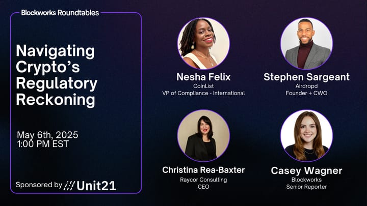 | | As crypto grows up, the heat is rising. | Fraud schemes are getting smarter. Regulators are moving faster. And in 2025, the expectations around crypto compliance are higher than ever. | Join us for a Blockworks Roundtable, sponsored by Unit 21, where some of the sharpest minds in crypto risk and compliance will unpack what's really happening behind the scenes: | Nesha Felix, VP of Compliance - International, CoinList Stephen Sargeant, Founder & CWO, Airdropd Christina Rea-Baxter, CEO, Raycor Consulting Moderated by Casey Wagner, Senior Reporter, Blockworks