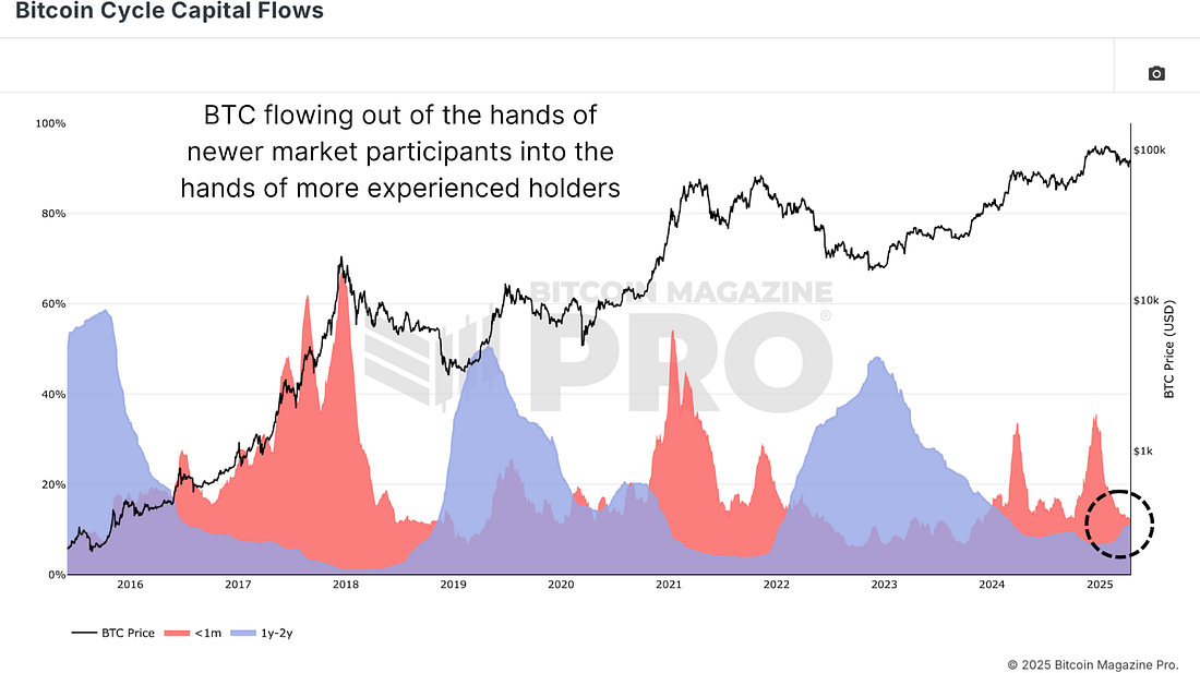 The 2015 and 2018 bear markets lasted approximately 13-14 months. Our most recent bear cycle also lasted 14 months. The recovery phase in past cycles lasted around 23–26 months, and our current cycle sits right in that window. Figure 4: Using previous cycle trends to estimate a potential bull peak. However, this bull phase has been unusual. Instead of an immediate surge after breaking all-time highs, BTC experienced a pullback. This could indicate that we’re simply forming a higher low before entering the steeper portion of the exponential phase. If we split the difference between the 9-month and 11-month exponential phases of past cycles, we’d expect a potential top sometime around September 2025, assuming the bull phase resumes. Macro Risks Despite the encouraging on-chain data, macro headwinds still loom. Analysis of the S&P500 vs Bitcoin Correlation chart illustrates BTC remains heavily correlated to U.S. equities. And with growing concerns around a potential global recession, continued weakness in traditional markets could weigh on BTC’s ability to rally in the near term. Figure 5: Bitcoin’s correlation to U.S equities. Conclusion As we have seen in this analysis, key on-chain metrics, such as MVRV Z-Score, Value Days Destroyed, and Bitcoin Cycle Capital Flows, suggest healthy, cycle-consistent behavior and signs of long-term holder accumulation. There does, however, remain significant macroeconomic uncertainties in the market, and these are key risks to watch. This cycle has been slower and more uneven than past cycles, but it’s not breaking historical structure. If we can avoid further deterioration in traditional markets, BTC appears primed for another leg up, potentially peaking in Q3 or early Q4. For a more in-depth look into this topic, check out a recent YouTube video here: Matt Crosby Lead Analyst - Bitcoin Magazine Pro Bitcoin Magazine ProFor more detailed Bitcoin analysis and to access advanced features like live charts, personalized indicator alerts, and in-depth industry reports, check out Bitcoin Magazine Pro. Make Smarter Decisions About Bitcoin. Join millions of investors who get clarity about Bitcoin using data analytics you can't get anywhere else. We don't just provide data for data's sake, we provide the metrics and tools that really matter. So you get to supercharge your insights, not your workload. Take the next step in your Bitcoin investing journey: