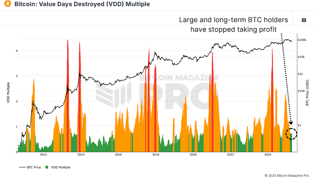 Bitcoin hasn’t had the explosive start to 2025 that many anticipated. After topping out above $100,000, price has retraced sharply, leaving investors and analysts alike questioning where we currently stand in the broader Bitcoin cycle. In this piece, we’ll look past the noise and dig into a range of key on-chain and macro indicators to assess whether BTC’s bull market is still intact or if a deeper correction looms. Healthy Pullback Or Cycle End? A great place to start is the MVRV-Z Score, a long-standing valuation metric that compares market value to realized value. After peaking around 3.36, the MVRV-Z score has since dropped to approximately 1.43, coinciding with BTC’s decline from over $100K to as low as $75K. At first glance, this 30% retracement seems severe. Figure 1: In recent days, the MVRV Z-Score has rebounded from its 2025 low of 1.43. Historically, levels comparable to those we see now on the MVRV-Z score have often marked local bottoms, not tops. Previous cycles, including 2017 and 2021, saw similar pullbacks before price resumed its uptrend. In short, while the move down has shaken investor confidence, it aligns with historical corrections during bull markets. Watching The Smart Money Another key metric is the Value Days Destroyed (VDD) Multiple. This measures the velocity of BTC being moved, weighted by how long the coins were held before transacting. Spikes typically indicate experienced holders taking profit, while low levels suggest accumulation. At present, the metric sits deep in the “green zone,” similar to levels seen during late bear markets or early recovery phases. Given the sharp reversal from above $100K, we may be witnessing the end of a profit-taking wave, with some long-term accumulation, in anticipation of higher prices, beginning to appear again. Figure 2: The current VDD multiple indicates an accumulation phase for long-term holders. One of the most insightful on-chain charts is the Bitcoin Cycle Capital Flows chart, which breaks down realized capital by coin age. It isolates different cohorts, such as new market entrants (<1 month) and mid-term holders (1–2 years), to observe capital migration. The red band (new holders) spiked aggressively near the $106,000 peak, suggesting FOMO-driven buyers piled in near the top. Since then, this group’s activity has cooled significantly, back to levels consistent with early-to-mid bull markets. Conversely, the 1–2 year cohort, typically macro-savvy accumulators, has begun rising again. This inverse correlation is key: long-term holders accumulate at market lows while newer entrants capitulate or exit. These dynamics mirror the accumulation-distribution patterns seen in earlier bull cycles, especially throughout 2020 and 2021. Figure 3: The Bitcoin Cycle Capital Flows chart illustrates BTC flowing back to more experienced holders. Where Are We Now? Zooming out to a macro view, we’ve broken the Bitcoin market cycle into three key phases: