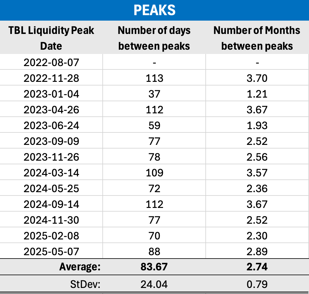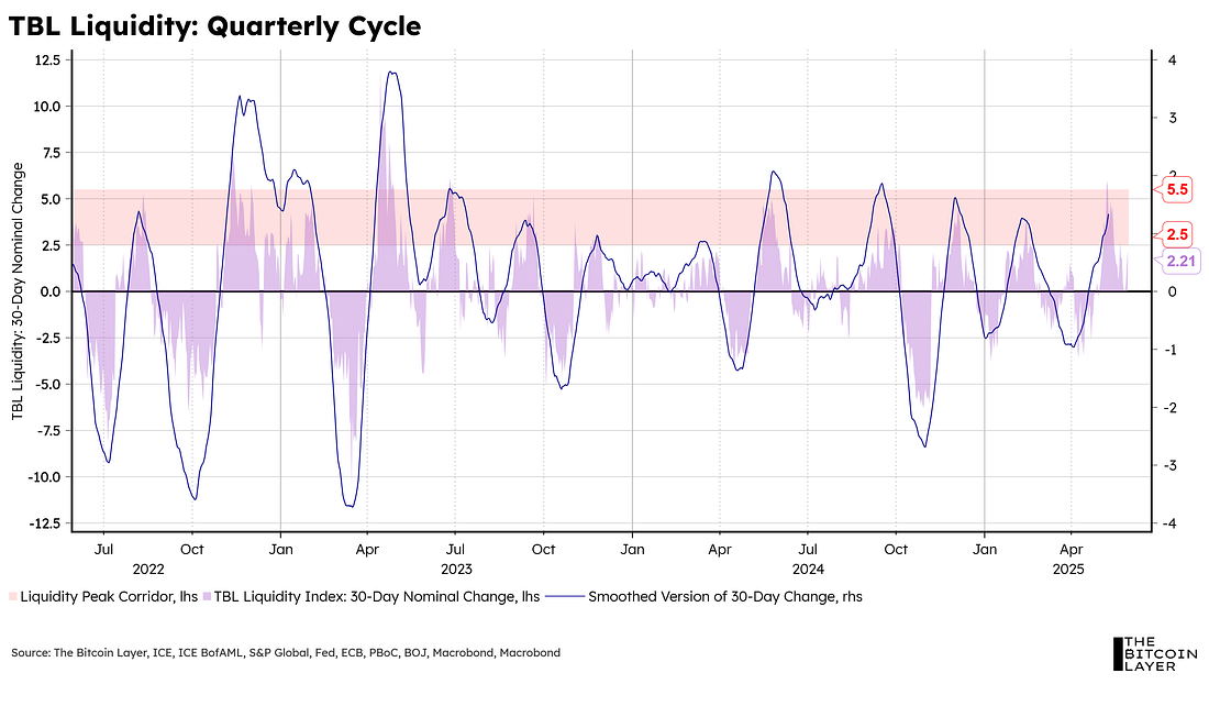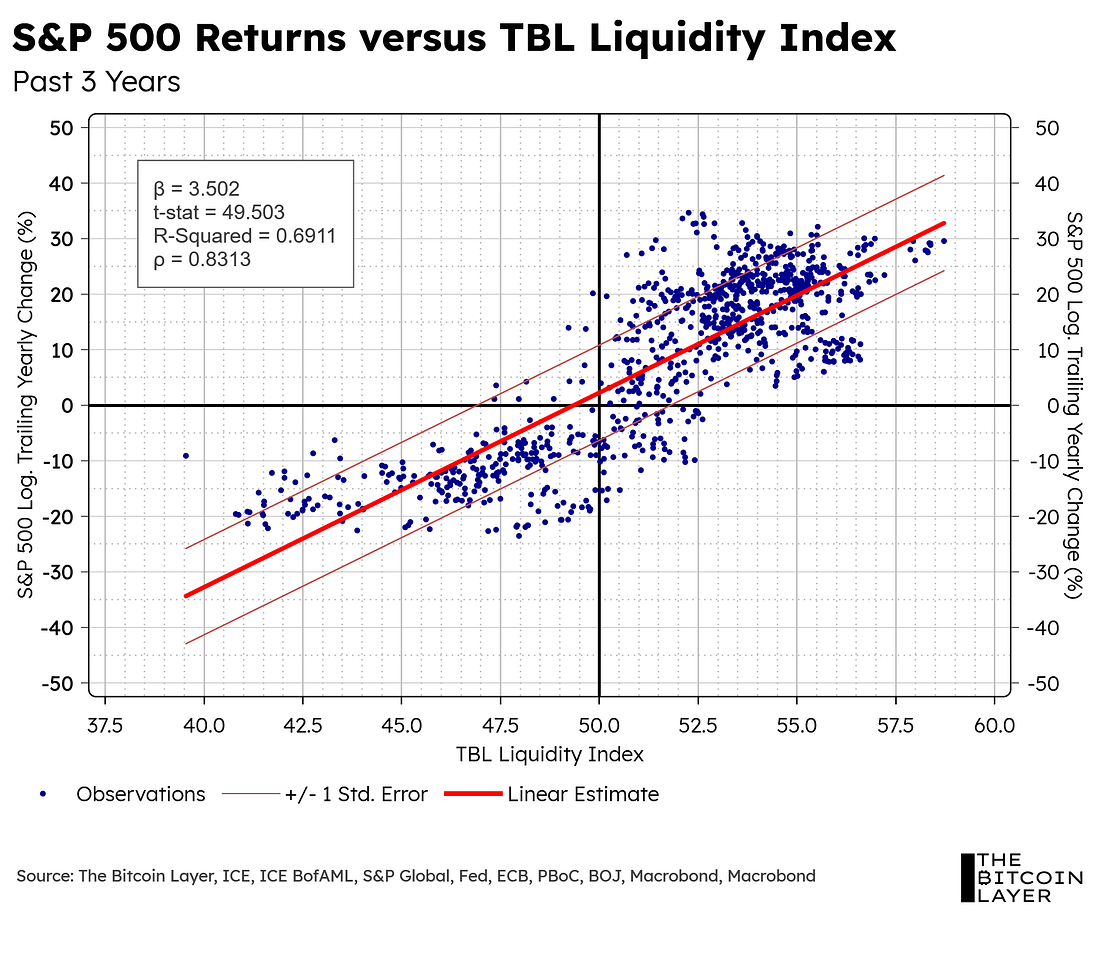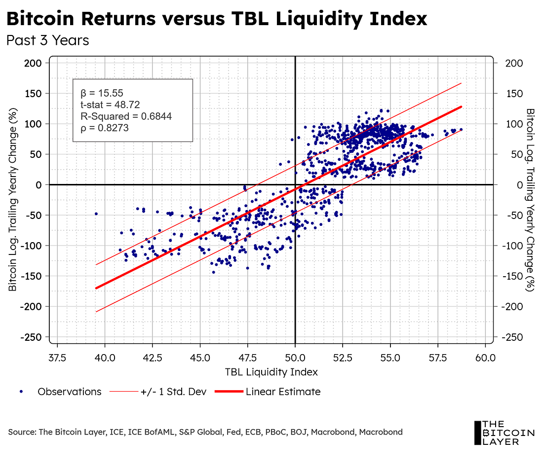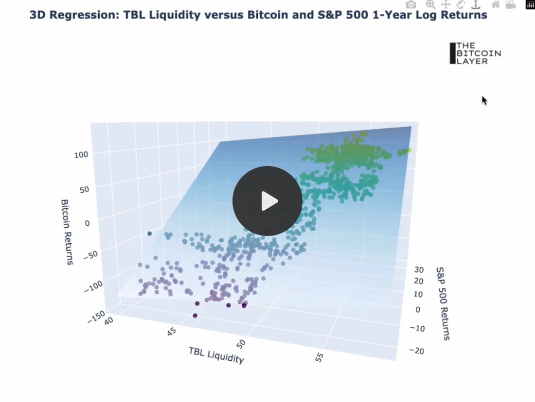 Take 15% off with code: TBL. Our videos are on major podcast platforms—take us with you on the go! Keep up with The Bitcoin Layer by following our social media! Weekly AnalysisTrough-to-Peak Strategy FundamentalsAs many of you know by now, TBL Liquidity has been a project we’ve been developing for the past year, but one that the TBL Research team has been theoretically building for most of our careers. After countless hours in the TBL Liquidity lab, our model has managed to achieve an extremely high correlation with both bitcoin and the stock market. To better visualize this close relationship, below is a 3D regression where you can see that the higher the TBL Liquidity, the higher the returns in both bitcoin and stocks (here for the interactive chart in case you want to play with it yourself): Note that this regression used daily observations from the past three years. When using this timeline, we find an extremely high correlation coefficient between risk assets and TBL Liquidity. Specifically, an 83% correlation with both of them: While having a high correlation is great and all, how can one derive signal from our model? Well, in our most recent Mean Median Mode report, we explored this very question through some observational analysis (but without actually running the numbers). To keep it simple, we have identified a TBL Liquidity Quarterly Cycle. When we plot the 30-day nominal change of our TBL Liquidity index, we find what appears to be a trigonometric function (a wave) with some decent consistencies: Looking at the distances between all peaks, here’s what we found: The average distance between each TBL Liquidity peak is approximately 84 days (or 2.74 months) with a -/+ 1 standard deviation range of 60 to 108 days. Backtesting the TTP StrategyLet us now actually see the results of buying bitcoin or stocks at a TBL Liquidity trough and selling at a peak…... Subscribe to The Bitcoin Layer to unlock the rest.Become a paying subscriber of The Bitcoin Layer to get access to this post and other subscriber-only content. A subscription gets you: