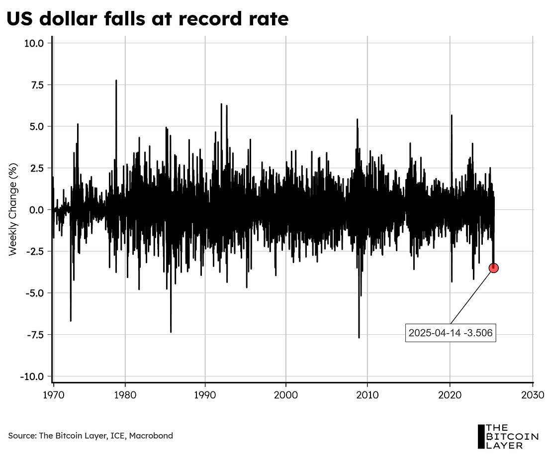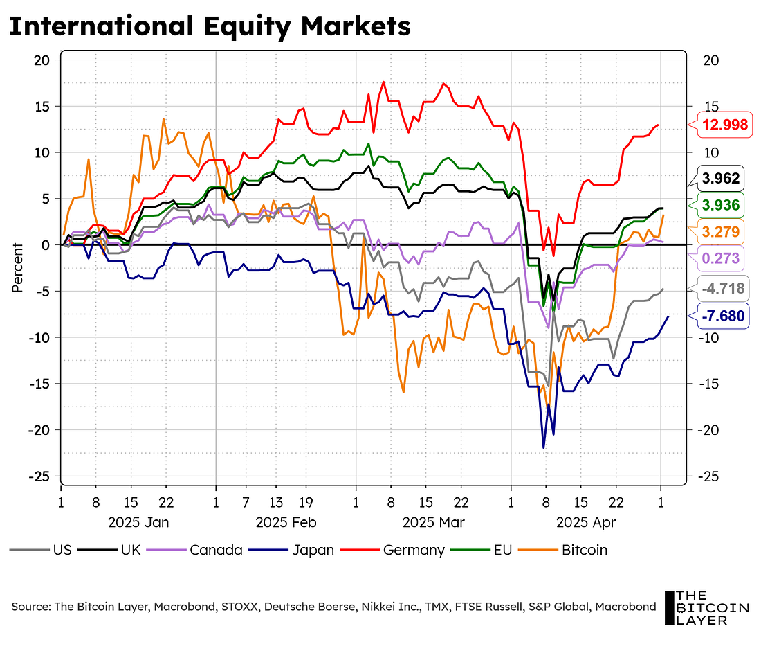 Dear Readers, This past week, we finally got a glimpse at what the US economy is shaping up to look like under this new administration. The American economy contracted during the first quarter of 2025 after 11 consecutive quarters of growth. This momentarily sent risk assets—or, more specifically, the S&P 500 and bitcoin—on a decline before an almost immediate recovery. A recovery that has been well underway since the Trump administration announced a 90-day pause on tariffs after “Liberation Day” put the fear of recession into the bones of market participants across the US. As mentioned in previous editions of TBL Weekly, these recession fears could be the reason investors have moved out of American markets and into foreign markets, which could explain some of the outperformance of equities offshore: …not to mention the recent historical dollar sell-off: So, the question on Wall Street, Main Street, and at the Federal Reserve is whether or not these recessionary fears are justified. We looked under the hood and found some signs of economic resilience in the US, despite the uncertainty currently tormenting markets. Today, we will go over: