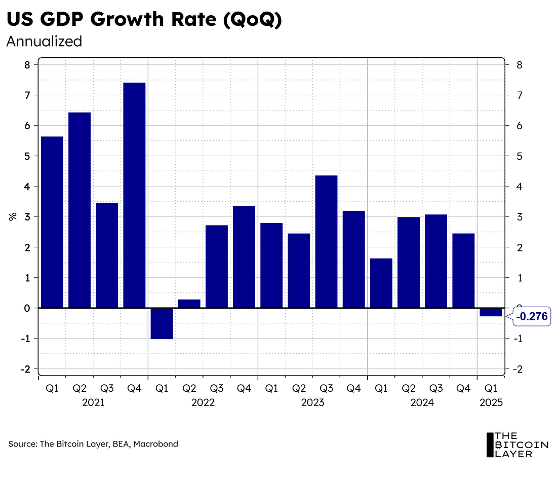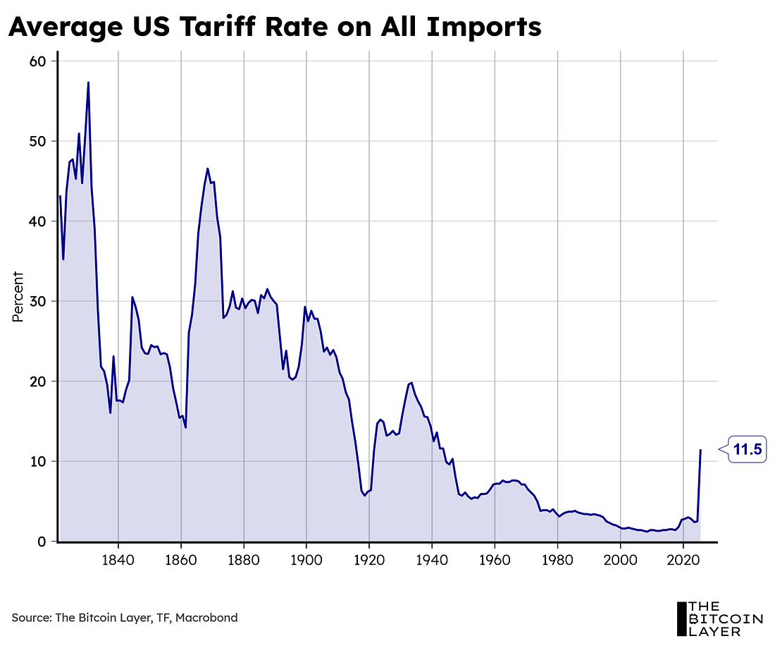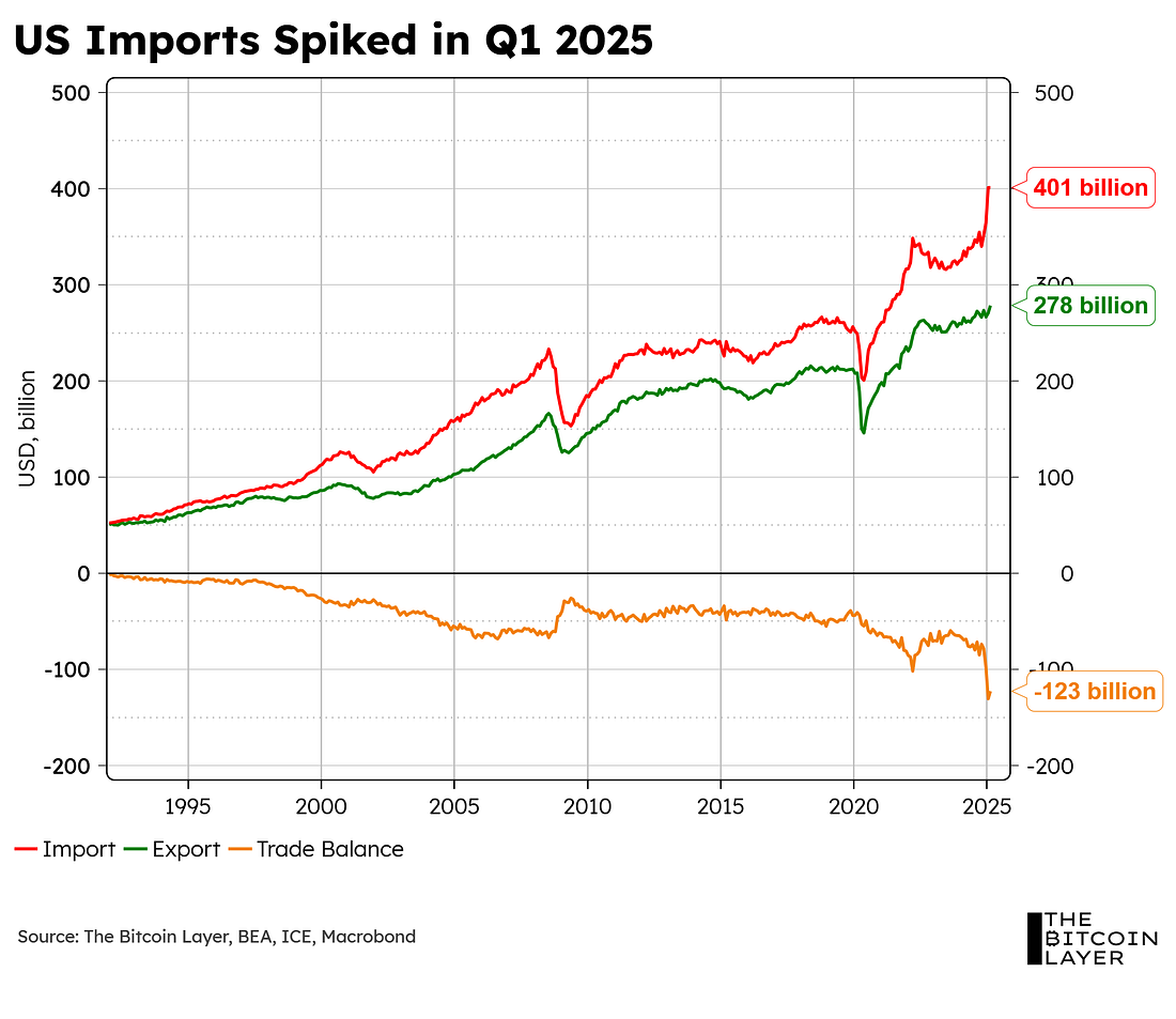 Take 15% off with code TBL. Get your Stamp Seed today! Our videos are on major podcast platforms—take us with you on the go! Keep up with The Bitcoin Layer by following our social media! Weekly AnalysisLooking underneath the surface:As highlighted in last week’s article, we noticed a massive jump in imports during both January and February of this year, at $75B and $66B, respectively. This historical drop in the trade deficit is precisely the reason GDP dragged during this year’s Q1: Not coincidentally, this increase in the trade deficit perfectly aligns with the average US tariff rate on all imports jumping to levels not seen since the 1940s: In short, US importers are wisely front-running uncertainty in the protectionist policies that will follow this 90-day pause. But…where’s the strength we speak of? The US consumer:Let’s start off by looking at a key measure that removes all the noise from international trade:... Subscribe to The Bitcoin Layer to unlock the rest.Become a paying subscriber of The Bitcoin Layer to get access to this post and other subscriber-only content. A subscription gets you: