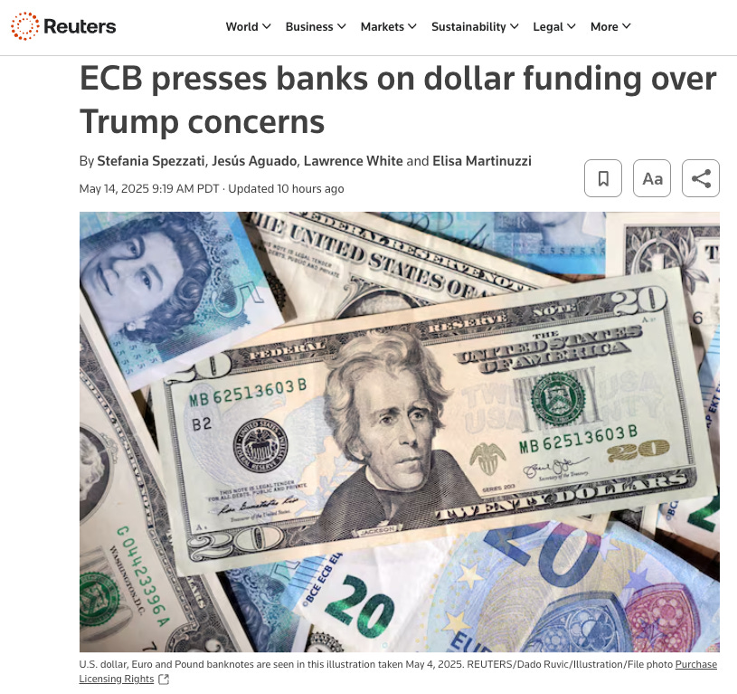 Stop asking how to value bitcoin. Start asking how to value everything else in bitcoin. A new report from Unchained and Strive shows why companies and investors should shift their lens—and start benchmarking performance in bitcoin. The Financial Freedom Report is a weekly newsletter from the Human Rights Foundation (HRF) that tracks how authoritarian regimes weaponize money to control their populations and suppress dissent. It also spotlights how freedom technologies like Bitcoin are helping everyday people reclaim their financial independence and freedom. A one-of-a-kind newsletter connecting the dots between financial repression, geopolitics, and emerging tech. Smart macro analysts don’t just watch the Fed. They watch the world. EuropeThanks to Caitlin Long for flagging this one down as it lines up with one of our major themes—a financial war between the US and Europe, specifically the Eurodollar system. If we are to interpret the White House communications around international economics, the ability for foreign nations to use the dollar system is now considered an “economic good” that must be paid for. Europe is now facing that charge. In an article from Reuters, we learn that the ECB is now putting out a message that dollars might not be available in a crisis. It begins: