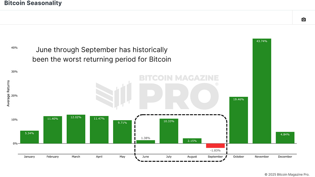 After a turbulent start to 2025, Bitcoin has reignited its upward trajectory, reclaiming six figures and reminding investors why they’ve held through the volatility. But just as the momentum returns, a familiar refrain has surfaced: “Sell in May and go away.” Historically tied to traditional equities, this investing adage is now being echoed within the BTC community as well. But does it hold water in the current market? Let’s dig into the data, across seasonality trends, historical performance, and on-chain indicators to determine whether exiting now is a sound strategy or potentially the biggest missed opportunity of the cycle. Revisiting The “Sell in May and Go Away” ThesisThis investment strategy, borrowed from traditional finance, suggests exiting the market in May and returning in November due to historically weaker summer performance. The Bitcoin Seasonality chart does indeed point to historical lulls in the summer months, especially from June through September. The broader performance picture tells a more nuanced story, particularly for Bitcoin. Figure 1: Historically, summer months have lower average returns. When applied to BTC, this strategy hinges on specific years, namely 2014, 2018, and 2022, where Bitcoin experienced deep, extended bear markets. During those years, the summer months were unequivocally poor for returns. But what if we remove those bear years from the dataset? Excluding Bear MarketsWhen the bear market years are excluded, the performance of Bitcoin in every single month, including June through September, turns positive on average. Even September, historically Bitcoin’s worst month, becomes modestly profitable at +0.37%. October alone boasts a strong average return of 26%, historically making it one of Bitcoin’s best-performing months. Figure 2: Excluding bear market years, the average returns for every month are positive. This reversal completely undermines the argument for exiting during the summer. The thesis only appears sound when skewed by deep bear cycles. In bull or neutral years, summer holds significant upside potential. The Real Cost Of Exiting In MayThe compounded returns analysis illustrates this point vividly. Using historical month-on-month performance, if you had invested $100 in 2012 and held through each month, including summer, you’d now have over $2 billion in compounded gains. Figure 3: In terms of compounded returns, an “Exiting in May” strategy underperforms. But what if you exited in May each year, avoiding June through October? Your ending capital would be just $112 million, nearly 18x lower. Even if you excluded only June through September and returned in October, returns would still fall drastically to $536 million, just around a quarter of the full-hold gains. Missing the summer means missing the exponential nature of Bitcoin compounding. Is This Summer Different?Looking at on-chain metrics, especially the MVRV Z-Score, Bitcoin remains structurally healthy and not even close to typical cycle peak levels. The current market setup shows that Bitcoin still has considerable upside room remaining, and if the cycle’s timing mirrors previous bull runs, the actual top may not arrive until October or beyond. Figure 4: Bitcoin’s current MVRV Z-Score suggests this cycle is far from its peak. Abandoning a position now, in anticipation of “typical” seasonal weakness, would not only clash with the data but may leave investors sidelined during what could be the most explosive phase of the 2025 cycle. ConclusionAlthough seasonality patterns shouldn’t be ignored outright, they must be contextualized, especially in a macro-driven asset like BTC. Bull cycles, liquidity flows, global economic conditions, and investor behavior matter far more than what month is on the calendar. Bitcoin’s cycles are primarily supply-and-demand driven, and right now, this summer could very well mark a euphoric period for Bitcoin, with historical patterns, momentum, and structural market dynamics aligning toward strong upside into Q4 2025. Rather than exiting based on seasonal clichés, investors would be better served by monitoring on-chain and macro indicators and staying focused on long-term positioning. For a more in-depth look into this topic, check out a recent YouTube video here: Bitcoin Summer 2025 - Don't Miss Out Matt Crosby Lead Analyst - Bitcoin Magazine Pro Bitcoin Magazine ProFor more detailed Bitcoin analysis and to access advanced features like live charts, personalized indicator alerts, and in-depth industry reports, check out Bitcoin Magazine Pro. Make Smarter Decisions About Bitcoin. Join millions of investors who get clarity about Bitcoin using data analytics you can't get anywhere else. We don't just provide data for data's sake, we provide the metrics and tools that really matter. So you get to supercharge your insights, not your workload. Take the next step in your Bitcoin investing journey: