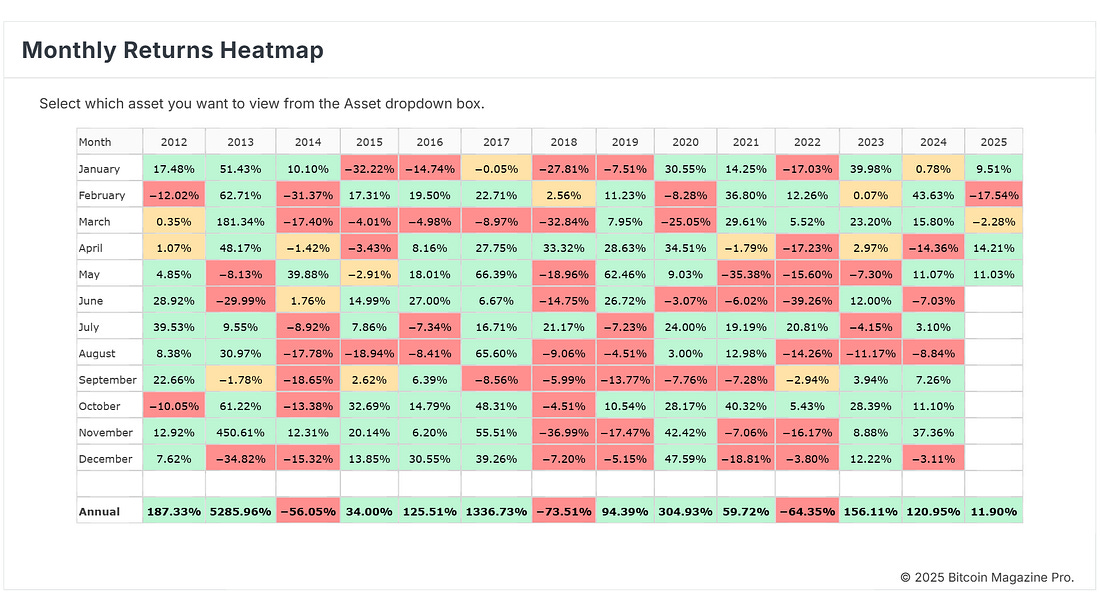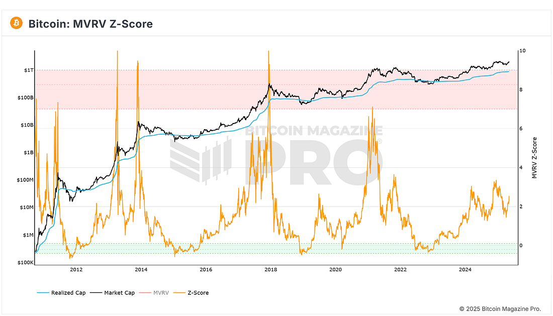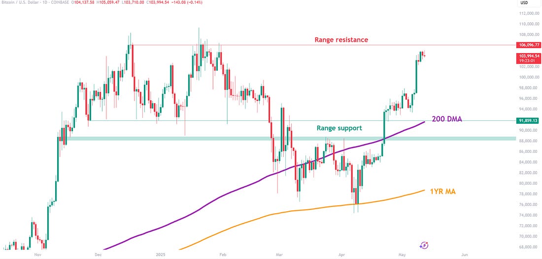 News HeadlinesPrice ActionIt’s been another strong week for BTC, up +10.46% over the past 7 days. Figure 1: BTC steadily climbing higher. There has been a steady persistent bid on the asset that has seen it sail past the psychological number of $100,000 once again. It has quickly reached the area of resistance we have been discussing in this newsletter in recent weeks. It may need some time to break through and we note that there has been a brief pause over the weekend. However, we do expect BTC to break through and make new all-time-highs in the near future. Figure 2: BTC now up at range resistance. Both April and so far May are looking to be strong months for Bitcoin this year. BTC is up 11% so far this month and closed out April +14.21%. Figure 3: BTC monthly returns heatmap. The Big Story: BTC Just Getting Started?As BTC breaks back above $100k, we take a quick look at some key long term metrics and share our point of view on the potential for BTC over the coming months. MVRV Z-ScoreA critical chart for identifying the extent to which the market is becoming overheated. The Bitcoin MVRV Z-Score chart measures how far the market value (price) of Bitcoin is from its realized value (average price at which coins last moved), standardized by historical volatility. It is therefore extremely helpful to identify when BTC is approaching potential market tops and bottoms based on extreme deviations from market norms. Figure 4: MVRV Z-Score It currently has a z-score score of just 2.55. In all of Bitcoin’s previous cycles the z-score climbed up to at least +7. This indicates that there is still a long way to go this cycle. Bitcoin Cycle MasterBitcoin Cycle Master is a combination of on-chain metrics including Coin Value Days Destroyed and Terminal Price. It is able to identify where Bitcoin price is valued relatively within its market cycles by using actual network behaviour analysis. It then presents it in an easy-to-understand visual way. It does this by creating a band of value lines on the chart below: