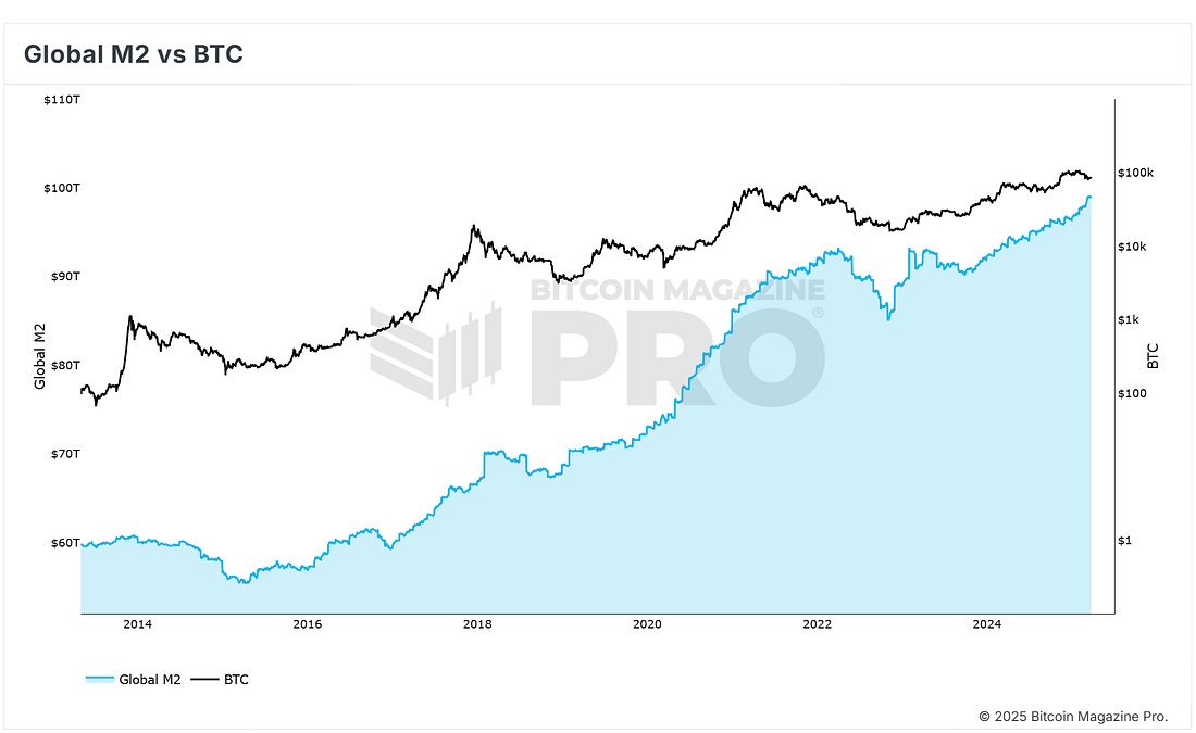 Figure 5: Bitcoin Cycle Master. Currently BTC is sandwiched between the Fair Market Value (purple) and Aggressively Valued (orange) lines. Each previous cycle, BTC has gone on to exceed the red Over-Valued line. There is no guarantee that will happen again this cycle but the Over-Valued line is currently at $214,000 and climbing higher. Global Liquidity (M2)The Global (M2) Liquidity chart shows the change in global money supply from major central banks, alongside the price of $BTC. Historically, Bitcoin bull markets have coincided with the accelerated expansion of global liquidity. More money in the global system can encourage spending on perceived ‘risk assets', especially ‘hard assets’, such as Bitcoin. When Global Liquidity rapidly goes up, eventually so does $BTC. Figure 6: Global Liquidity M2 Latest data shows Global Liquidity rapidly increasing. When this has happened previously it has resulted in sharp acceleration in the price of BTC. Given all other fundamentals also look encouraging for Bitcoin right now, let’s see if this adds further fuel to the fire for BTC. In summary, there are many major indicators for Bitcoin right now that suggest there is significantly more upside to go for BTC this cycle! Speak again soon The Bitcoin Magazine Pro Team. Bitcoin Magazine ProFor more detailed Bitcoin analysis and to access advanced features like live charts, personalized indicator alerts, and in-depth industry reports, check out Bitcoin Magazine Pro. Make Smarter Decisions About Bitcoin. Join millions of investors who get clarity about Bitcoin using data analytics you can't get anywhere else. We don't just provide data for data's sake, we provide the metrics and tools that really matter. So you get to supercharge your insights, not your workload. Take the next step in your Bitcoin investing journey: