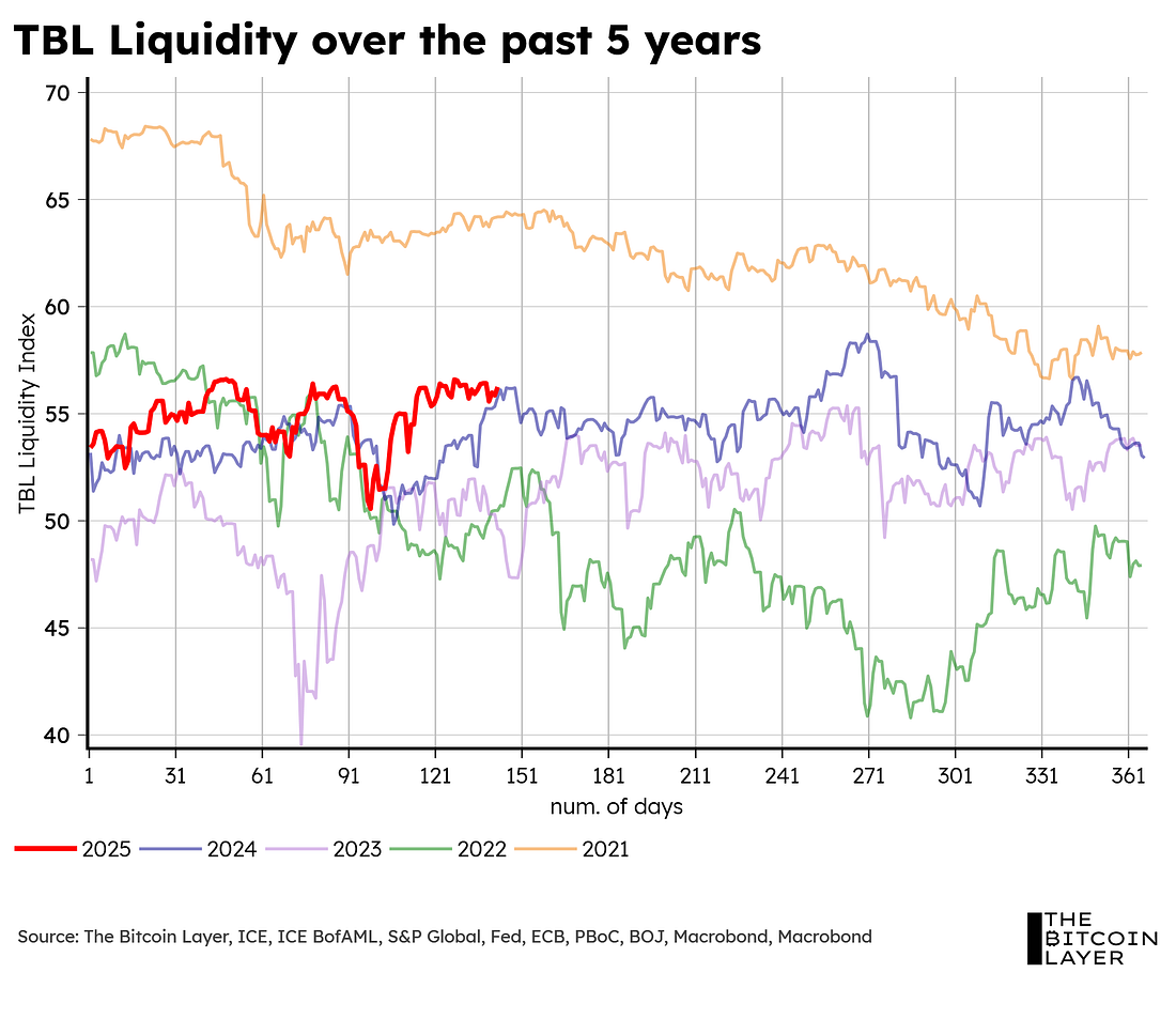 Register for the June 3 event and read the full 100 Days Brief Blockstream Jade Plus is the easiest, most secure way to protect your Bitcoin—perfect for beginners and pros alike. With a sleek design, simple setup, and step-by-step instructions, you'll be securing your Bitcoin in minutes. Seamlessly pair with the Blockstream Green app on mobile or desktop for smooth onboarding. As your stack grows, Jade Plus grows with you—unlock features like the air-gapped JadeLink Storage Device or QR Mode for cable-free transactions using the built-in camera. Want more security? Jade Plus supports multisig wallets with apps like Blockstream Green, Electrum, Sparrow, and Specter. Protect your Bitcoin, sleep better, stack harder. Use code: TBL for 10% off. Our videos are on major podcast platforms—take us with you on the go! Keep up with The Bitcoin Layer by following our social media! Weekly AnalysisTBL Liquidity-Induced TailwindsAs it stands today, TBL Liquidity is at its second-highest yearly level of the past five years: And it’s only the second because 2021 was higher but decreasing: After slicing the past 5 years, we notice two extremely important things that are feeding our overall narrative for risk assets in 2025…... Subscribe to The Bitcoin Layer to unlock the rest.Become a paying subscriber of The Bitcoin Layer to get access to this post and other subscriber-only content. A subscription gets you: