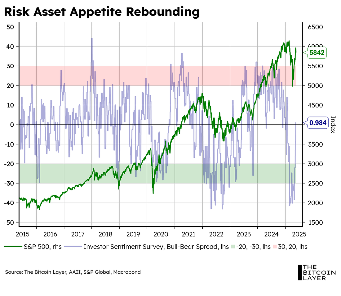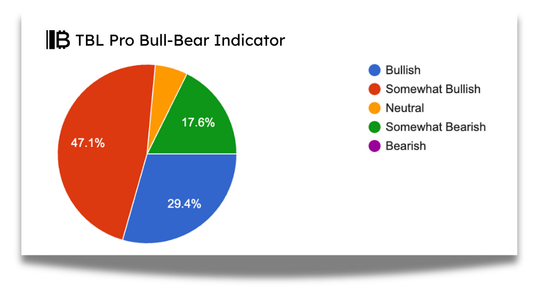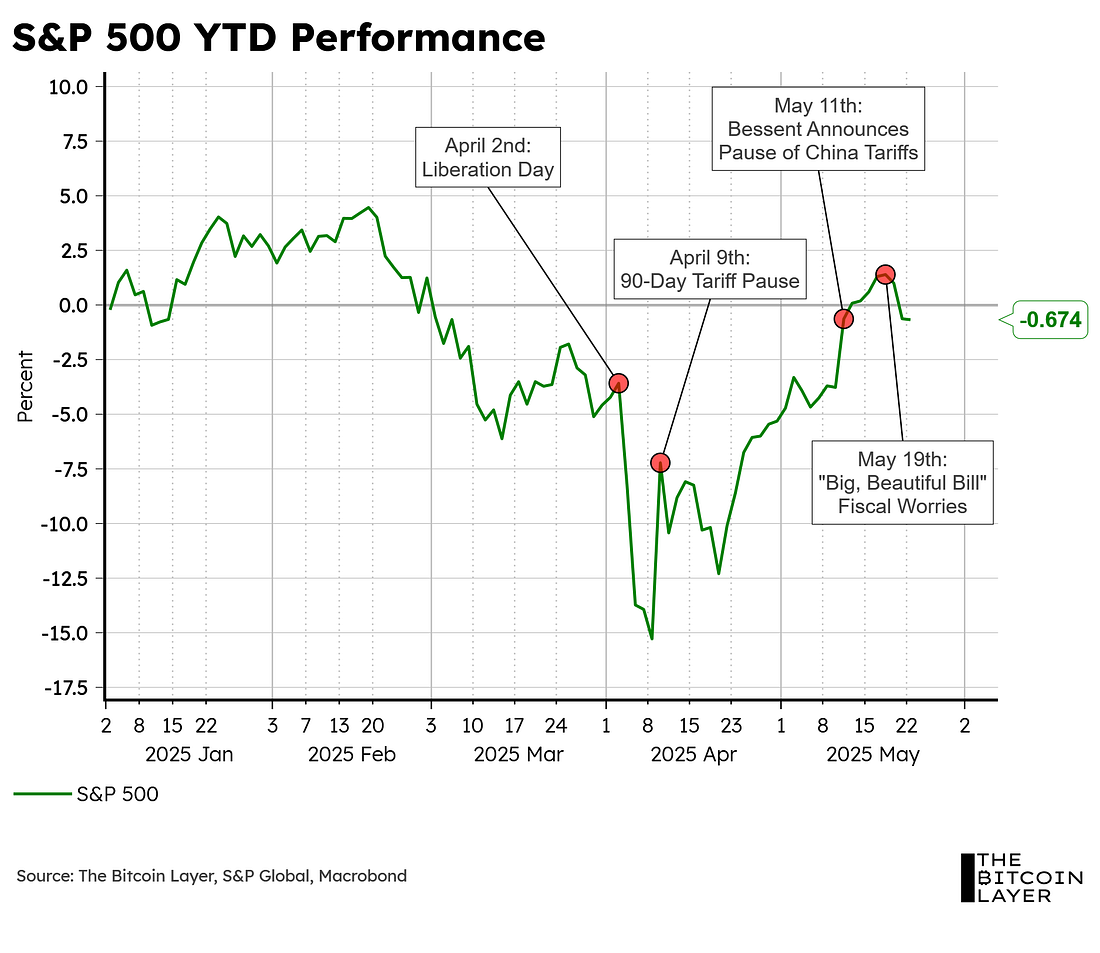Dear Readers, After a remarkable start to May for risk assets all across the board (especially for bitcoin), the bullish pulse of the market is palpable. Here’s a chart of the S&P 500’s performance YTD as we approach the end of the first half of 2025: There are two things worth noting from this chart. Firstly, notice just how sensitive the market has been toward White House announcements, with all major apexes taking place on some type of announcement. Secondly, and perhaps most importantly, the S&P 500 managed to reclaim its positive return stance last week—that was until fiscal worries about Big-Beautiful-Bill-induced deficits started spreading. Bessent came out today and said that “as growth accelerates, [he] is not worried about the US debt dynamics.” The tune has now changed from ‘let’s reduce spending’ to ‘let’s push growth higher.’ Overall, however, risk appetite abounds. Bulls are quite evidently making a comeback. When looking at AAII bull-bear spread (a survey that asks individual investors about their market expectations six months from now), we are seeing bulls rebound. Notice from the chart that, over the past 10 years, a spread between 20 to 30% (red band) has signaled a market peak, and a reading between -20 to -30% (green band) has signaled a bottom. Since the tariff-pause correction, the survey bottomed and is now making its way back to bull territory. Another chart that we would like to show is sourced from you guys directly (go to the bottom of this article to participate in the survey)—something we are coining the TBL Pro Indicator: As you can see from the indicator, the current spread between TBL Pro bulls and bears lies at approximately 58.9% (= % of TBL Pro Bulls – % of TBL Pro Bears). Needless to say, even you guys are bullish on risk assets, and for good reason. In today’s TBL Weekly, we will look at: