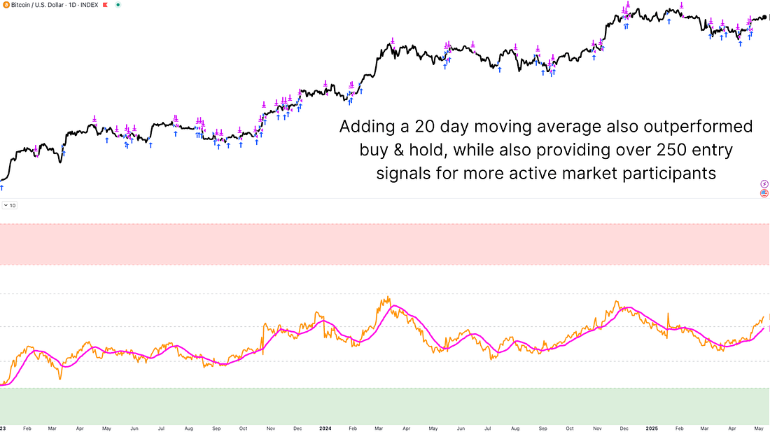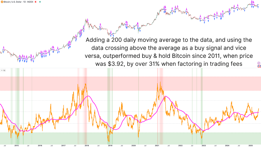 Figure 1: Bringing it altogether in the Everything Indicator. Together, these data points are equal-weighted, not overfitted, creating an aggregate score that tracks broad BTC market dynamics. Importantly, it doesn’t rely on any single model or indicator. Instead, it captures the confluence of multiple domains that collectively shape Bitcoin price movements. Backtesting shows that the indicator consistently highlights macro turning points, including cycle tops and capitulation bottoms, across all major Bitcoin cycles. Infrequent But Strong SignalsWhile accurate, the original Everything Indicator was inherently long-term. Signals would only appear every few years, marking the major inflection points of each bull and bear market. For investors looking to buy generational lows or scale out at macro tops, it was invaluable. Figure 2: The periodic yet historically reliable signals from the Everything Indicator. But for those aiming to be more active, strategically DCA-ing, rotating capital, or even managing risk with mid-cycle exits, it offered little day-to-day guidance. The solution? Increase signal resolution without sacrificing the macro integrity of the model. Adding A Moving AverageThe improvement is elegantly simple: apply a moving average to the Everything Indicator score and look for crossovers. Just as we do with price-based strategies, we can treat the indicator like a signal line and look for directional changes. By default, a 200-period simple moving average was applied. When the Everything Indicator crosses above this MA, it suggests that most components, liquidity, network health, sentiment, and technicals, are trending upward together. These crossovers signal bullish trend initiation, offering earlier entries than waiting for cycle lows alone. Conversely, a cross below the moving average can serve as a de-risking or distribution signal, especially when occurring at or near previously identified overheated zones. Figure 3: Incorporating the 200-day moving average into the Everything Indicator. Even with conservative trading assumptions (increased fees and slippage), this strategy's performance was striking. Backtests from Bitcoin’s early years, when BTC traded under $4, showed this crossover strategy returning over 3.1 million percent, dramatically outperforming simple buy-and-hold. Increased Signal FrequencyTo accommodate more active investors, we can further shorten the moving average, down to 20 periods, for example. This provides hundreds of entry and exit signals per cycle while retaining the original logic of the indicator. Even when using the shorter-term signal, returns remained strong, and outperformance relative to holding BTC remained intact. This shows the tool’s flexibility. It can now serve both long-term investors looking for macro confirmation and active traders who want to respond more dynamically to market changes. Figure 4: Using a 20-day moving average for higher cadence investment strategies. Reducing the moving average period has key benefits, including generating earlier signals at market lows, more frequent accumulation guidance, regular exit prompts during overheated conditions, and increased opportunities to avoid prolonged drawdowns. ConclusionThe Bitcoin Everything Indicator could now offer the best of both worlds: a high-integrity, all-encompassing view of market health, and the flexibility to offer frequent actionable signals through a simple moving average overlay. Even with real-world trading friction, with fees and slippage, this strategy has outperformed holding BTC over multiple timeframes, including from as far back as 2011. So if you’re already using Bitcoin Magazine Pro’s suite of indicators, now might be the time to take this one step further. Add overlays. Adjust moving averages. Layer in bands and filters. The more you adapt these tools to your own strategy, the more powerful and intuitive they can become! For a more in-depth look into this topic, check out a recent YouTube video here: MASSIVE Profits With The Bitcoin EVERYTHING Indicator Matt Crosby Lead Analyst - Bitcoin Magazine Pro Bitcoin Magazine ProFor more detailed Bitcoin analysis and to access advanced features like live charts, personalized indicator alerts, and in-depth industry reports, check out Bitcoin Magazine Pro. Make Smarter Decisions About Bitcoin. Join millions of investors who get clarity about Bitcoin using data analytics you can't get anywhere else. We don't just provide data for data's sake, we provide the metrics and tools that really matter. So you get to supercharge your insights, not your workload. Take the next step in your Bitcoin investing journey: