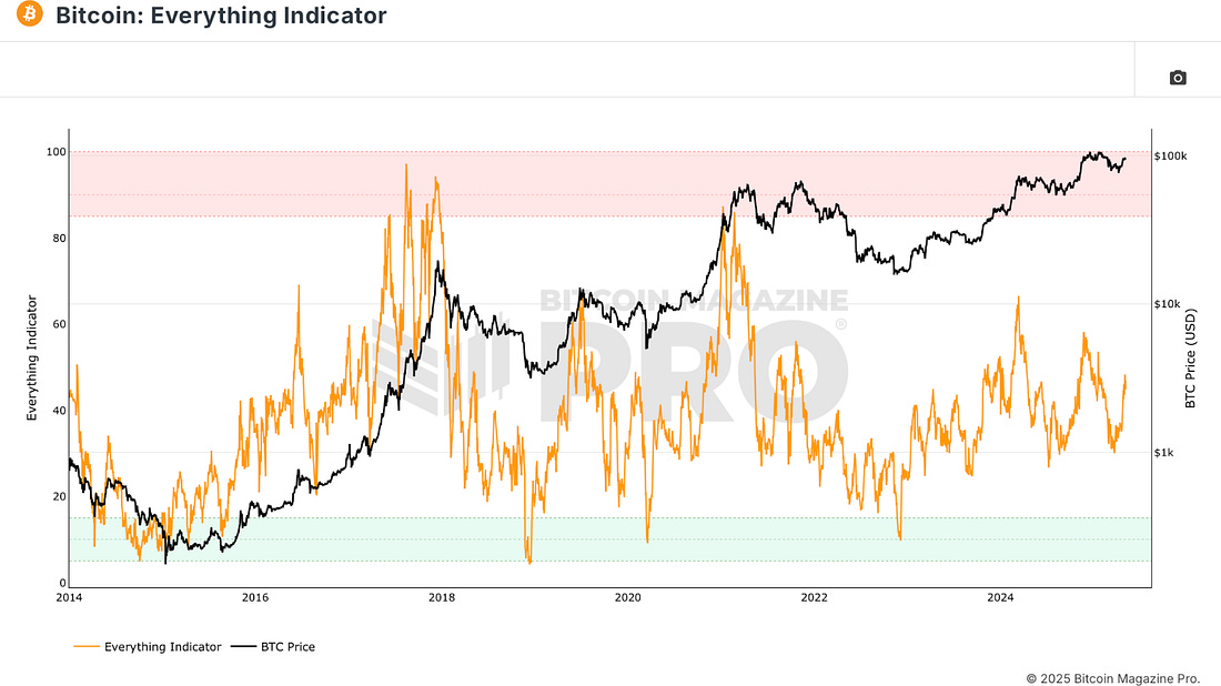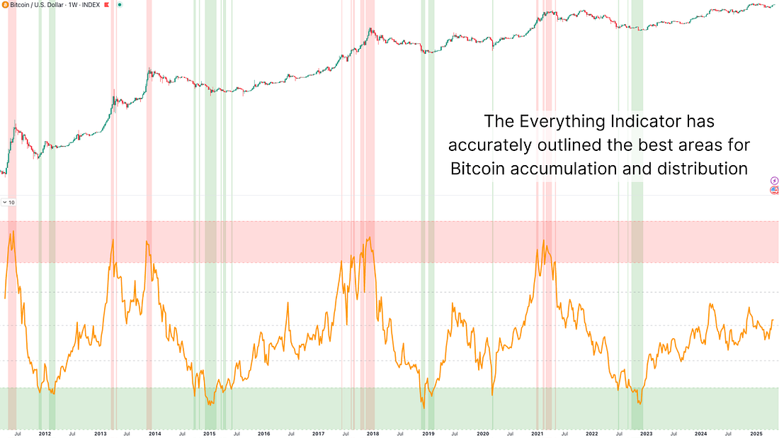 Enhancing One Of Bitcoin’s Most Powerful ToolsSupercharging the Bitcoin Everything Indicator: Unlocking More Frequent, Actionable InsightsThe Bitcoin Everything Indicator was designed to provide a comprehensive view of all major forces impacting BTC price action, on-chain, macro, technical, and fundamental. Since its creation, it has proven remarkably accurate at marking both cycle tops and bottoms. But today, we take it a step further. In this article, we’ll explore how this already-powerful tool can be upgraded with a simple modification to give more frequent, actionable insights, without compromising its core integrity. If you’re looking for a high-signal way to approach the Bitcoin market more actively, this might be the metric you’ve been waiting for. What Is the Bitcoin Everything Indicator?Originally built as a composite tool, the Bitcoin Everything Indicator is constructed from several uncorrelated signals: