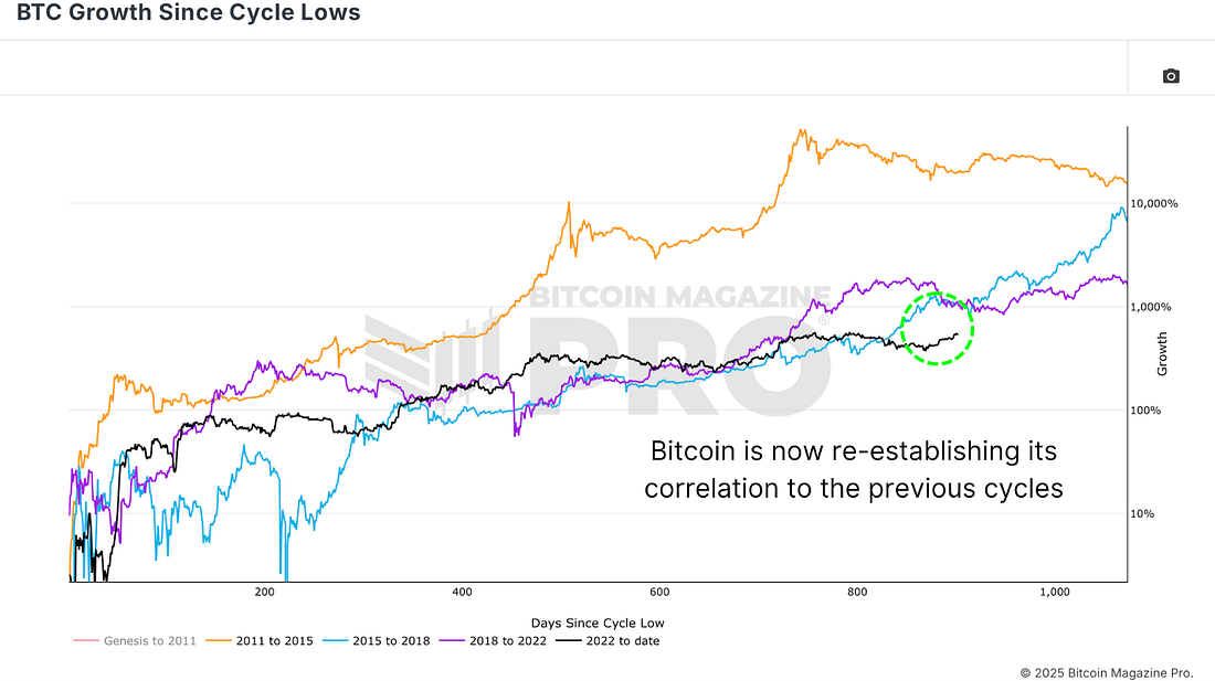Is A Bitcoin Supercycle Now A Realistic Possibility?Bitcoin's bullish surge hints at a supercycle. Is a 2017-style rally possible? Metrics and holder behavior suggest explosive growth.After a volatile and eventful start to the year, Bitcoin is now beginning to show signs of aligning for what could become one of the strongest years in its history. With renewed momentum, recovering sentiment, and key metrics flashing green, the question many are asking is simple: Are we about to witness a repeat of the legendary 2017 bull run? Let’s unpack the data, cycle comparisons, behavioral metrics, and long-term holder behavior to assess the probability of Bitcoin entering its final, euphoric phase of this bull market. How The Current Cycle Stacks UpThe latest leg of bullish price action has reset the narrative. Looking at the BTC Growth Since Cycle Low chart, we can see that despite some macro setbacks and drawdowns, Bitcoin remains closely aligned with the trajectories of the previous two cycles, 2016–2017 and 2020–2021. Figure 1: Recent bullish price action realigns this cycle with the previous two. While some analysts speculate this cycle may stretch longer or offer reduced returns, for the time being, we have to use historical averages as our base case. From a time-horizon perspective, we’re approximately 900 days from the cycle low, comparable to the historical topping range of around 1,100 days. If history holds, we may still have a few hundred days left, with the most explosive gains potentially just around the corner. But aligning timelines is just surface-level. Are investor behaviors and market mechanics actually resembling past cycles? Behavioral Similarities EmergeTo dive deeper into investor psychology, the 2-Year Rolling MVRV-Z Score was introduced, an evolution of the traditional MVRV-Z that accounts for more recent network dynamics. This indicator adapts to lost coins and illiquid supply, growing ETF and institutional holdings, and shifting long-term holder behaviors. Interestingly, the current cycle has already registered a relatively high score (3.39) last year when BTC hit ~$73,000. Since then, retracements have led to declining scores, which is not uncommon during mid-cycle consolidations. Comparatively, the 2017 cycle showed multiple high-score peaks before the final blow-off top. This current pattern, with a large spike followed by choppy retracement, then potential new highs, aligns closely with that historical structure. Figure 2: The 2-Year Rolling MVRV-Z Score reveals similarities between this and the 2017 cycle. Using the Bitcoin Magazine Pro API, a cross-cycle comparative study was conducted using the rolling MVRV-Z and price action. Surprisingly, the 2013 double-peak cycle holds the strongest behavioral correlation at 91.5%, despite being the furthest removed in time. This is significant, as our current cycle already exhibits two major tops, one pre-halving ($74k) and one post-halving ($100k+). Should another all-time high form later this year, we may be witnessing what we may look back on and consider to be Bitcoin’s first-ever triple-peak bull cycle. Figure 3: Cross-cycle behavioral correlations using rolling MVRV-Z scores and price action. Meanwhile, the 2017 cycle shows a respectable 58.6% behavioral correlation, while 2021 remains the least similar in investor behavior terms, though its price action correlation is still in the ~75% range, comparable to the others. Discover how Meanwhile can help you plan for the future—offering life insurance designed to preserve and grow your wealth in Bitcoin. Long-Term Holders Are Still AccumulatingThe 1+ Year HODL Wave illustrates that the percentage of BTC unmoved in a year or more continues to trend upward, even as price rises. That’s rare in bull markets and reflects serious conviction. Figure 4: The rate of change in the 1+ Year HODL Wave suggests long-term holder confidence in future prices. The rate of change in this HODL wave (especially over 30-day periods) has historically identified both major bottoms (when sharply rising) and major tops (when sharply falling), keep in mind the data in the above chart is inverted for visual simplicity! Today, we’re at a neutral inflection point, far from peak distribution, suggesting long-term holders are still confident in substantially higher prices to come. Explosive Potential Or More Consolidation?Could Bitcoin repeat 2017 with a euphoric parabolic rally? Possibly. But it’s more likely this cycle takes on a unique, evolving structure, a blend of historical precedent and modern market dynamics. Figure 5: Expecting a repeat of 2017’s exponential price appreciation is unrealistic. We may be at the doorstep of a third major peak within this cycle, something never seen before. Whether this results in a full supercycle-style melt-up remains to be seen, but structurally, many key metrics suggest BTC is far from topping. Importantly, supply is tight, long-term holders are unshaken, and demand is returning, especially in the form of stablecoin growth, institutional interest, and ETF flows. ConclusionWhile it’s tempting to draw direct lines from 2017 or even 2013 and make bold predictions, we must remember that Bitcoin is no longer a fringe asset. It’s maturing, evolving, and increasingly institutionalized. This naturally alters market behavior, but it doesn’t invalidate explosive growth. At this stage, we can, however, draw upon analysis that supports a structure for sustained future price expansion within the current cycle. Historical cycle correlations remain high, investor behavior is healthy and long-term-focused, technical and behavioral indicators are flashing “room to run”, and there are no major signs of capitulation, profit-taking, or current signs of macro exhaustion. Whether we’re gearing up for a $150k rally or something even larger, the structure is in place. Time will tell if the market delivers on that setup. For a more in-depth look into this 