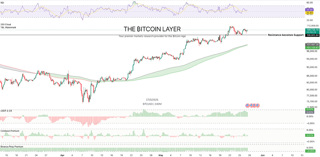 On a lower time frame, the transition of resistance into support becomes clearer. For our Low Time Frame analysis, we use a 4-hour chart as the default setting. You can see the watermark indicating 240 minutes below the date, ensuring transparency in our chart settings. Ideally, we want this support to hold. It wouldn’t be catastrophic if we briefly lost it, as the 200-cloud should offer strong support around the $100,000 level, aligning neatly with this important level. However, we prefer not to see a 3-day candle close below this new support line at approximately $106,800.