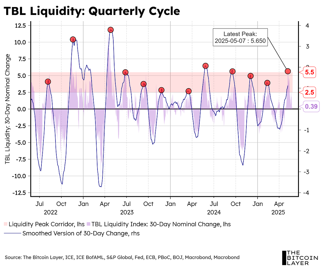 Furthermore, we have also detected a liquidity peak corridor between a 30-day change of 2.5 and 5.5. That is, this newfound quarterly liquidity cycle tends to peak once our TBL Liquidity index has changed by 2.5 - 5.5 nominal points.