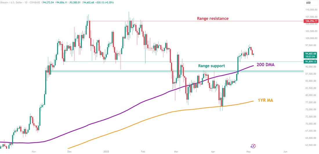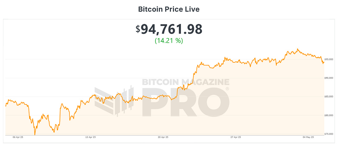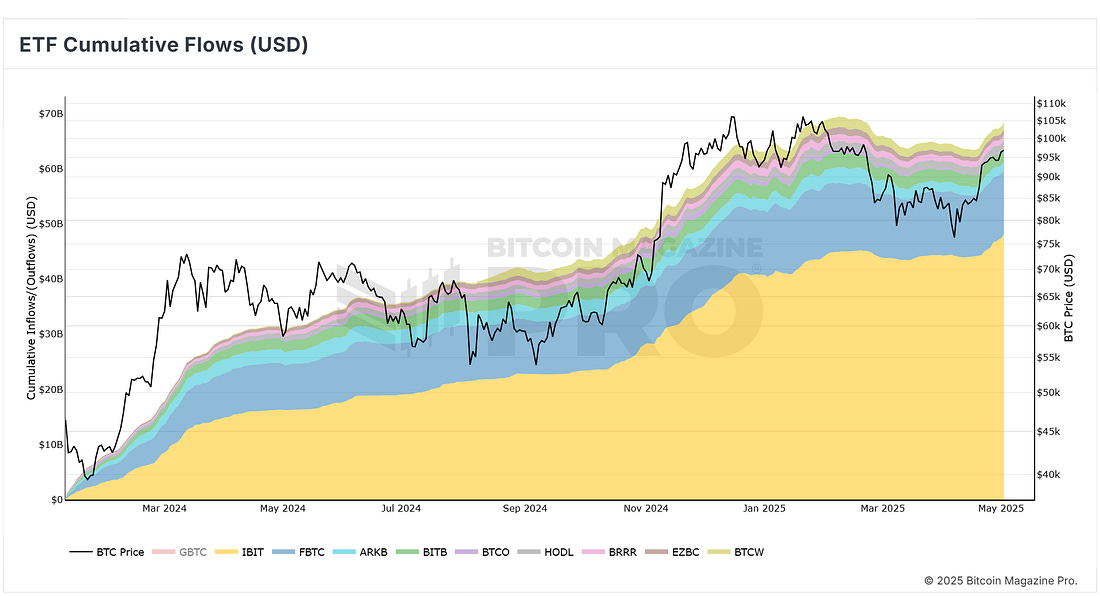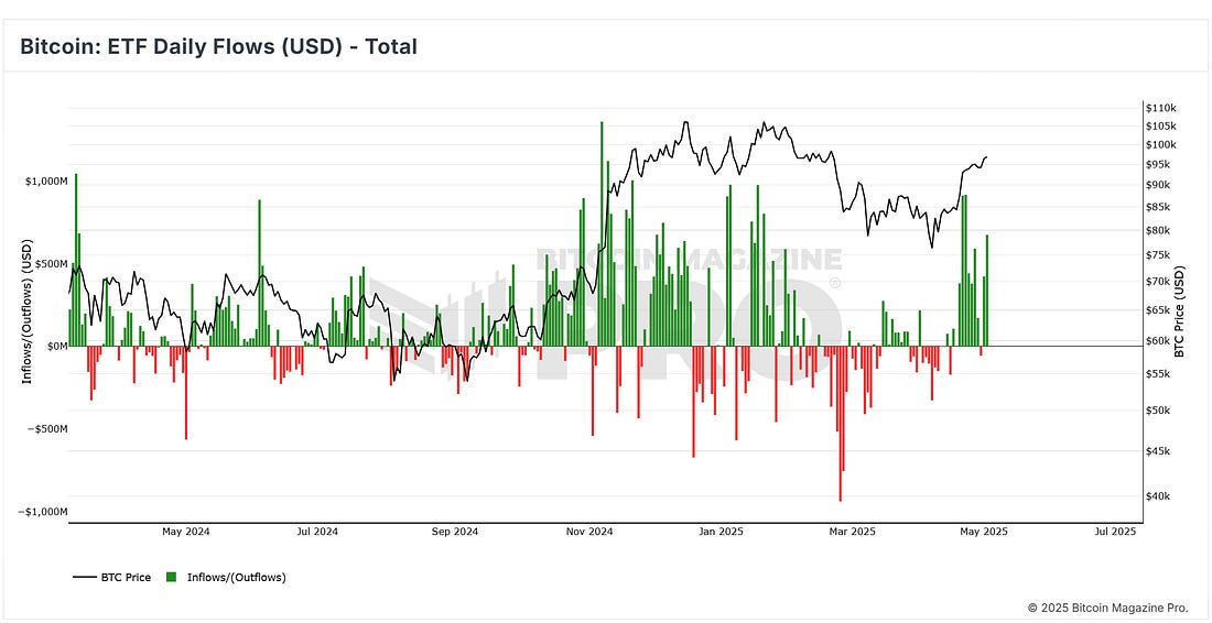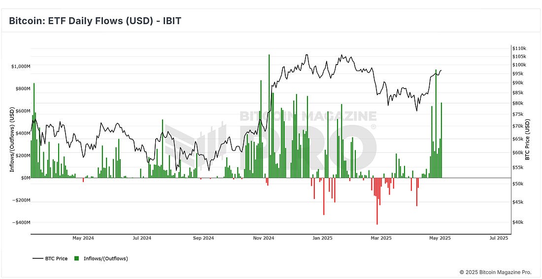 News HeadlinesPrice ActionBTC continues to look strong after accelerating off the 1-year moving average and breaking back above the 200-day moving average. The next noteworthy upside target is the range resistance at $106,000. Figure 1: BTC has broken back into the range. This past month has seen a steady increase of +14.21% as BTC has recovered from global market concerns about Trump tariffs. Figure 2: BTC has recovered well in recent weeks. While sentiment has returned to more neutral levels, there is yet to be a return to confidence. That return to confidence is unlikely to happen until Bitcoin can break back above the psychological number of $100,000. The Big Story: Monster 2-week inflows for Bitcoin ETFsAfter a jittery start to April, when fresh tariff threats from former President Trump cast a shadow over risk assets, capital is now flowing back into spot Bitcoin ETFs in force. The rebound began the week of April 21-25, and by the close of trading on Friday, May 2, the products had absorbed roughly US $4.8 billion in total. Figure 3: Total net inflows into U.S. spot-Bitcoin ETFs BlackRock’s iShares Bitcoin Trust (ticker IBIT) has dominated the flow tables. It collected about US $1.3 billion in the April 21-25 window and an even heftier US $2.48 billion the following week. This means that the IBIT fund alone captured nearly four out of every five dollars that entered the entire ETF complex. Figure 4: Net inflows into iShares Bitcoin Trust (IBIT) This persistent domination by the IBIT BlackRock ETF can be seen by the cumulative flows across the various ETFs over time. The growth is being driven by the BlackRock IBIT ETF shown as the yellow section on the chart below: Figure 5: Cumulative ETF flows over time. April in the greenThe scale and persistence of these ETF allocations helped Bitcoin finish April in the green with a gain of +14.21% despite the tariff-related market angst earlier in the month. Quite a turnaround for Bitcoin. Figure 6: BTC monthly returns heatmap. The renewed ETF demand appears to have cushioned price dips and rekindled risk appetite, positioning Bitcoin to retest year-to-date highs if macro-economic uncertainty can fully subside as we head towards the second half of 2025. Live Chart Review: Bitcoin Cycle MasterFigure 7: Bitcoin Cycle Master What is this chart showing? Bitcoin Cycle Master is a combination of on-chain metrics including Coin Value Days Destroyed and Terminal Price. The metrics that make up Bitcoin Cycle Master track actual economic behavior on the Bitcoin blockchain. They are able to identify where Bitcoin price is valued relatively within its cycles. Historically those cycles have been approximately every 4 years and correlate with Bitcoin Halving events. Bitcoin Cycle Master can identify periods of increased risk when transaction behavior on-chain is indicative of major cycle highs. It also identifies areas of value opportunity where on-chain transaction behavior signals major cycle lows. It does this by creating a band of value lines on the chart: