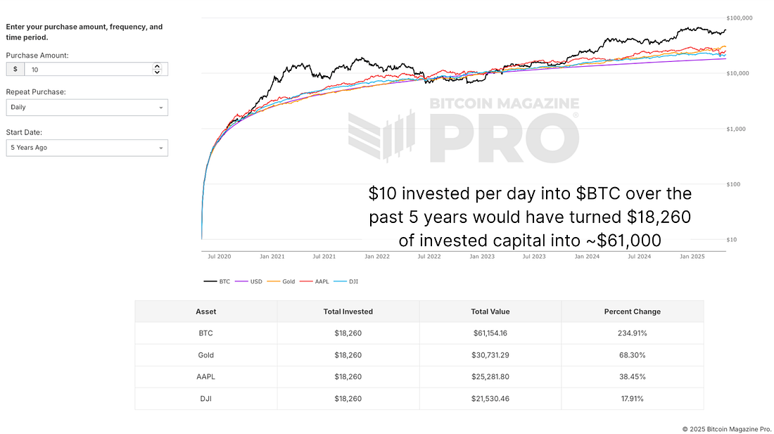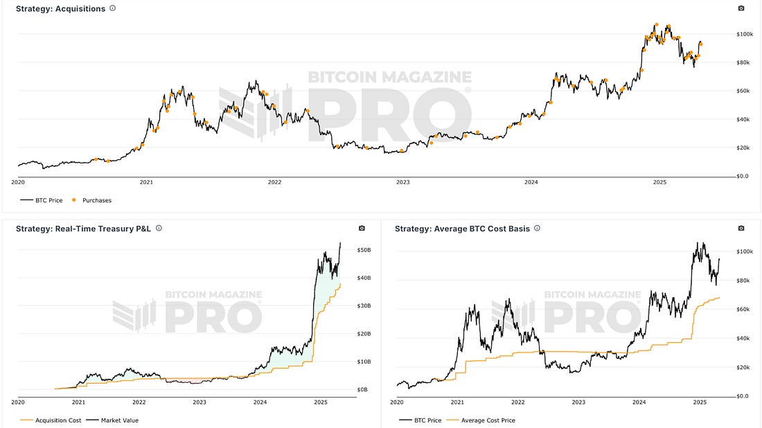 MSTR: A Turning Point For OutperformanceStrategy's massive Bitcoin accumulation and favorable risk/reward profile position it for potential outperformance vs. BTC, as key indicators suggest a critical inflection point.As Bitcoin continues to show signs of sustained strength, it’s worth zooming in on one of the most highly leveraged plays on BTC’s long-term thesis: MicroStrategy, recently rebranded as “Strategy.” In this article, we’ll assess the scale of Strategy’s accumulation, examine its risk/reward profile, and explore whether this equity proxy could be primed for a period of outperformance versus Bitcoin itself. With multiple indicators converging and capital rotation possibly underway, this may be a critical inflection point for investors. Strategy’s Treasury Swells It is clear from our Treasury Company Analytics data that the pace of Bitcoin accumulation by Strategy over recent months has been nothing short of remarkable. Starting the year with approximately 386,700 BTC, the company now holds over 550,000 BTC, a staggering increase that suggests a clear and deliberate strategy to front-run a potential breakout event. Figure 1: Strategy’s Acquisitions, P&L, and Average BTC Cost Basis charts are a selection of the metrics available on Bitcoin Magazine Pro for this company. Led by Michael Saylor, this acquisition campaign has been methodical, with regular weekly purchases that now total billions of dollars in dollar-cost-averaged BTC. The company’s average acquisition cost sits near $68,500, translating to a current mark-to-market profit of close to $15 billion. With their total spend now around $37.9 billion, Strategy has become the largest corporate holder of Bitcoin by a wide margin, positioning themselves not just as a participant in this cycle, but as a defining player. BTC Priced In Strategy Instead of only comparing both assets against the U.S. dollar, a more revealing analysis comes from pricing BTC directly in Strategy stock. This ratio provides insight into which of the two assets is relatively outperforming or lagging. Figure 2: If the BTC/MSTR ratio breaks beneath this key level it may signify a sustained period of Strategy outperformance. Right now, the BTC/MSTR ratio is sitting at a key historical support level, matching the lows set during the 2018–2019 bear market bottom. If this level breaks, it may indicate that Strategy is on the verge of a sustained period of relative strength versus BTC itself. Conversely, a bounce from this support would suggest Bitcoin could resume dominance and offer the better short- to mid-term risk/reward. This chart alone is worth watching closely over the coming weeks. If the ratio confirms a breakdown, we may see significant capital rotation toward Strategy, particularly from institutional allocators seeking exposure to a high-beta BTC proxy with public market access. Mapping Price Targets Although predicting exact outcomes is impossible, we can extrapolate forward from Strategy’s current trajectory and apply plausible Bitcoin cycle assumptions. At their current rate of acquisition, Strategy is on track to end 2025 with between 700,000 and 800,000 BTC. If Bitcoin rallies to $150,000, a commonly projected peak for this cycle, and we apply a net asset value premium of 2.5x to 3x (consistent with historical precedents that reached as high as 3.4x), this would yield a projected share price between $1,200 and $1,600. Figure 3: Projecting potential Strategy share prices. These figures point to a very favorable asymmetric setup, especially compared to Bitcoin itself. Of course, this projection assumes sustained bullish conditions. But even under more conservative scenarios, the math supports the idea that Strategy has a meaningful upside advantage, albeit with more volatility. Strategy As A Bitcoin Proxy To strengthen this case further, we can compare historical dollar-cost averaging performance between BTC and Strategy. Using the Dollar Cost Average Strategies tool, you can see that if you had invested $10 daily into Bitcoin over the past five years, you’d have contributed a total of $18,260, now worth over $61,000. That’s an impressive result, outperforming nearly every other asset class, including Gold, which itself has surged to new all-time highs recently. Figure 4: Through investing $10 each day over the past 5 years, BTC outperforms other key asset classes. The same $10/day strategy applied to Strategy stock since its first BTC purchase in August 2020 would have resulted in an investment of $11,850. That position would now be worth approximately $108,000, significantly outperforming Bitcoin over the same window. This shows that while BTC remains the foundational thesis, Strategy has offered even more upside for investors willing to stomach the volatility. Figure 5: A $10 daily investment in MSTR since August 2020 outperforms BTC over the same period. It’s important to recognize that Strategy is effectively a high-beta instrument tied to Bitcoin. This correlation amplifies gains, but it also amplifies losses. If Bitcoin were to enter a prolonged retracement, say, a 50% to 60% correction, MicroStrategy’s stock could drop by significantly more. This is not simply hypothetical. In prior cycles, MSTR has exhibited extreme swings, both to the upside and the downside. Investors considering it as part of their allocation must be comfortable with higher volatility and the potential for deeper drawdowns during periods of broader BTC weakness. Conclusion So, is Strategy worth considering as part of a diversified crypto-forward investment portfolio? The answer is yes, but with caveats. Given its tightly wound relationship with Bitcoin, Strategy offers enhanced upside potential through leverage, as well as a historically validated return profile that has outpaced BTC itself in recent years. But that comes with the trade-off of greater risk, especially in turbulent markets. The current BTC/MSTR ratio is sitting at a techn
