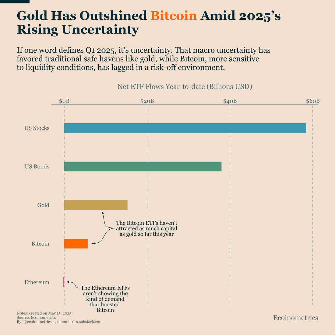 Together, these signals paint a clear picture of the current landscape: macro uncertainty is still driving capital toward traditional safe havens, Bitcoin is holding its ground with improving flows, and Ethereum continues to lag without a compelling narrative. The big question now is whether softening policy signals and stronger risk appetite can push digital assets into a new phase of growth. In case you missed it, here are the other topics we covered this week: Essential Decision-Making Tools Bitcoin Market Monitor - Key Drivers in Five Charts: Bitcoin Market Forecast - Probability Scenarios & Risk Metrics: Get these professional-grade insights delivered to your inbox: Risk-Off Flows Favoured Gold Over Bitcoin in Early 2025Last year, Bitcoin ETFs saw $35 billion in net inflows and bought 500,000 BTC. That surge in capital helped drive a 120% return. So far in 2025, things look very different. Four months in, Bitcoin ETF flows are less than a third of what they were last year. Meanwhile, gold ETFs have pulled in more capital. That shouldn’t come as a surprise. The defining feature of Q1 2025 has been uncertainty, around Fed policy, trade policy, and the broader direction of the US economy. Between two hard assets, gold and Bitcoin, it’s easy to see why capital went to the one seen as a safe haven. And Bitcoin is not a safe haven, it’s a high-beta growth asset. It performs best when liquidity is rising and fiat debasement is in the air. So far this year, we’ve had the opposite. But that may be starting to shift: