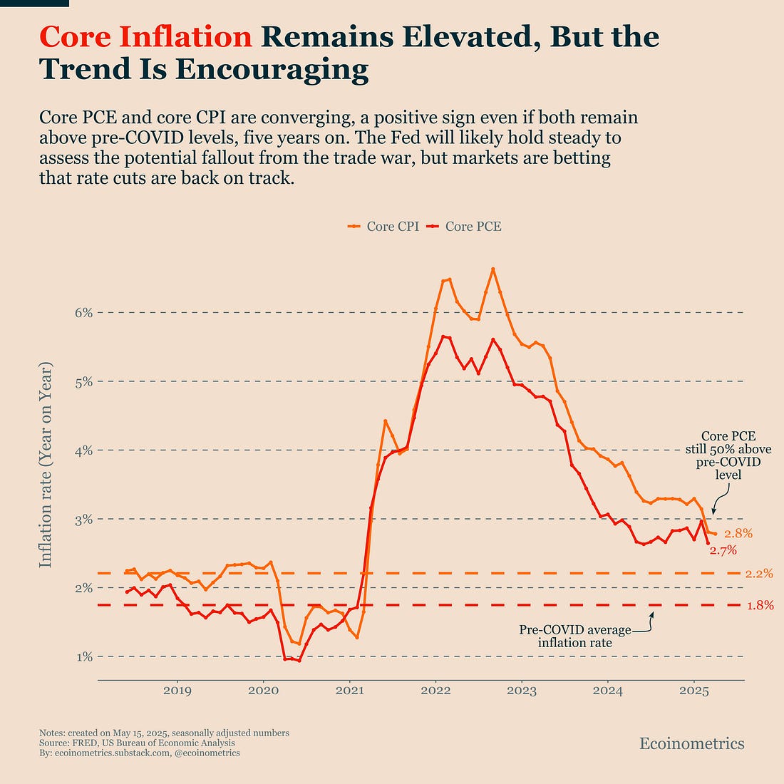 While the gap between the two is narrowing, overall progress on core inflation has stalled. We’ve been stuck in this range for months. So we remain in a fog-of-(trade)-war environment where investors are operating without clear signals. Market direction, in the meantime, is driven by sentiment. And right now sentiment is improving: